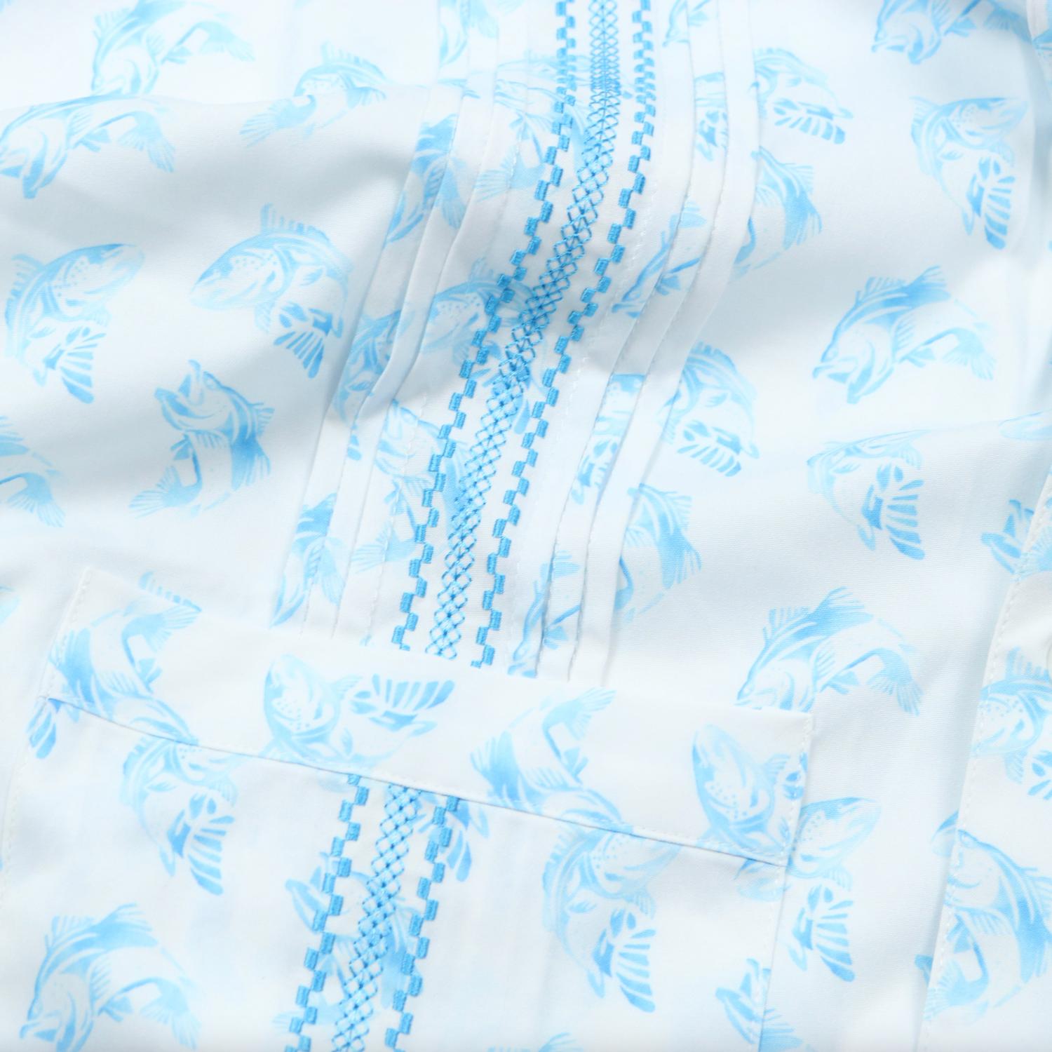Experience the blend of timeless style and high-performance fabric with the Bass Guayabera Short Sleeve Shirt by Blue Quail Clothing Co. Featuring a floral pattern, short sleeves, and a classic collar, this blue shirt is designed for the modern man. Equipped with UPF 50+ protection, quick-drying, stain-resistant, and wrinkle-resistant material, it is both comfortable and functional. Closure: Button closure. Care: Hand wash and lay flat to dry.