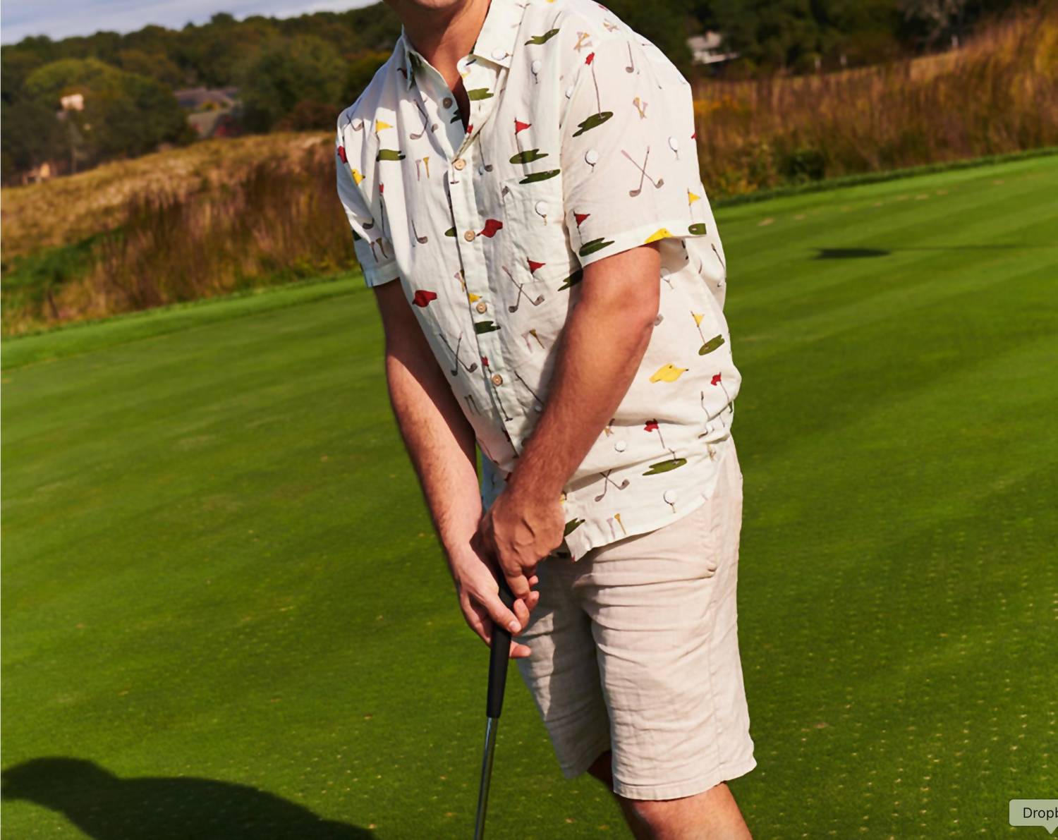 Elevate your game day wardrobe with the Jack Button-down Shirt by PINK CHICKEN, featuring a playful Golf Tournament conversation print. This men's casual shirt comes with short sleeves and a classic collar, ideal for summer outings. Crafted from comfortable cotton, it has faux coconut wood buttons down the front and a handy patterned chest pocket for extra tees. Care is easy with machine wash and tumble dry instructions, making it a practical choice for Father's Day or any athleisure-inspired occasion.