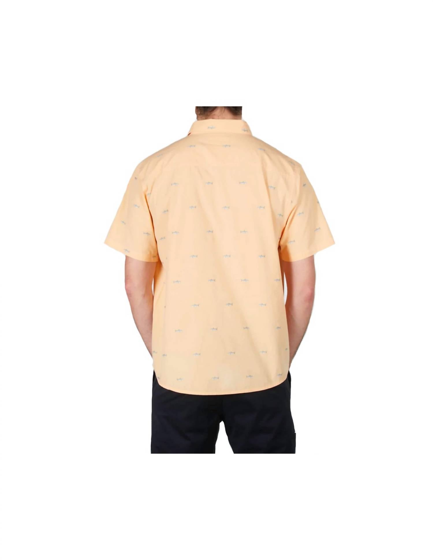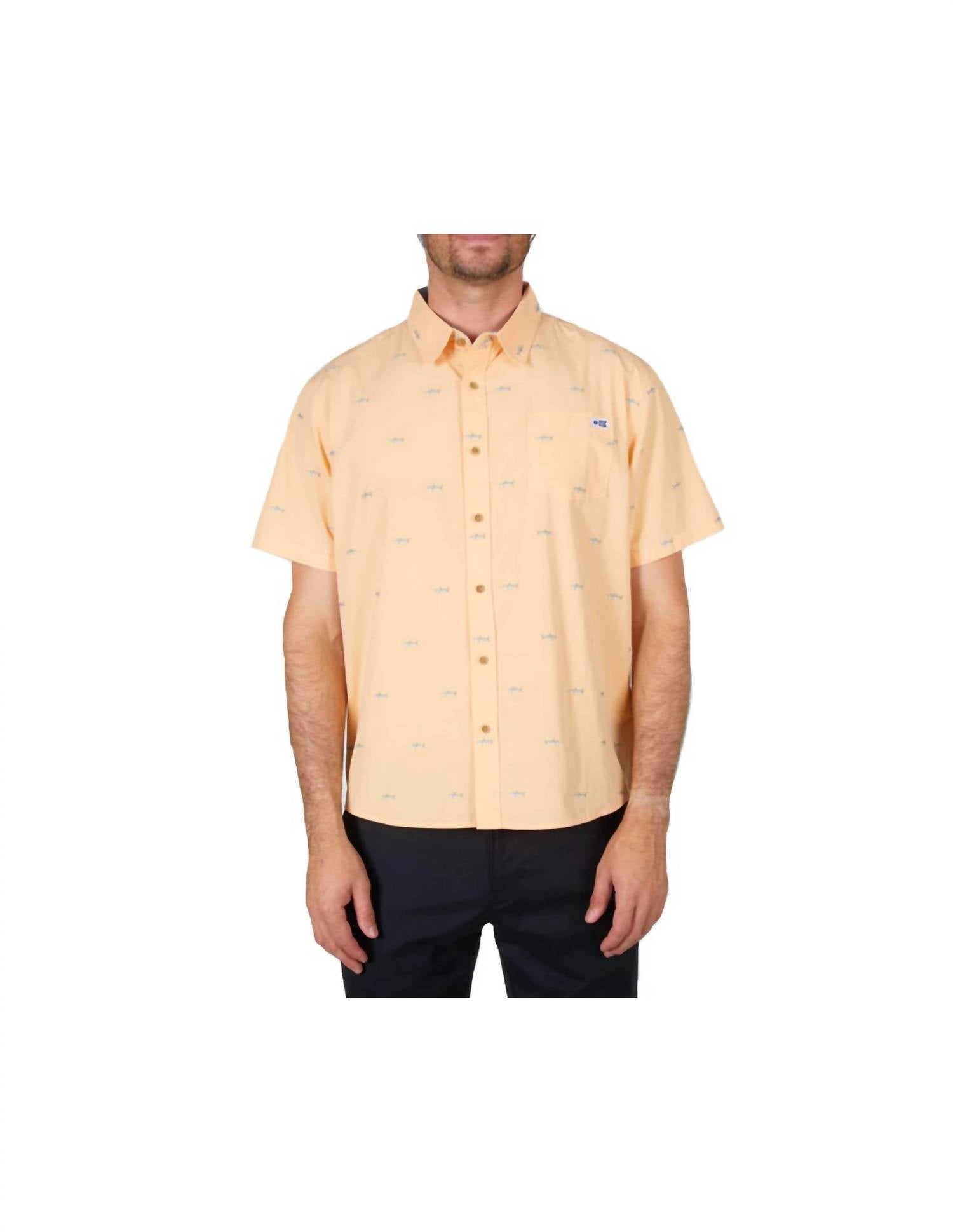 Experience style and comfort with the Salty Crew Bruce Short Sleeve Woven Shirt in an eye-catching peach. Crafted from 100% cotton, this lightweight and breathable shirt is adorned with a jacquard shark pattern, offering a casual yet refined look for beach outings or nights out. Featuring a collar neckline, wooden button closure, and a left chest pocket, this versatile shirt combines functionality with flair. Perfect for any summer vacation wardrobe, it's essential attire for the stylish adventurer.