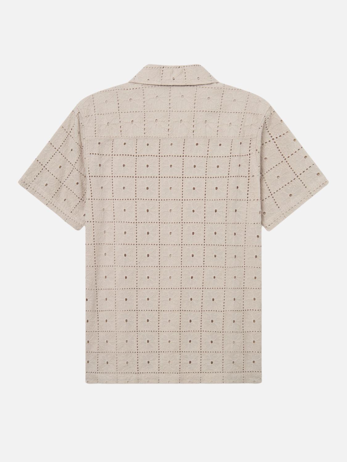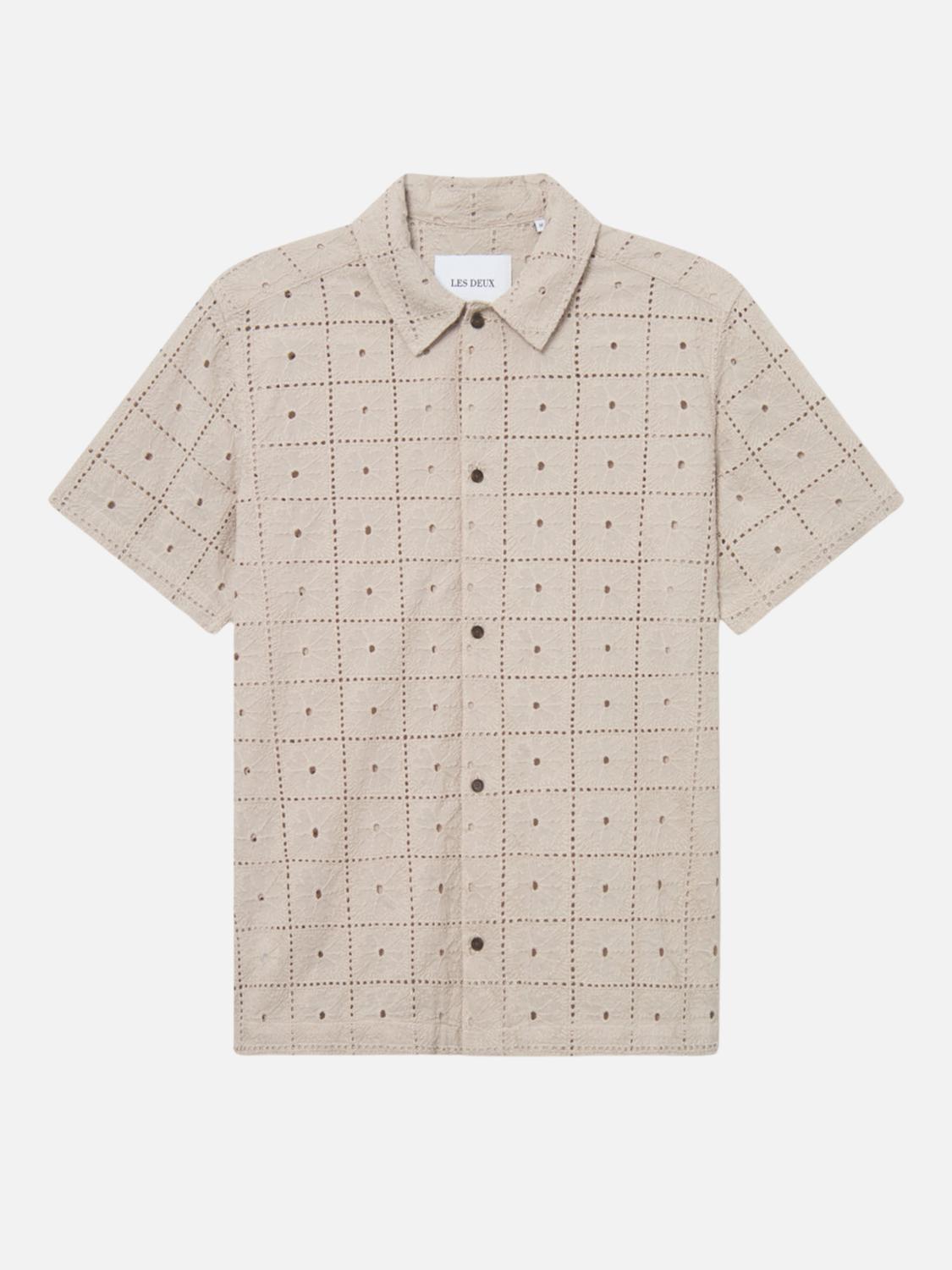 Introducing the Men's Hector Anglaise Shirt by Les Deux, a light sand piece perfect for the summer holiday season. Crafted from 100% cotton in broderie anglaise, this short sleeve shirt features a classic collar and bone-look button closure. Designed with a loose fit and unpleated yoke for a casual yet sophisticated look. Please follow care instructions as per label.