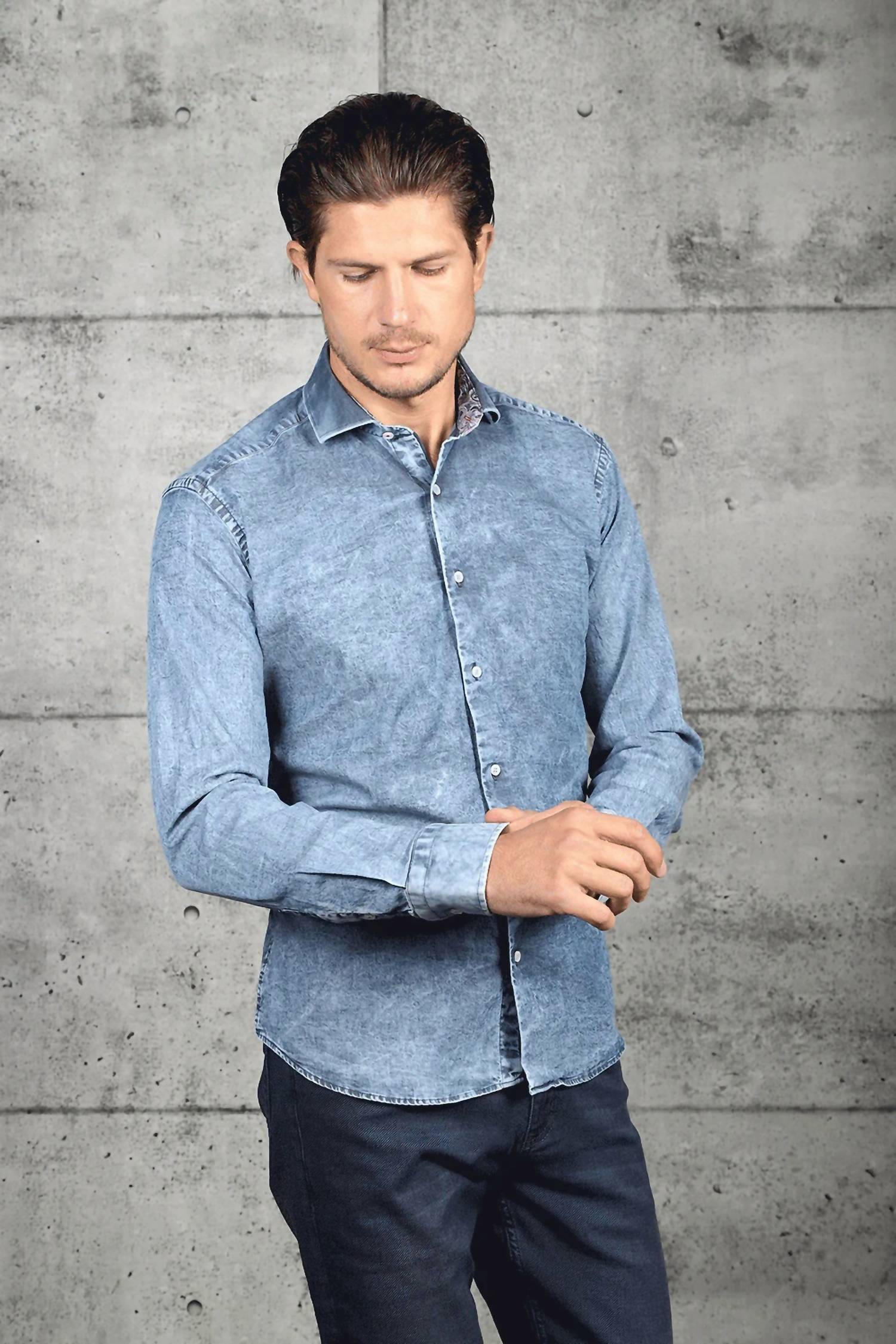 Introducing the Denim Long Sleeve Shirt by 7 Downie St., tailored for effortlessly sophisticated style, ideal for the Fall season. This men's casual button-down shirt features a long sleeve design with a cutaway collar and hidden button-down for an elevated look. Composed of a cotton blend, it boasts contrasting collar and cuffs with rear darts to ensure a personalized fit. Closure: Button closure.