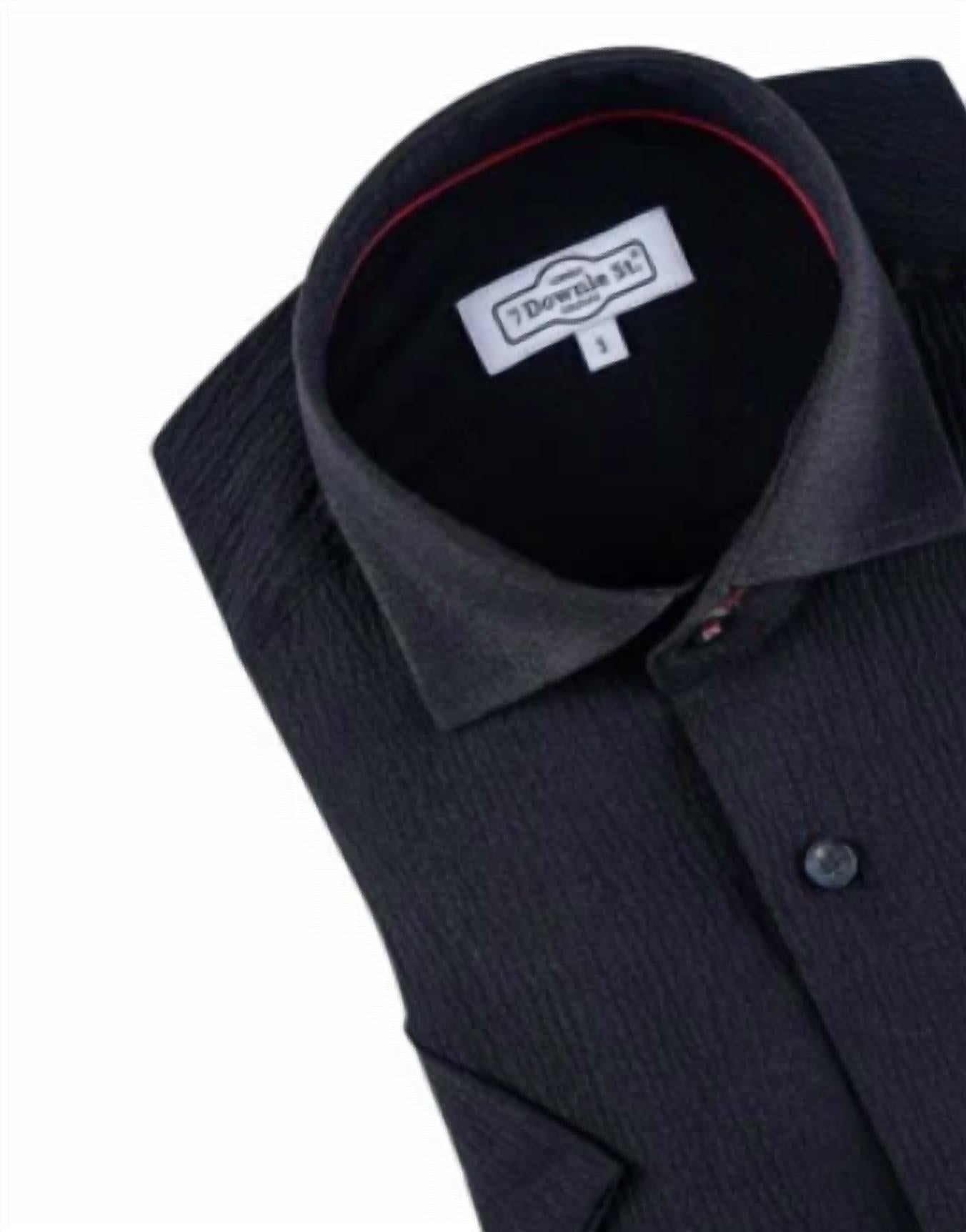 Introducing the Men's Lisbon Short Sleeve Shirt by 7 Downie St., an ideal choice for your summer wardrobe. This minimalist black shirt features a textured pattern and a classic collar, perfect for vacation or casual outings. It comes with a convenient button closure for easy wear. No specific care instructions are provided, ensuring worry-free maintenance.