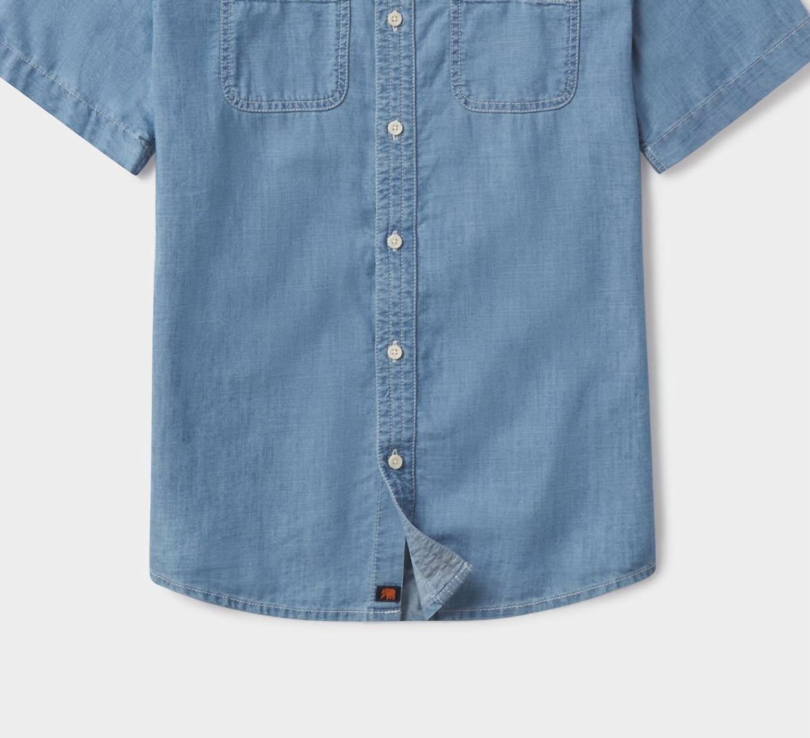 Discover the Men's Chambray Short Sleeve Button Up by The Normal Brand, designed in a classic medium wash for timeless appeal. This versatile shirt features short sleeves and a comfortable blend of cotton and Tencel with a subtle slub texture for added dimension. The front showcases a shirt collar, a button closure, and two chest pockets, complemented by trapunto stitching for subtle detail. Care: Machine wash and tumble dry for convenience.