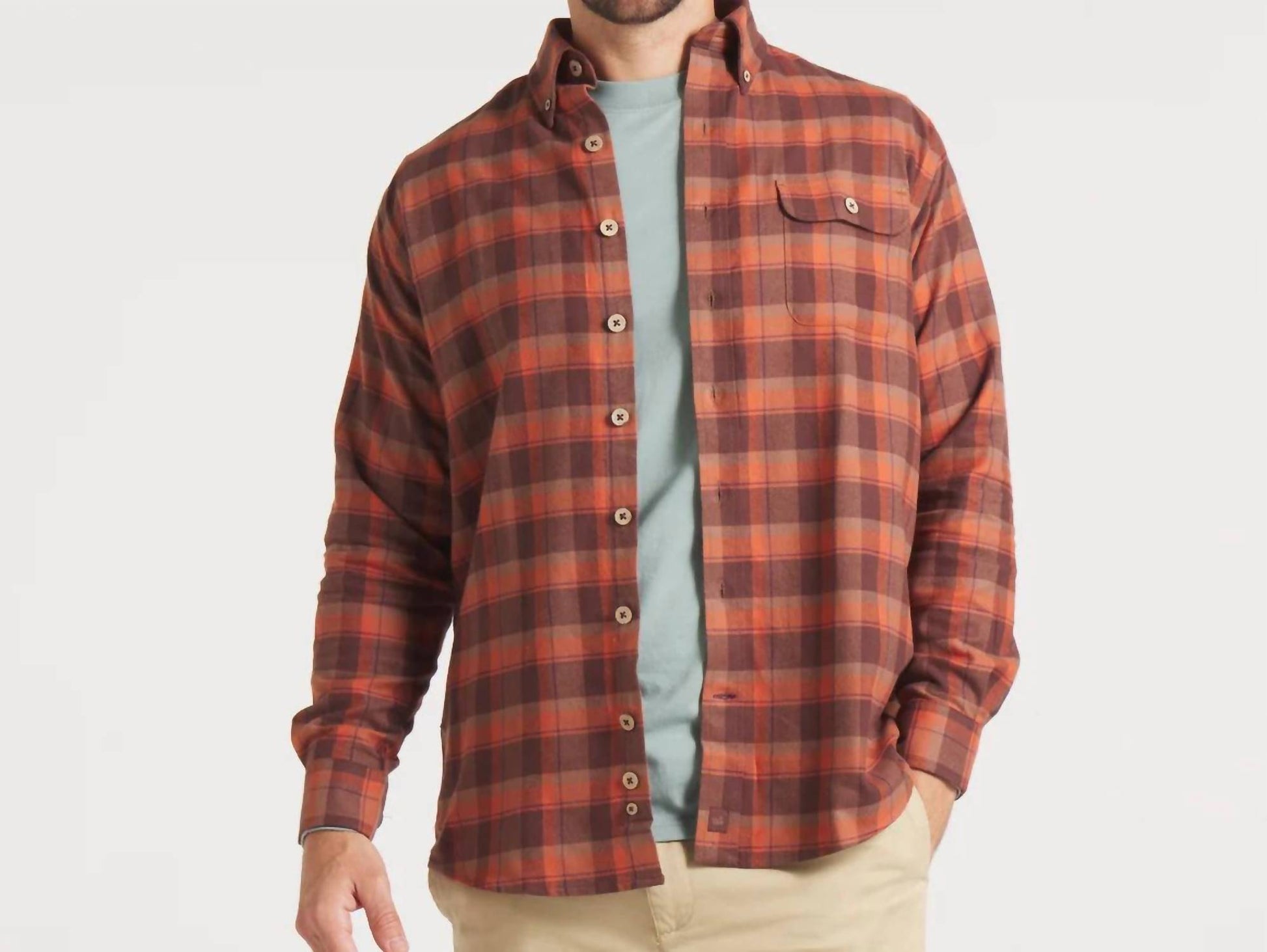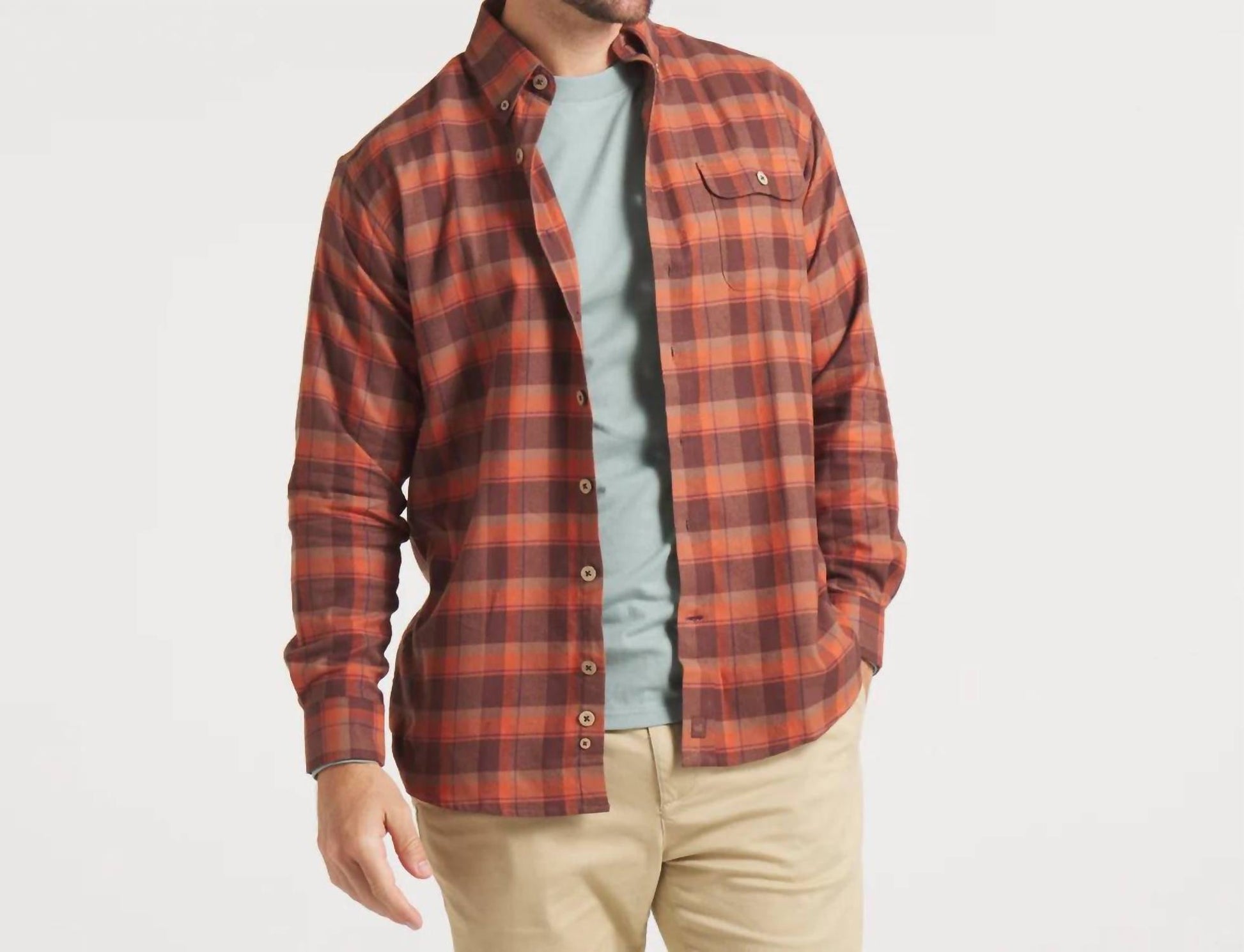 Crafted for comfort in cooler months, the Hemphill Twill Flannel Button Down by Southern Marsh is a must-have for any wardrobe. Featuring long sleeves and constructed from 100% cotton, this rugged stone brown and burnt orange plaid shirt offers a button-down closure and collar, enhanced by the convenience of a chest pocket. It boasts logo engraved buttons, ensuring a touch of sophistication to this casual design. Enjoy the easy maintenance of this piece with its machine washable fabric.