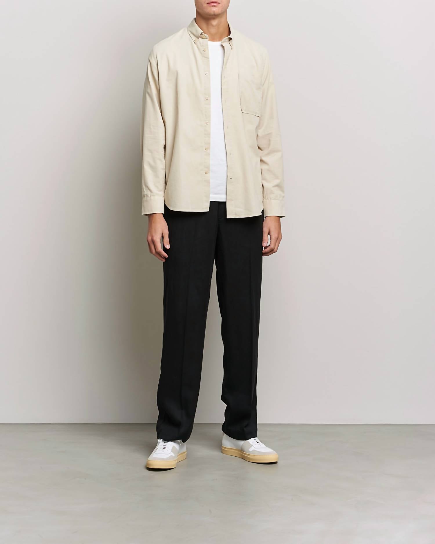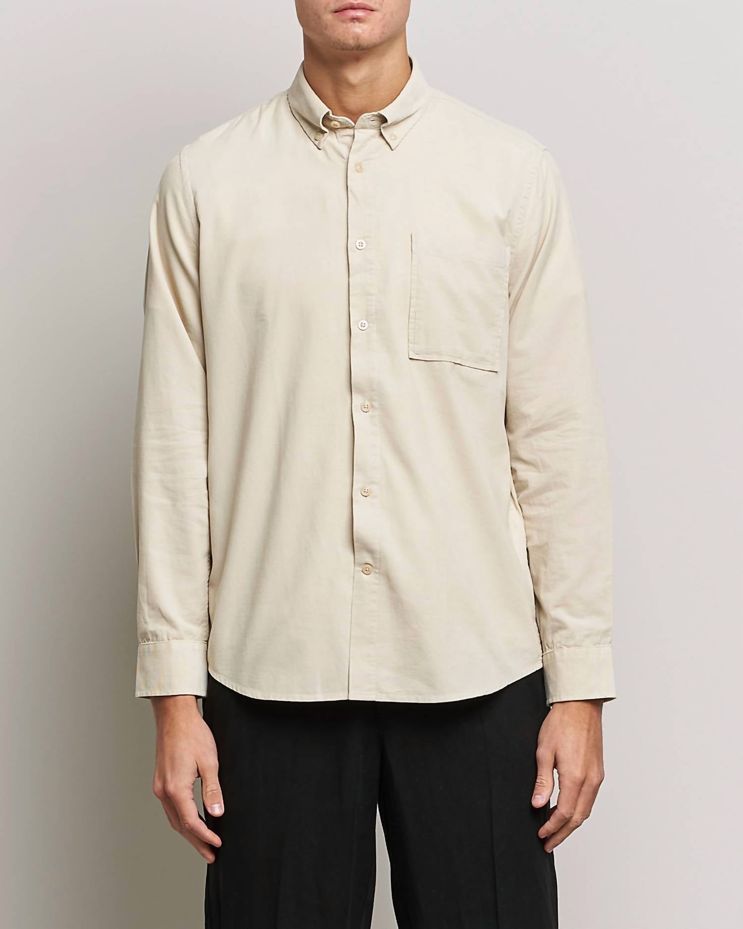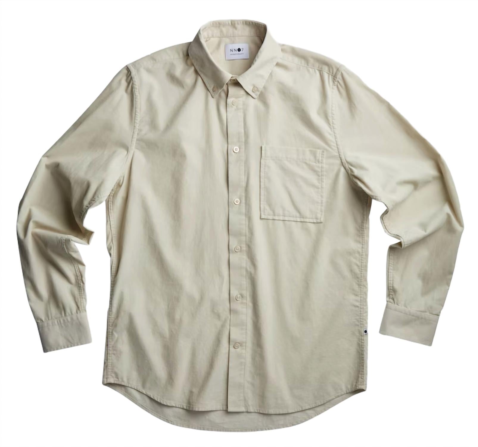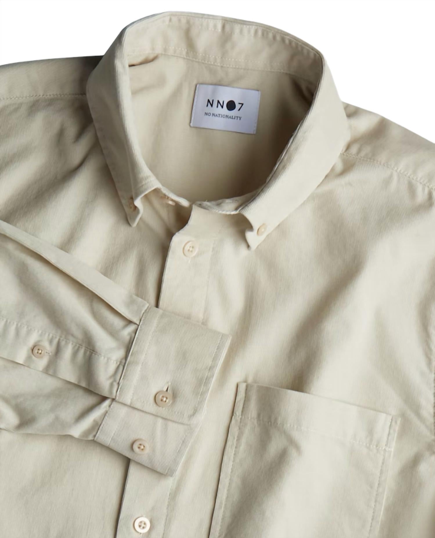 The Arne Cotton Corduroy Shirt by NN07 is a timeless casual button-down shirt in ecru, perfect for any wardrobe. This piece features long sleeves and a subtle drop shoulder for a relaxed fit, crafted from better sourced cotton corduroy for sustainability and comfort. It is designed with a collar, a convenient single patch pocket, and finished with mother of pearl buttons for a classic closure. Care is effortless with machine washability and tumble dry compatibility.