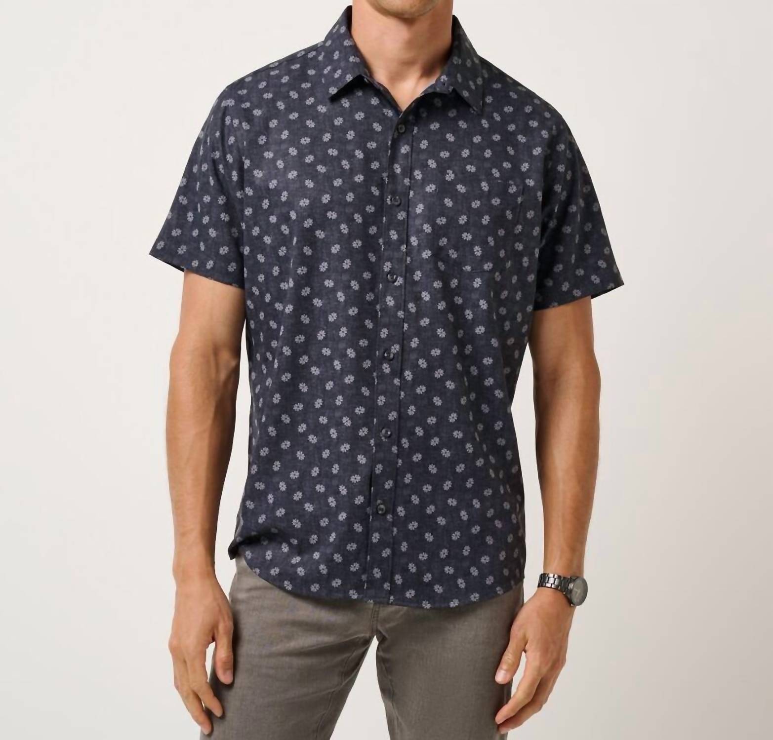 Elevate your style effortlessly with the Techwoven Frey Wind Floral Print Shirt by Travis Matthew, presented in a sophisticated Heather Black. Tailored with short sleeves and crafted from premium polyester, this casual button-down is perfect for summer outings. The design includes custom buttons and a button closure, complemented by removable collar stays for optimal shape. Care for this floral-patterned essential with machine wash and tumble dry convenience.