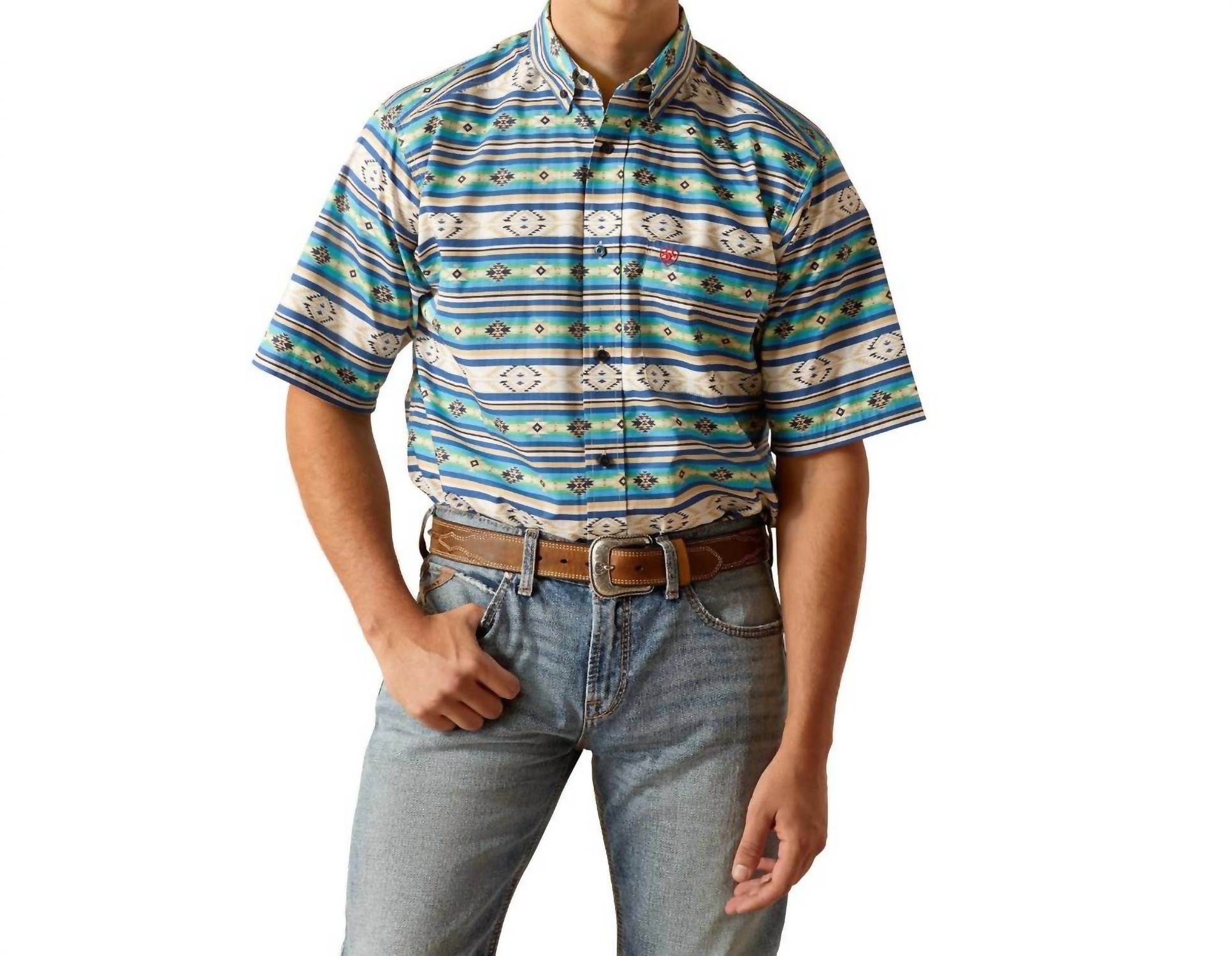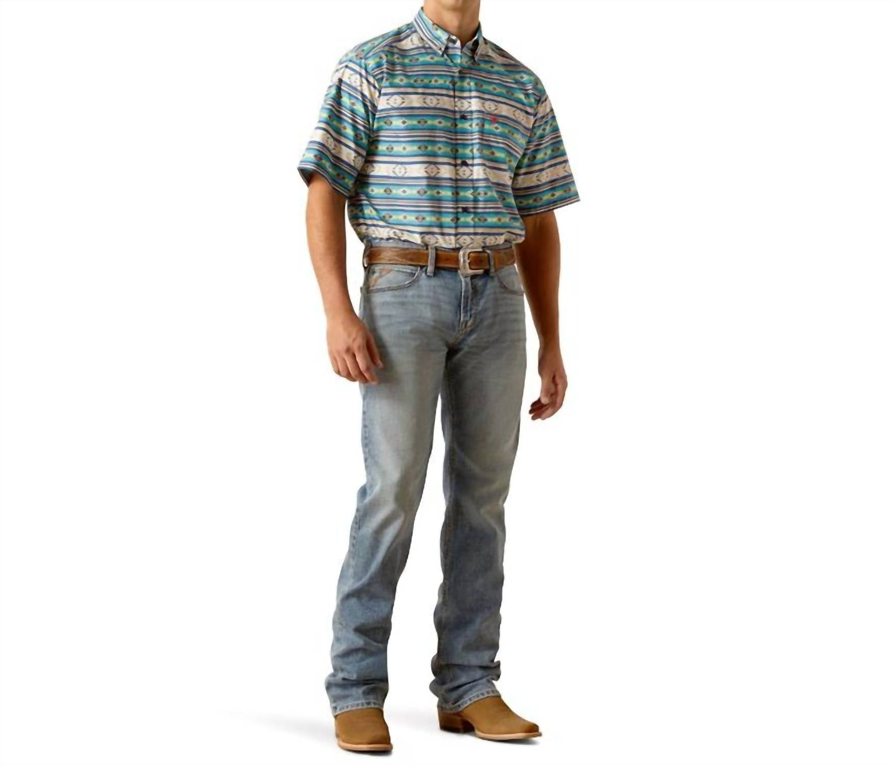 Introducing the Men's Denzel Limoges Shirt by ARIAT, an ideal choice for your vacation wardrobe this Spring. This patterned shirt features a classic collar and short sleeves, providing a comfortable fit in a blue multi-color design perfect for casual outings. Closure: Button closure. Embrace a Western-inspired trend while enjoying leisurely days in style.