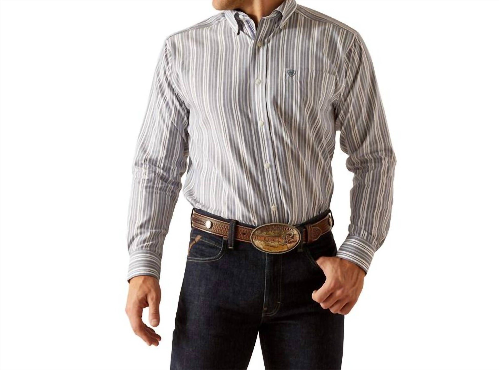 Elevate your vacation wardrobe with the Men's Ross Pro Serie Shirt by ARIAT, a staple for effortless style. This navy, striped casual button-down is designed with long sleeves and a classic collar neckline. Closure: Button closure. Ideal for a laid-back Western vibe, it pairs perfectly with your spring lineup.
