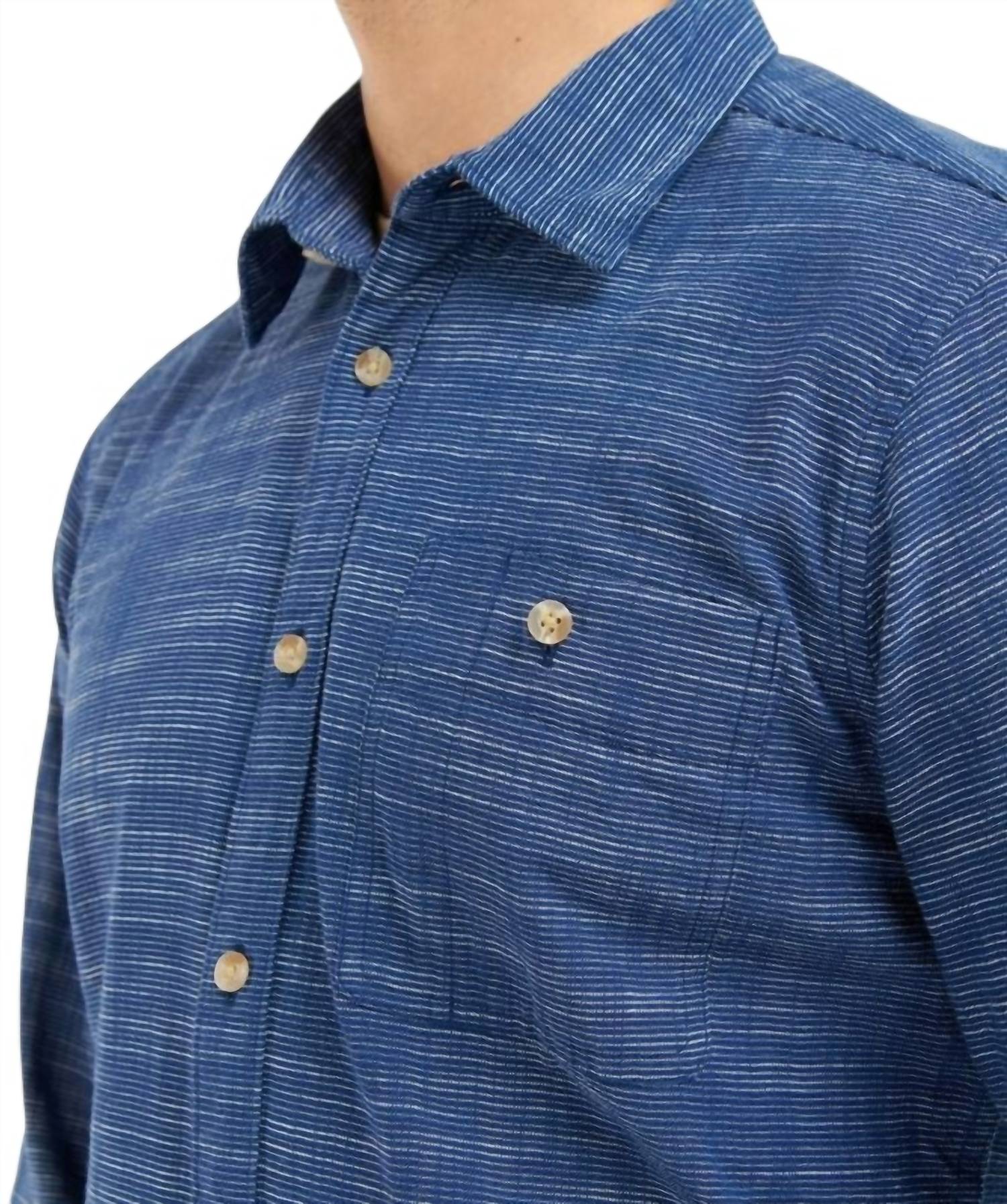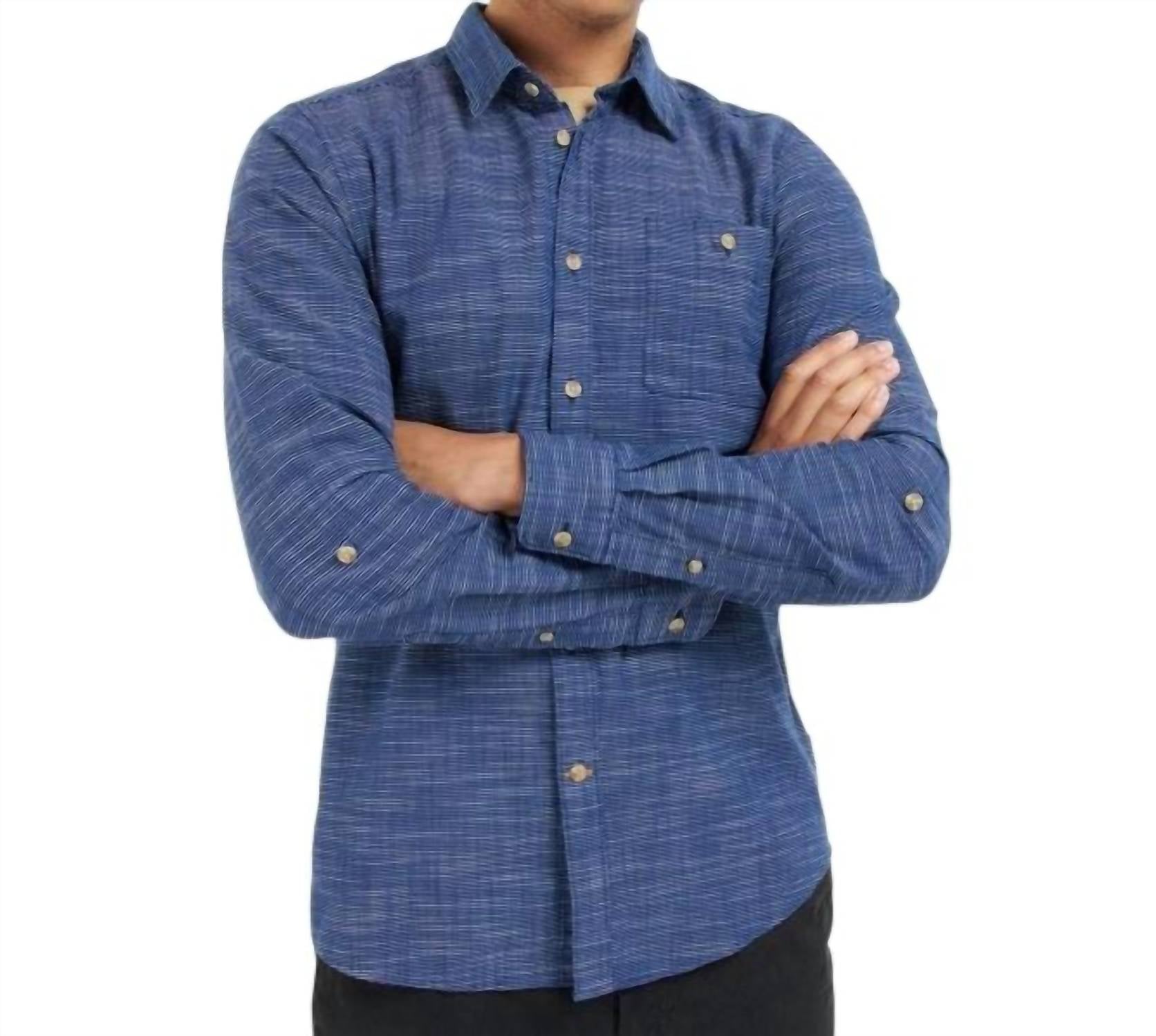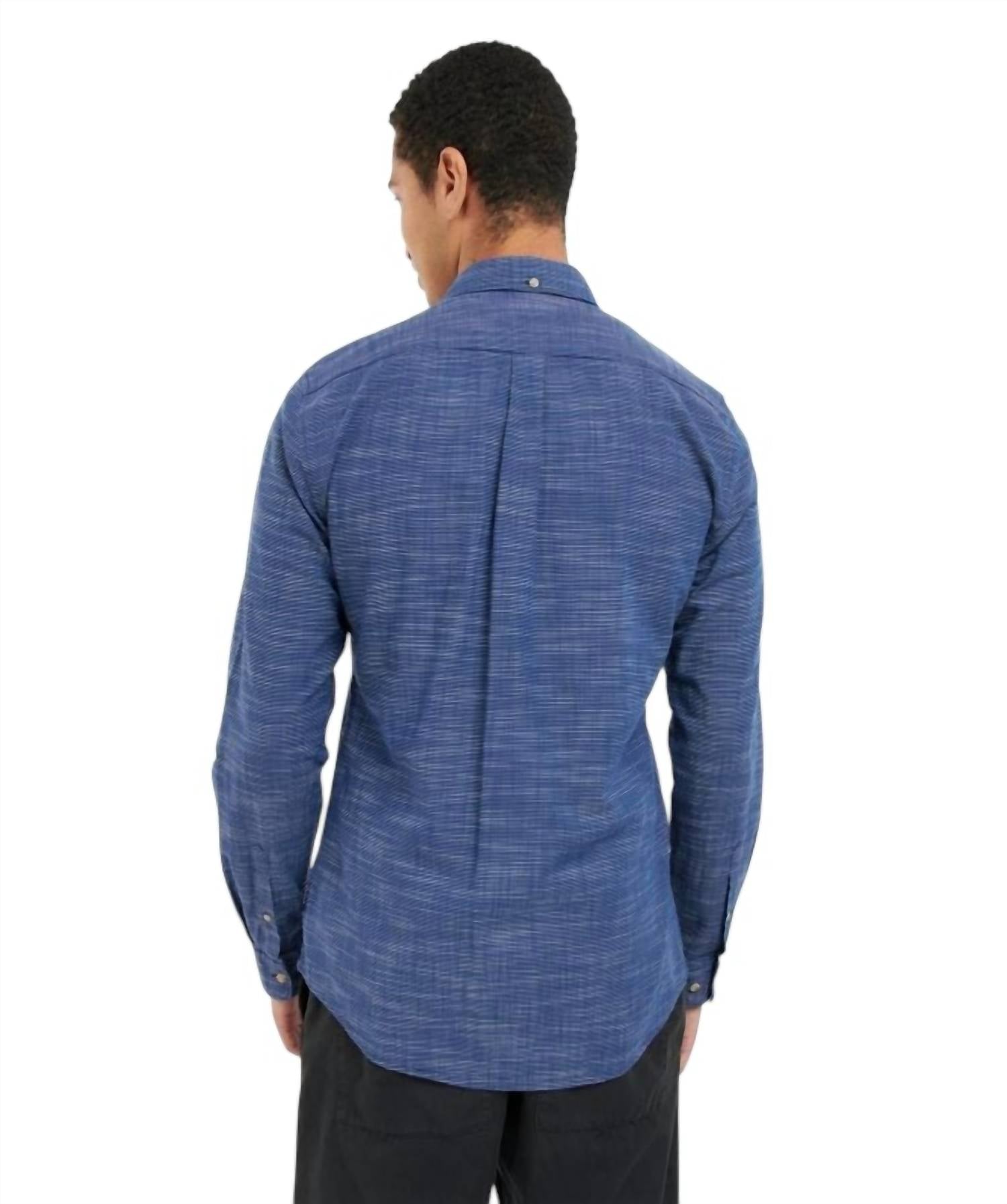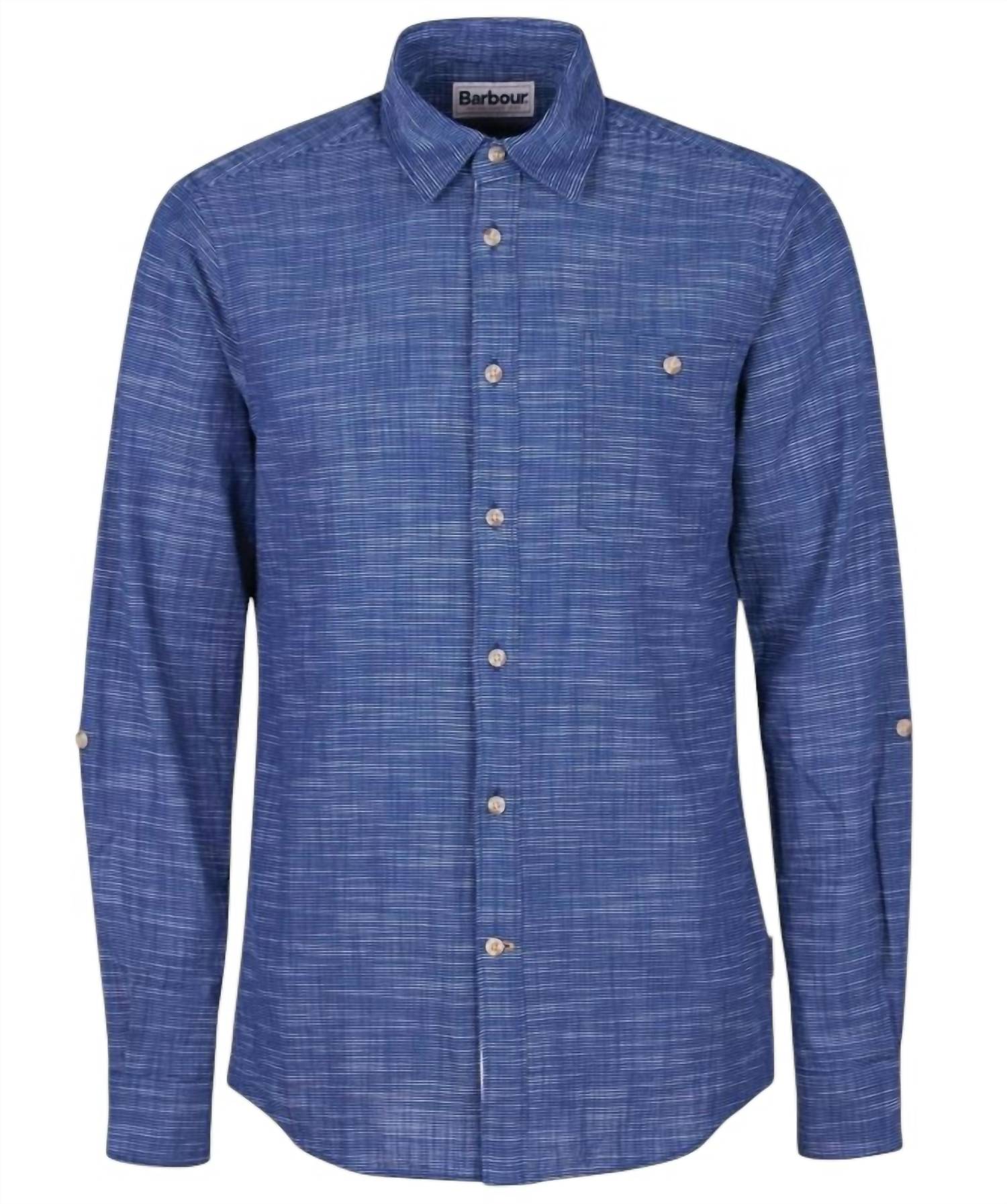 Presenting the Barbour Aldavik Tailored Shirt, a premium choice for casual elegance in navy. Designed with long sleeves that feature convenient roll-up buttons, this shirt is made from 100% cotton with a luxurious slub weave for a slim silhouette and superb softness. It includes a pointed collar, a buttoned pocket, and the iconic Barbour 55 Degrees North side tag for authentic detailing. Machine wash.