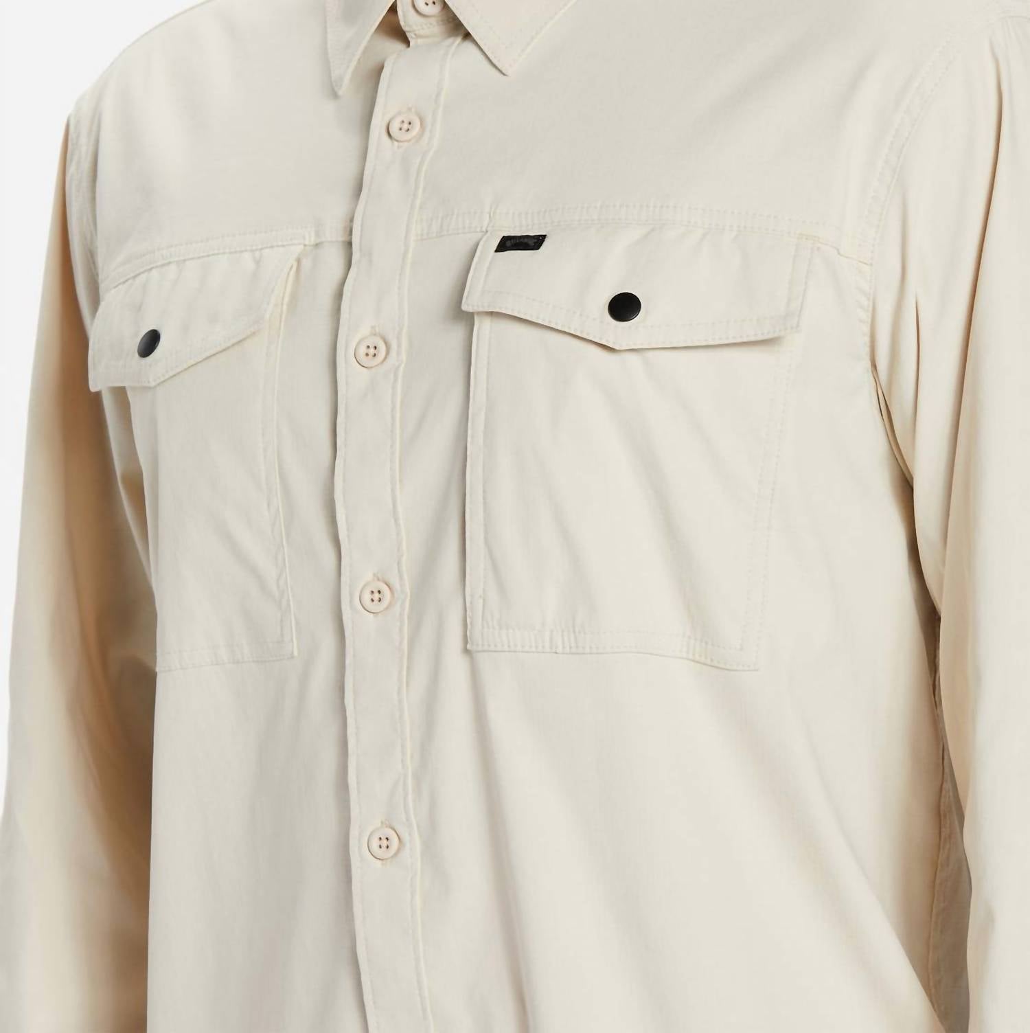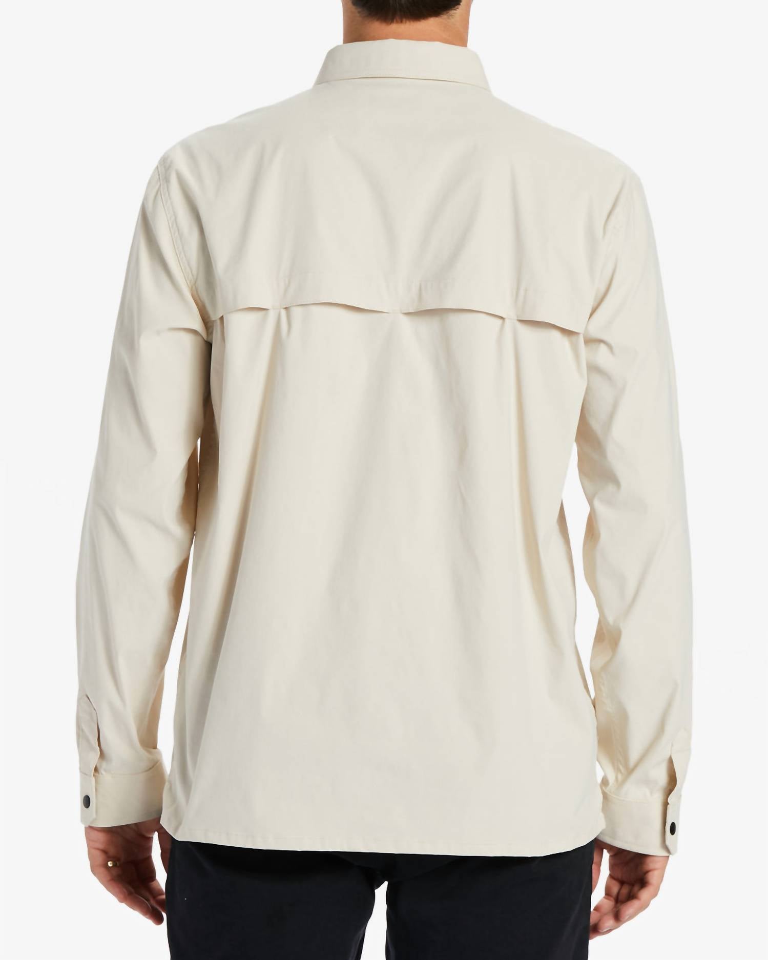 Introducing the Surftrek Tech Long Sleeve Shirt by Billabong, a must-have from the Adventure Division collection. Crafted from an eco-conscious recycled nylon elastane ripstop blend, this shirt offers UPF sun protection and moisture-wicking properties, perfect for outdoor activities. It features long sleeves, a collar neck, a dual entry zipper chest pocket, and a stylish button-down closure. The shirt also includes a vented mesh back yoke and a convenient sunglass microfiber cleaner on the center placket. Materials: 52% Recycled Nylon, 43% Nylon, 5% Elastane. Care: Machine wash and tumble dry.