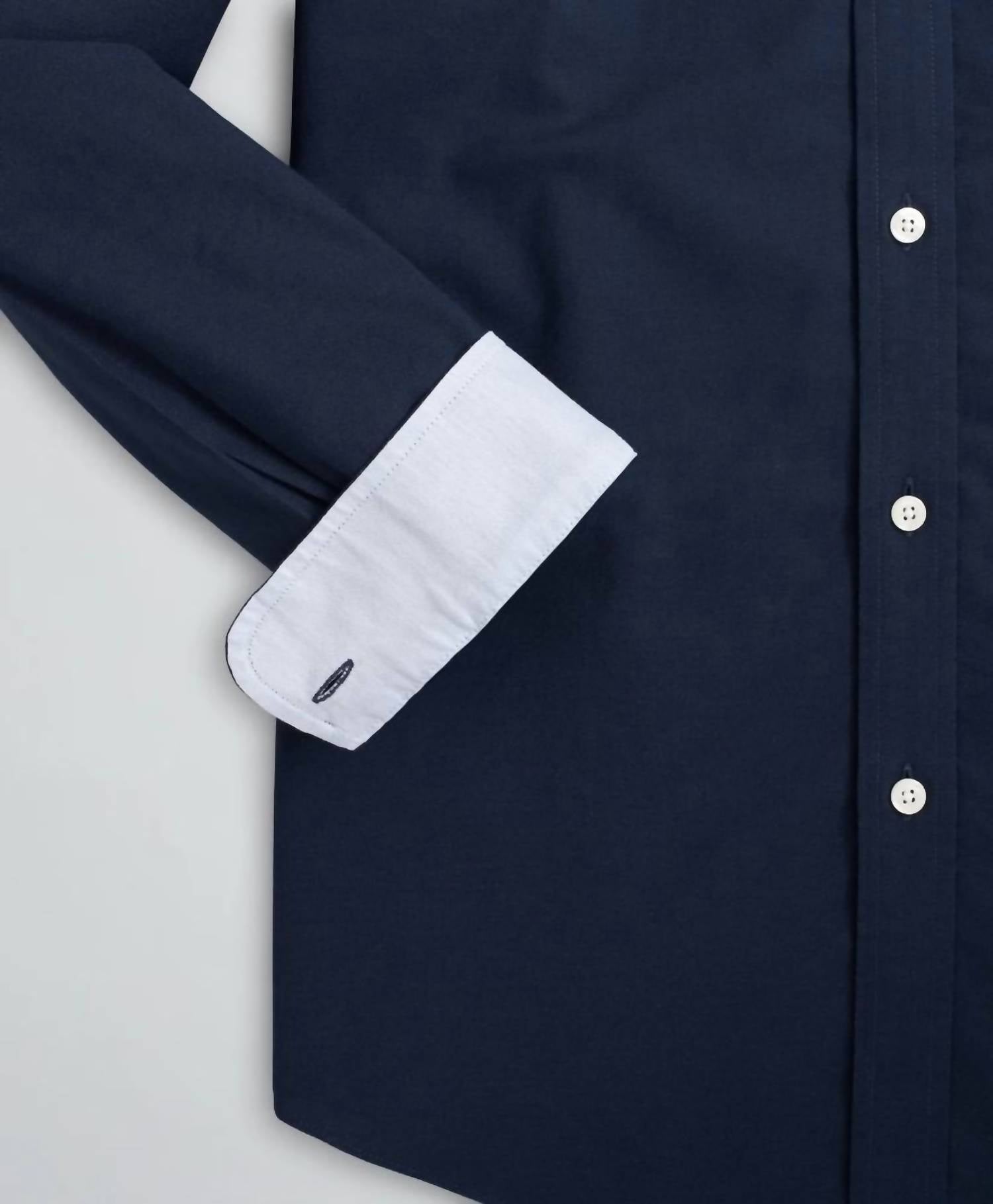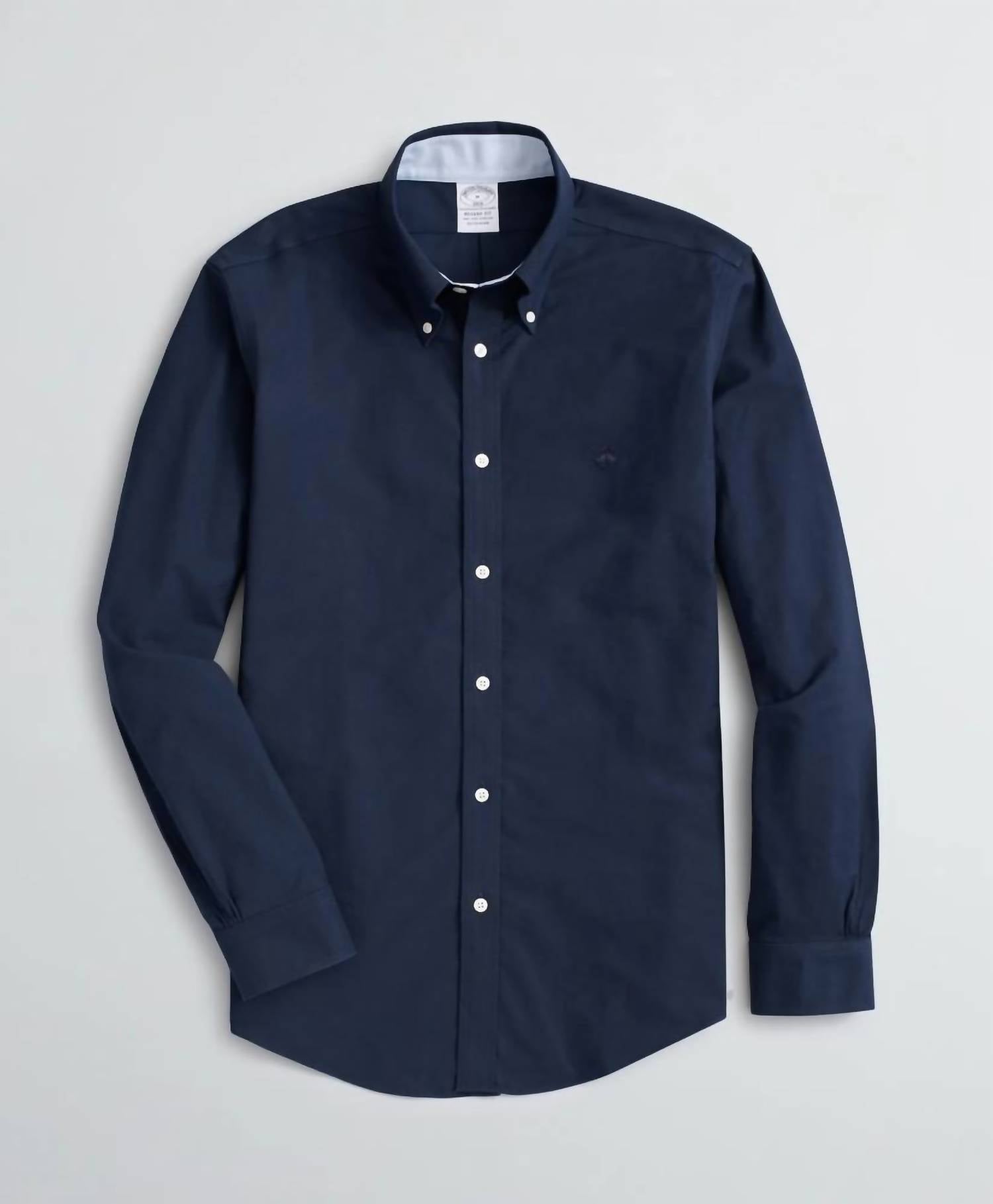 Elevate your wardrobe with the Men's Stretch Non-iron Oxford Button-down Collar Shirt by Brooks Brothers, a staple piece for any man's collection. This navy, long sleeve shirt is crafted from a 95% cotton and 5% spandex blend for comfort and durability. It features the iconic button-down collar, signature 6-Pleat Shirring® at the barrel cuffs, and a fleece emblem embroidered at the chest. Closure: Button closure. Care: Machine wash.