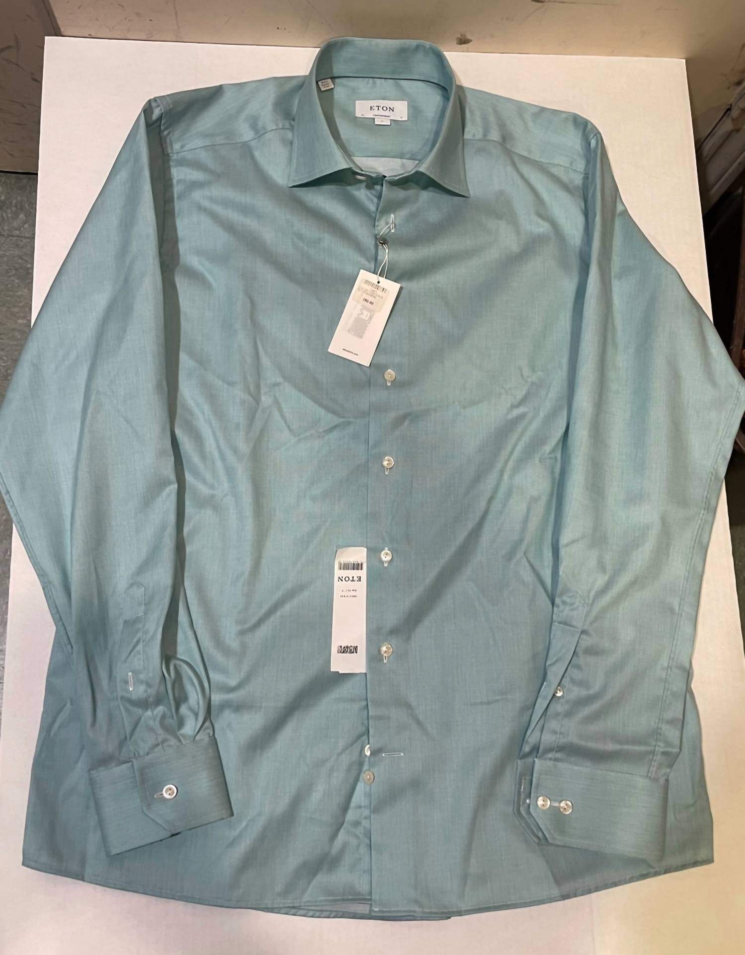Introducing the Eton Men's Dress Shirt in a sophisticated light green shade, perfect for any evening event. This solid, long sleeve shirt features a button down collar for a polished look. Made without pockets for a streamlined silhouette. Closure: Button closure. Care: Machine wash, line dry.
