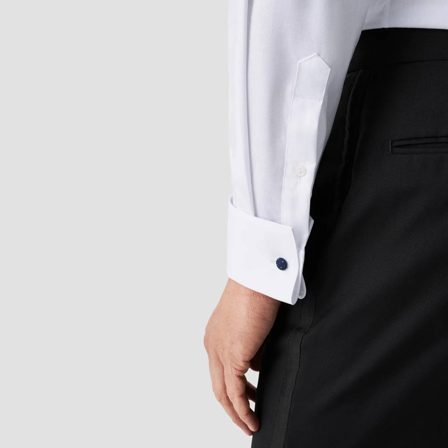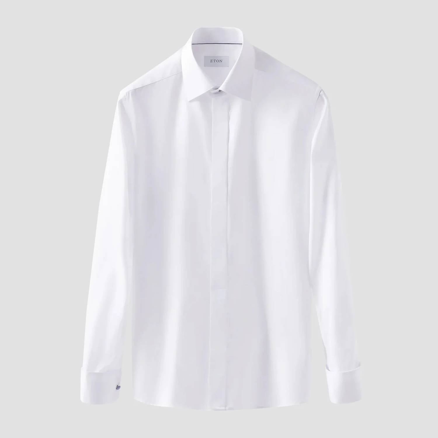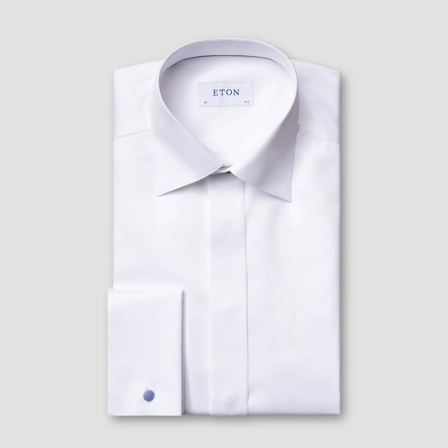 Introducing the Eton Textured Twill Long Sleeve Dress Shirt, a key piece for any refined wardrobe. Made from 100% premium cotton, this elegant shirt features a solid white twill fabric that exudes sophistication, perfect for black-tie events. With its contemporary fit, it boasts an evening cut-away collar, French cuffs, and a fly front for a polished aesthetic. Closure: Button closure. Care: Machine wash, line dry. Ideal for modern workwear during the spring.
