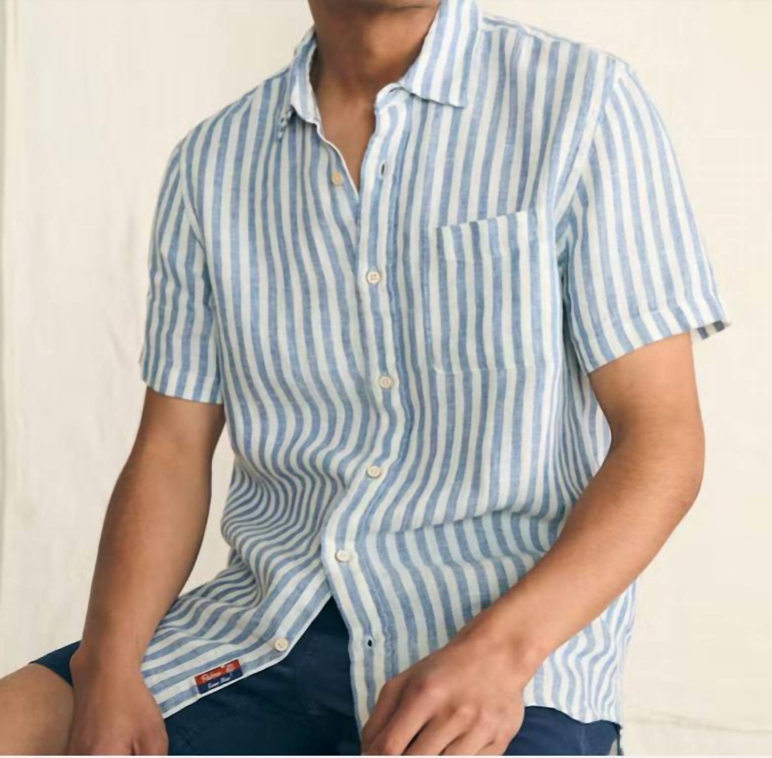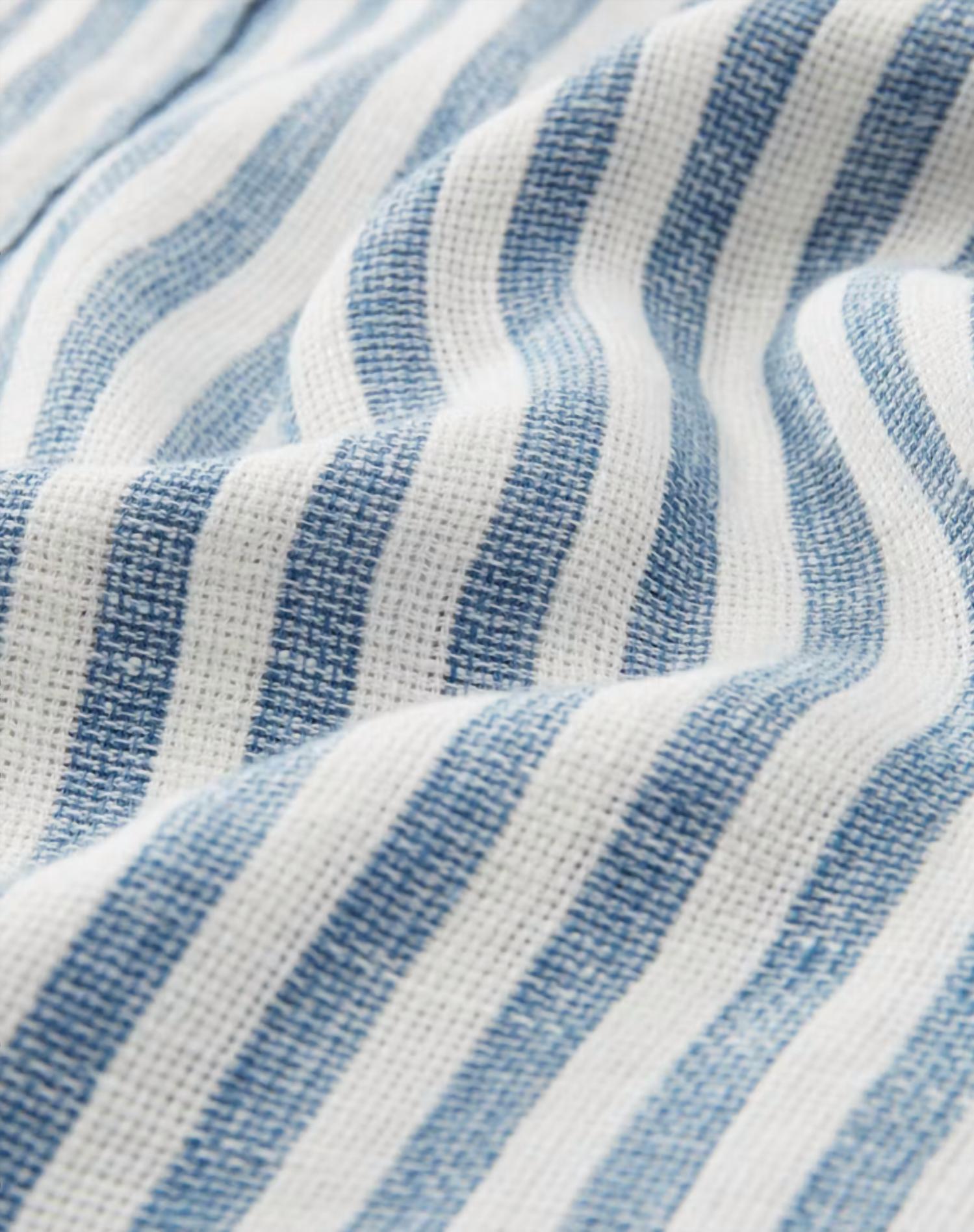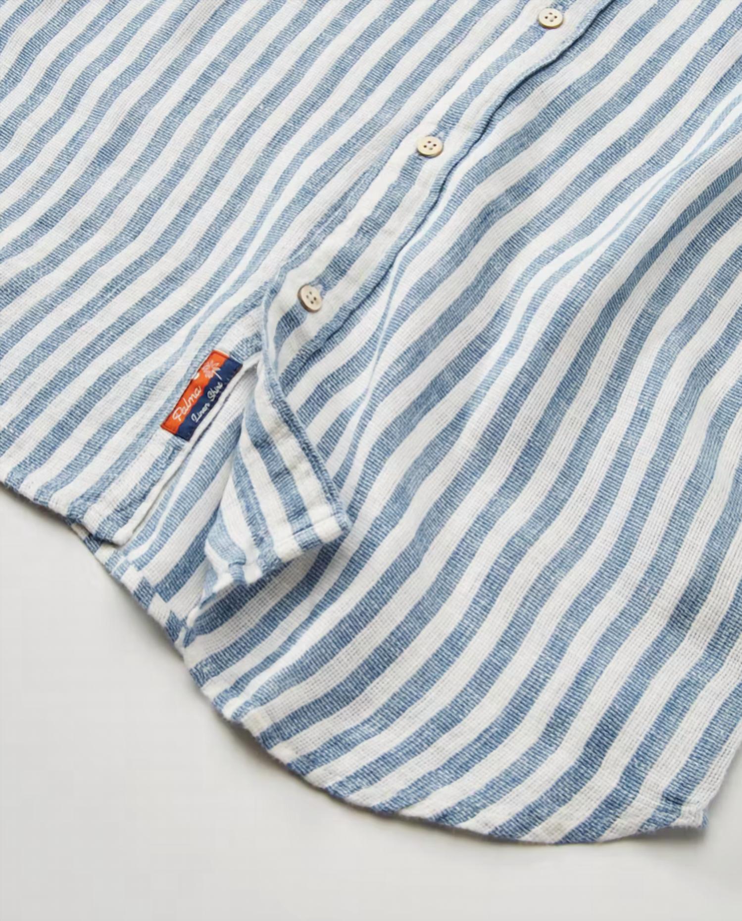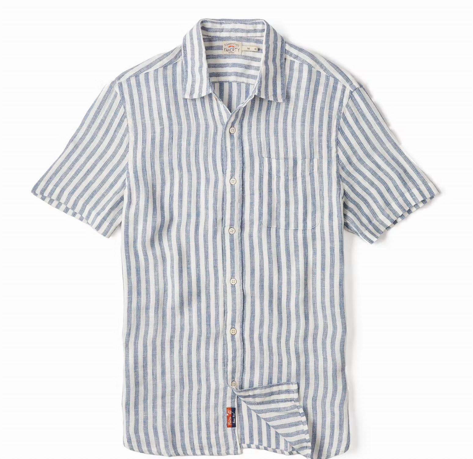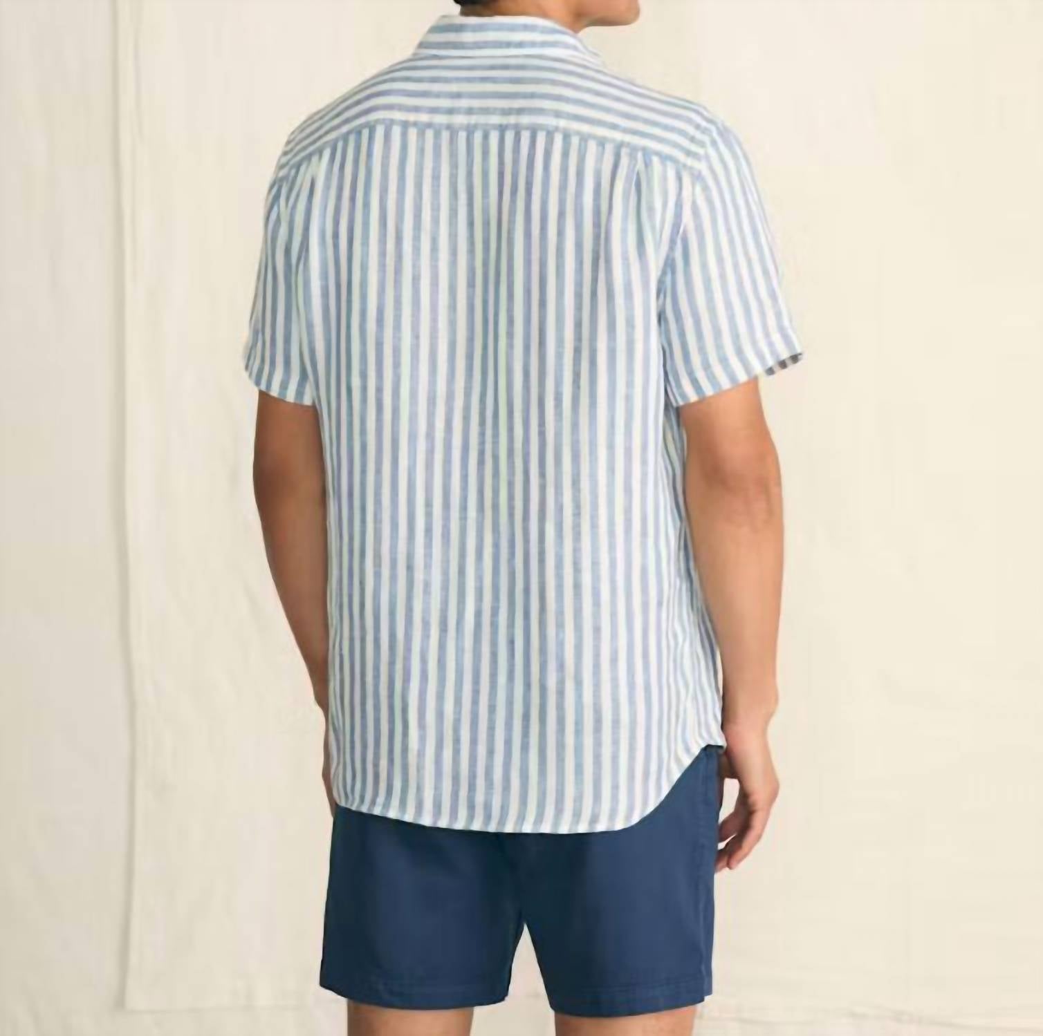 The Faherty Palma Linen Striped Shirt is your go-to for effortless summer style in a washed navy and white striped pattern. This short sleeve, button-up shirt is crafted from 100% linen, offering naturally cooling comfort and a lightweight feel. Featuring a camp collar and a patch chest pocket on the wearer's left, it boasts a tailored fit with a double pleated back for enhanced mobility. Closure: Button closure. Care: Machine wash, tumble dry.