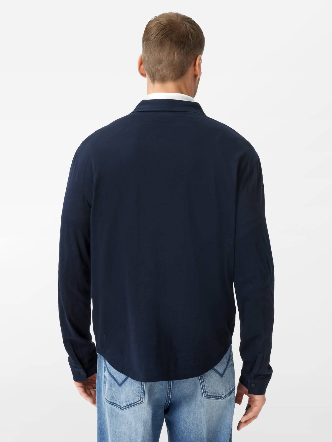 Discover the Gareth Shirt by John Varvatos, a sophisticated choice in NAVY designed for effortless travel and workwear. This long sleeve shirt is crafted from 100% organic cotton in a solid slub jersey knit, providing a polished yet comfortable touch. It features a full button closure with distinguished metal logo buttons on functional cuffs, adding a refined finish. Care for this tailored piece is made easy with machine wash and tumble dry instructions.
