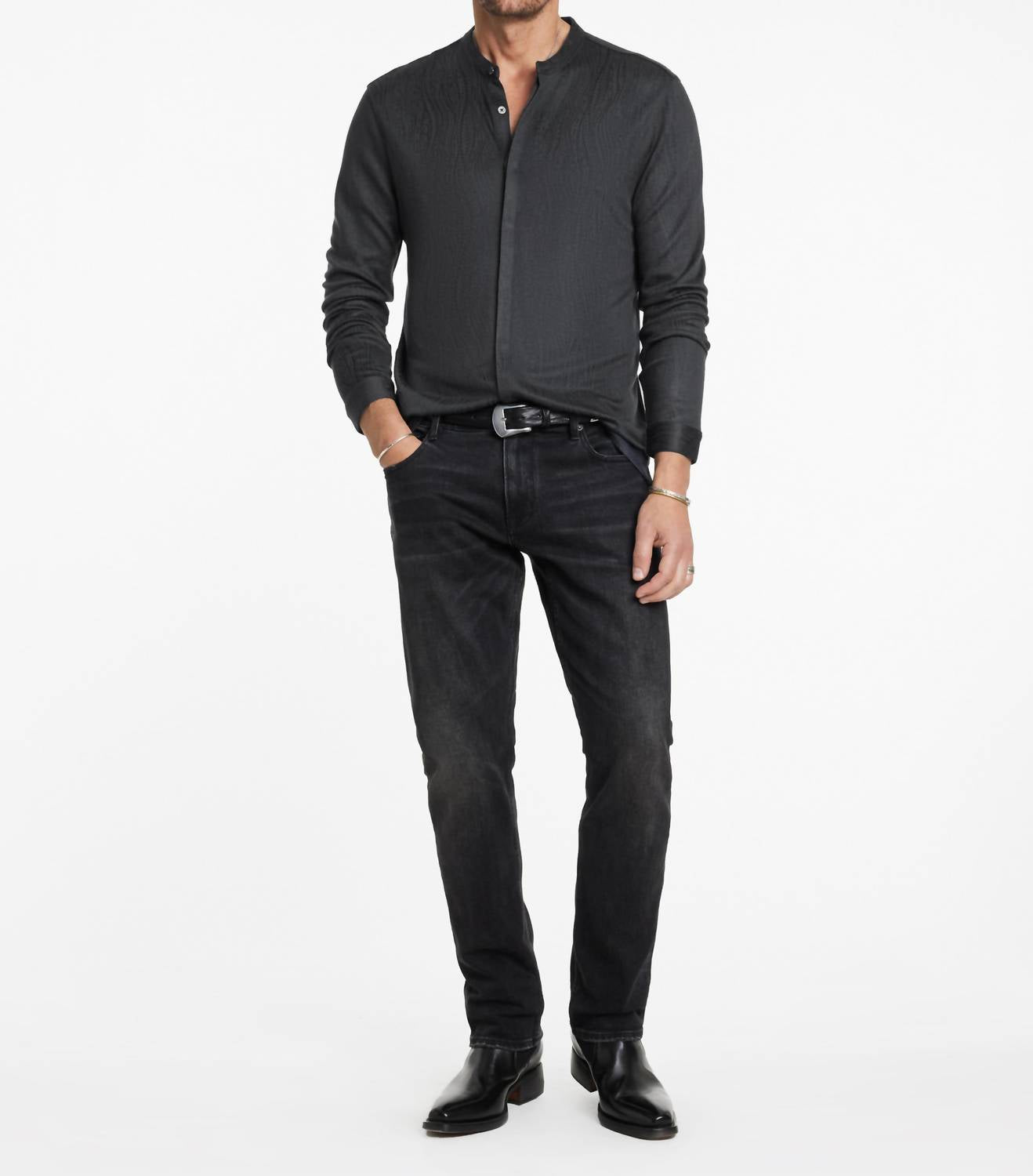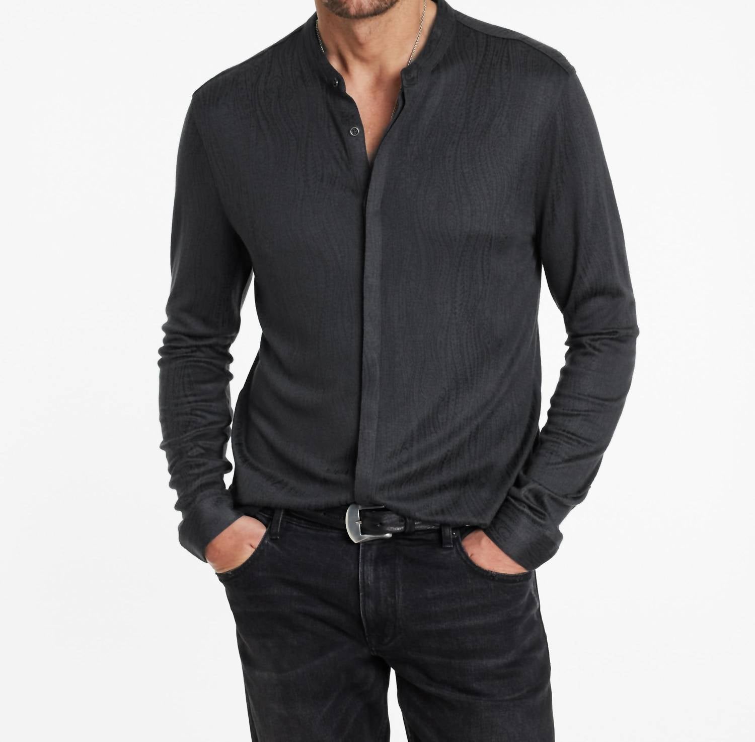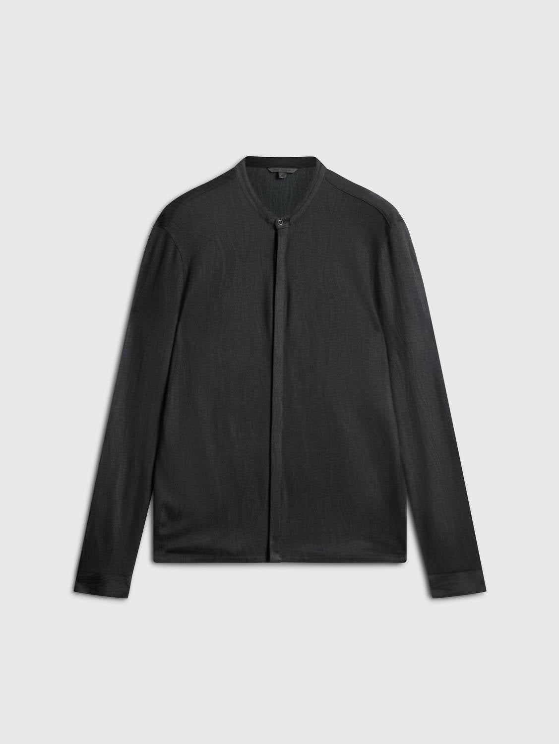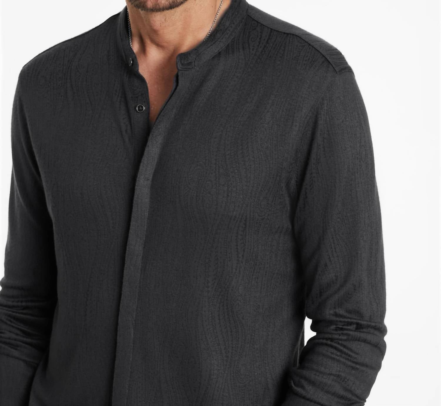 Meet the Otavio Long Sleeve Casual Shirt by John Varvatos, an artful blend of style and craftsmanship in black silky Portuguese viscose. The regular-fit shirt boasts a distinct paisley grain, with a sophisticated stand collar and a concealed button placket that elevates your ensemble with vintage charm. Composition: 88% Viscose, 10% Polyamide, 2% Elastane. With an ethically sourced fabric, body length is 28.5". Care is simple with a machine wash cold—ideal for those on the go or dressing for casual workwear.