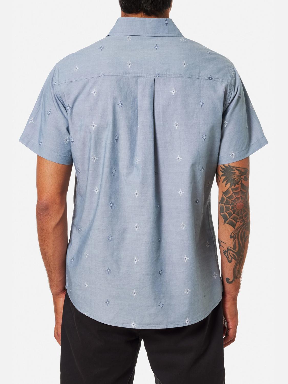 Embrace minimalist elegance with the Katin Rollins Cotton Shirt in Overcast, tailored for the modern man. This casual button-down features short sleeves, crafted from 100% lightweight, breathable cotton with a textured clipped dobby pattern. The shirt offers a standard fit and includes a practical chest pocket and a clean-finished interior with a shirttail hem, accentuated by its collared neckline and efficient button closure for a polished look. Perfect for spring engagements or Easter festivities.