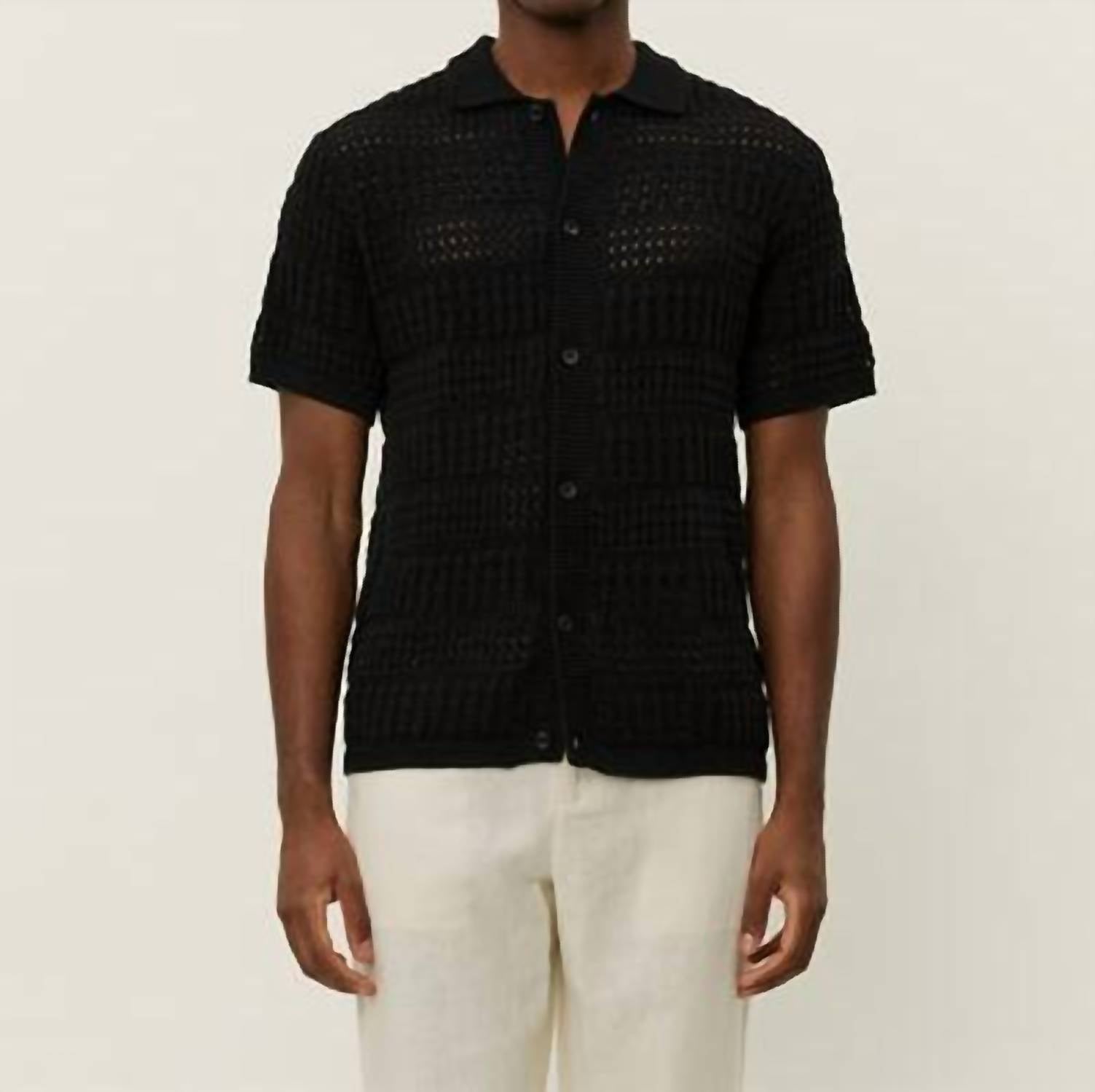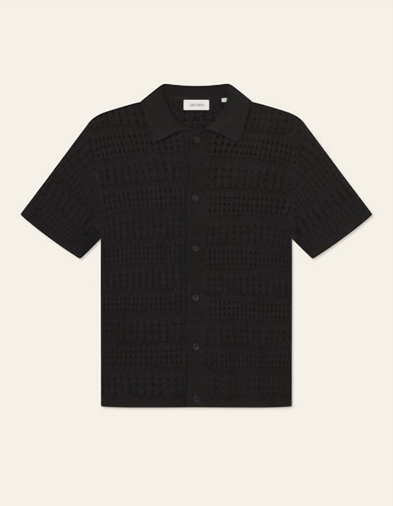 The Elvin Structured Knitted Short Sleeve Shirt by Les Deux in black is a refined addition to any vacation wardrobe. Made from a comfortable cotton blend, this short-sleeve shirt offers a textured pattern for a stylish look. Designed with a classic collar and button closure, it is perfect for relaxed spring occasions. Simply pair it with your favorite casual pieces for an effortlessly polished appearance.