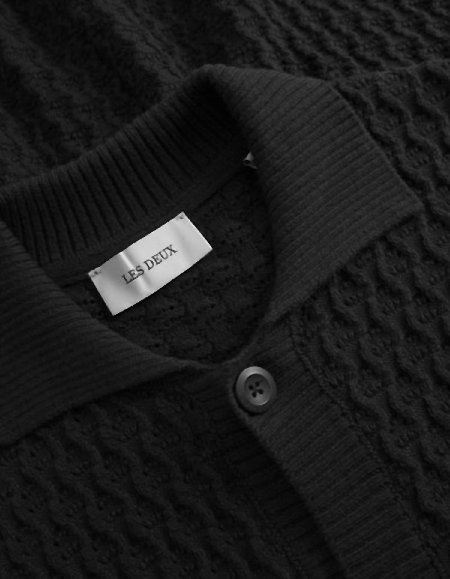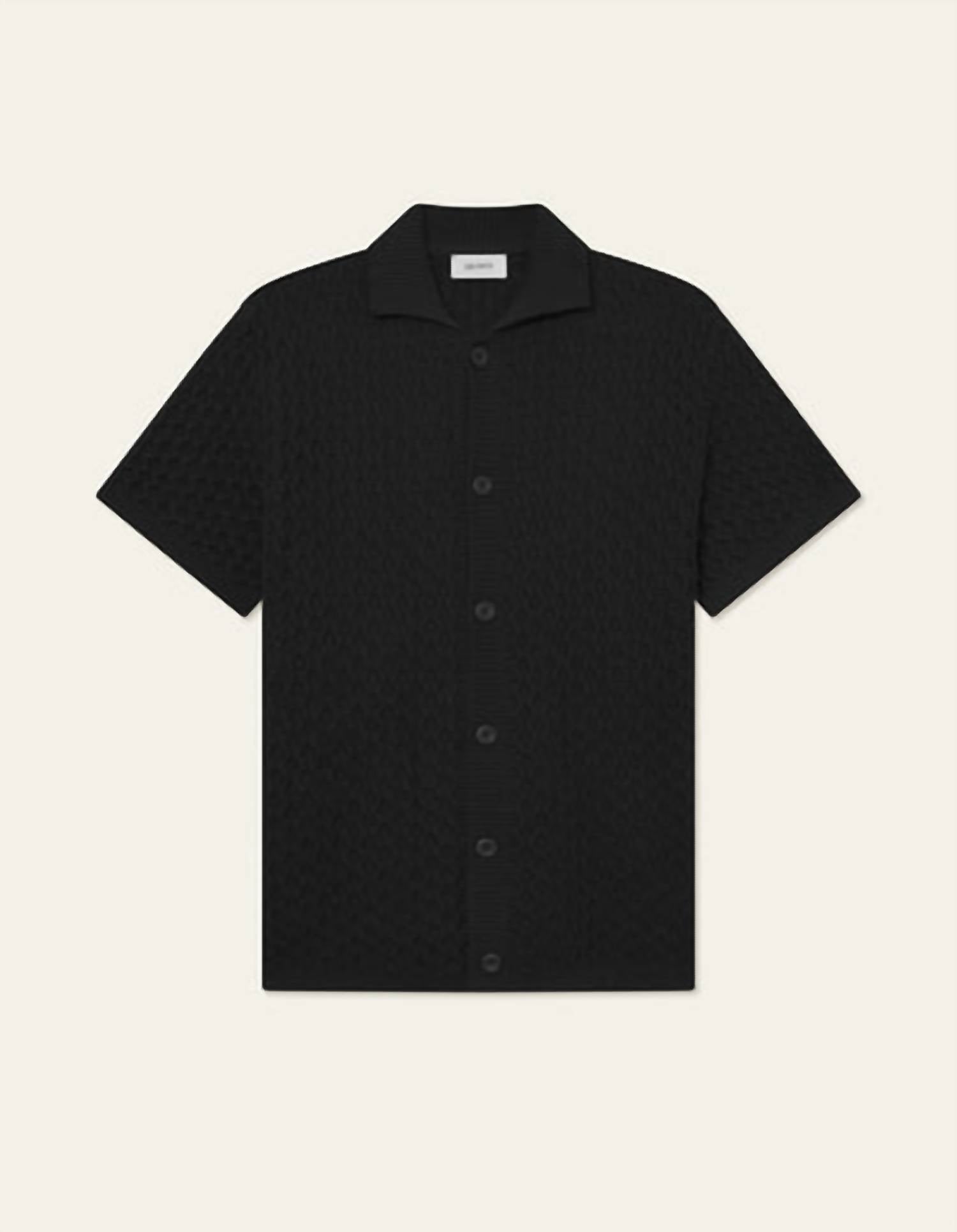 Elevate your holiday party look with the Gespertus Short Sleeve Knit Shirt by Les Deux, tailored for casual sophistication. This black shirt showcases a stylish textured pattern and features a classic collar to complement your spring wardrobe. Crafted from a cotton blend, it includes a convenient button closure. Made for men and designed without pockets, it's the ideal choice for a streamlined, polished appearance.