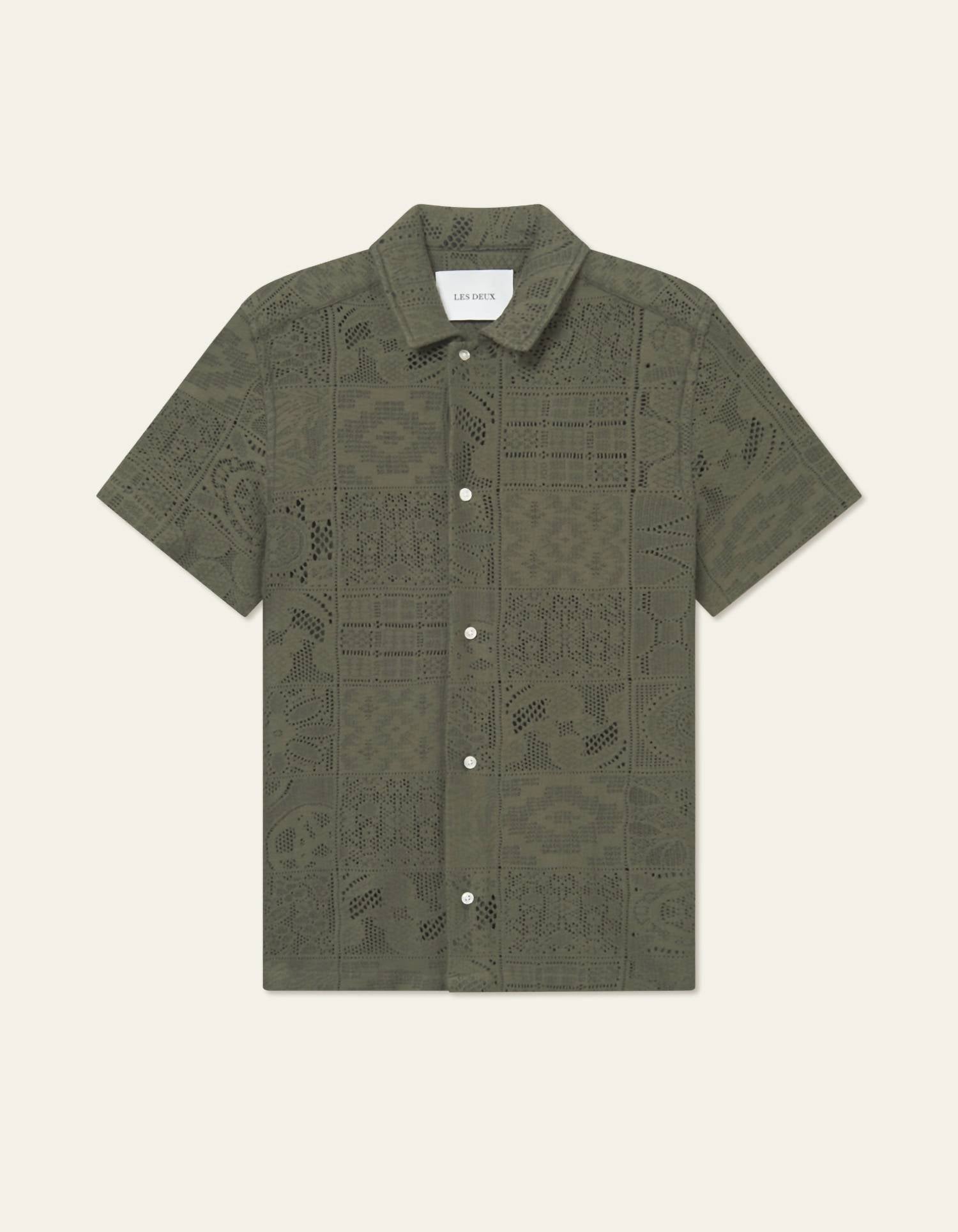 Introducing the Men's Hector Lace Short Sleeve Shirt by Les Deux in Olive Night, a distinctive choice for style enthusiasts. Made from a breathable cotton blend, this shirt features an intricate lace fabric composition of 85% Cotton, 13% Polyester, and 2% Elastane. Its design includes a classic collar and mother of pearl style button closure, ensuring an effortlessly polished look. For ease of care, simply machine wash and tumble dry.