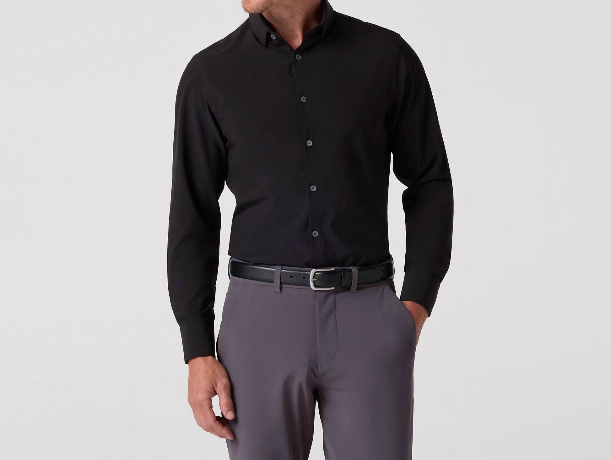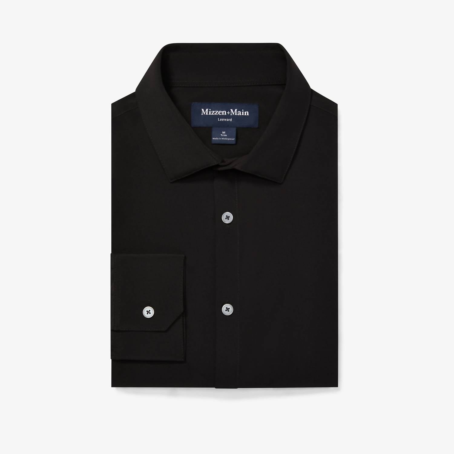 Elevate your workwear with the Leeward Dress Shirt by Mizzen + Main, a staple for any man's wardrobe. This classic black shirt features long sleeves and a solid pattern, perfect for a holiday party or any formal occasion. Made from 88% Polyester, 12% Spandex, it offers a comfortable fit with a stylish collar and button closure. Care instructions include machine wash and line dry for easy maintenance, and its garment length measures 30.375 inches.