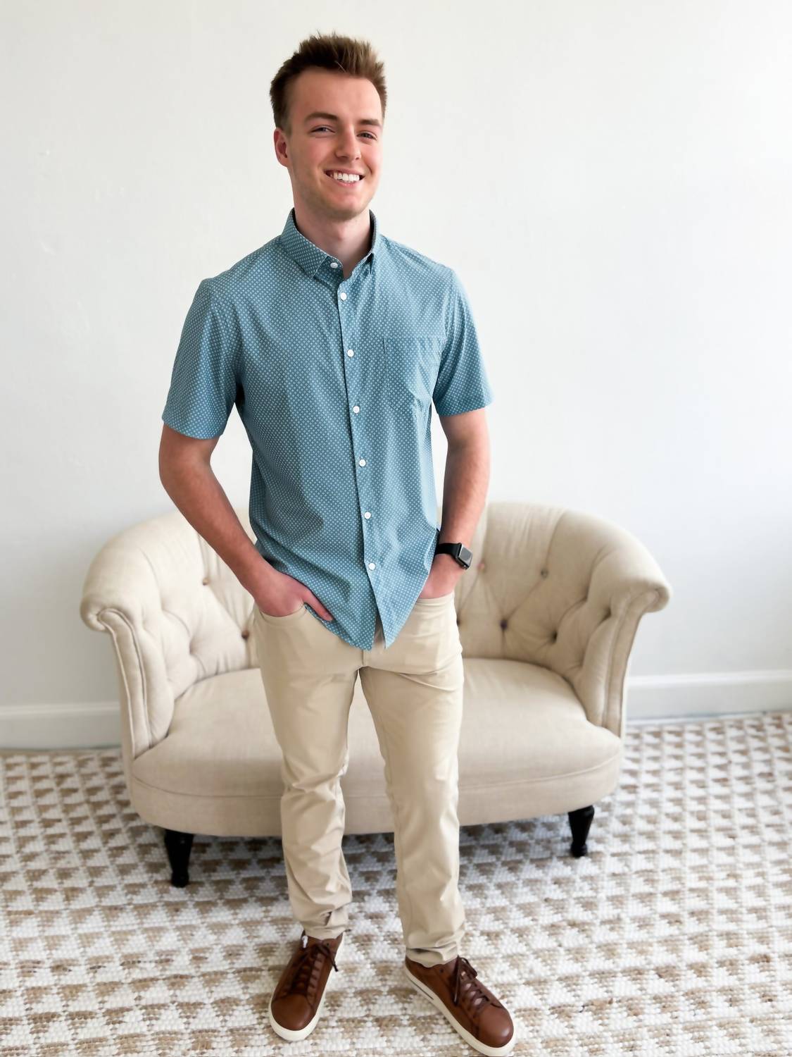 The Leeward Short Sleeve Shirt by Mizzen + Main in Pale Blue Clover is a perfect blend of function and style for the modern man. Crafted from breathable, lightweight polyester, this patterned shirt features a hidden button-down collar and back darts for a sleek fit. The short sleeves are specifically designed to be worn untucked, boasting a length 2 inches shorter than regular dress shirts. This wrinkle-resistant shirt offers 4-way stretch for comfort and is ideal for summer workwear or travel. Closure: Button closure. Care: Machine wash and line dry.