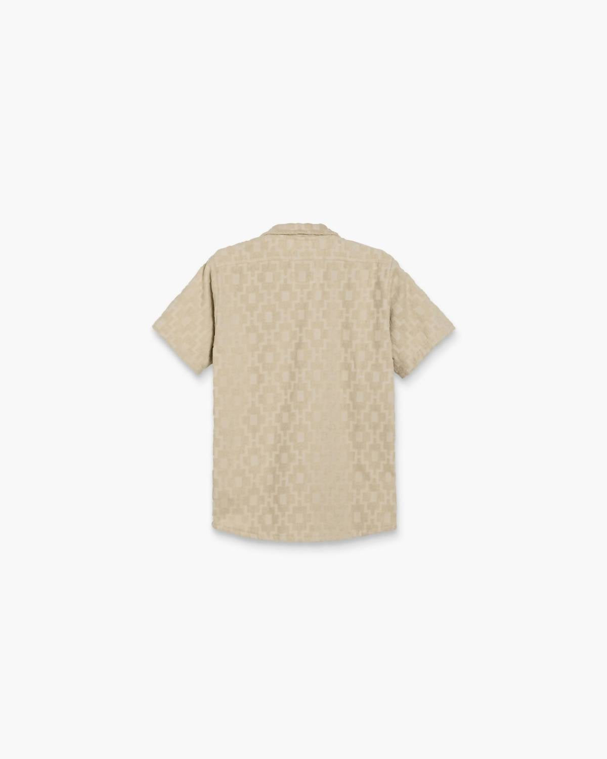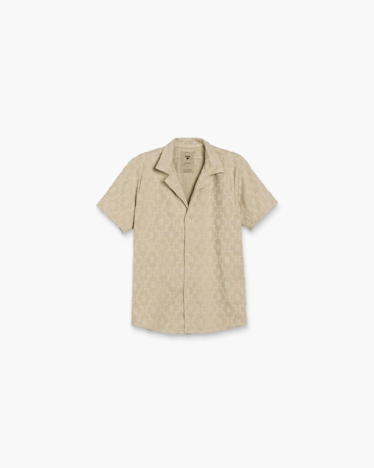 Your go-to summer essential, seamlessly blending style and comfort for a beach day or casual outing. Men's patterned shirt features a resort collar and short sleeves. Crafted from heavyweight, breathable jacquard-woven terrycloth made of 100% cotton in Portugal. Relaxed fit with slightly dropped shoulders and curved hemline offers effortless style. Button closure. Machine wash at 40°C inside out, avoid softeners, tumble dry on low, iron medium, and do not bleach or dry clean.