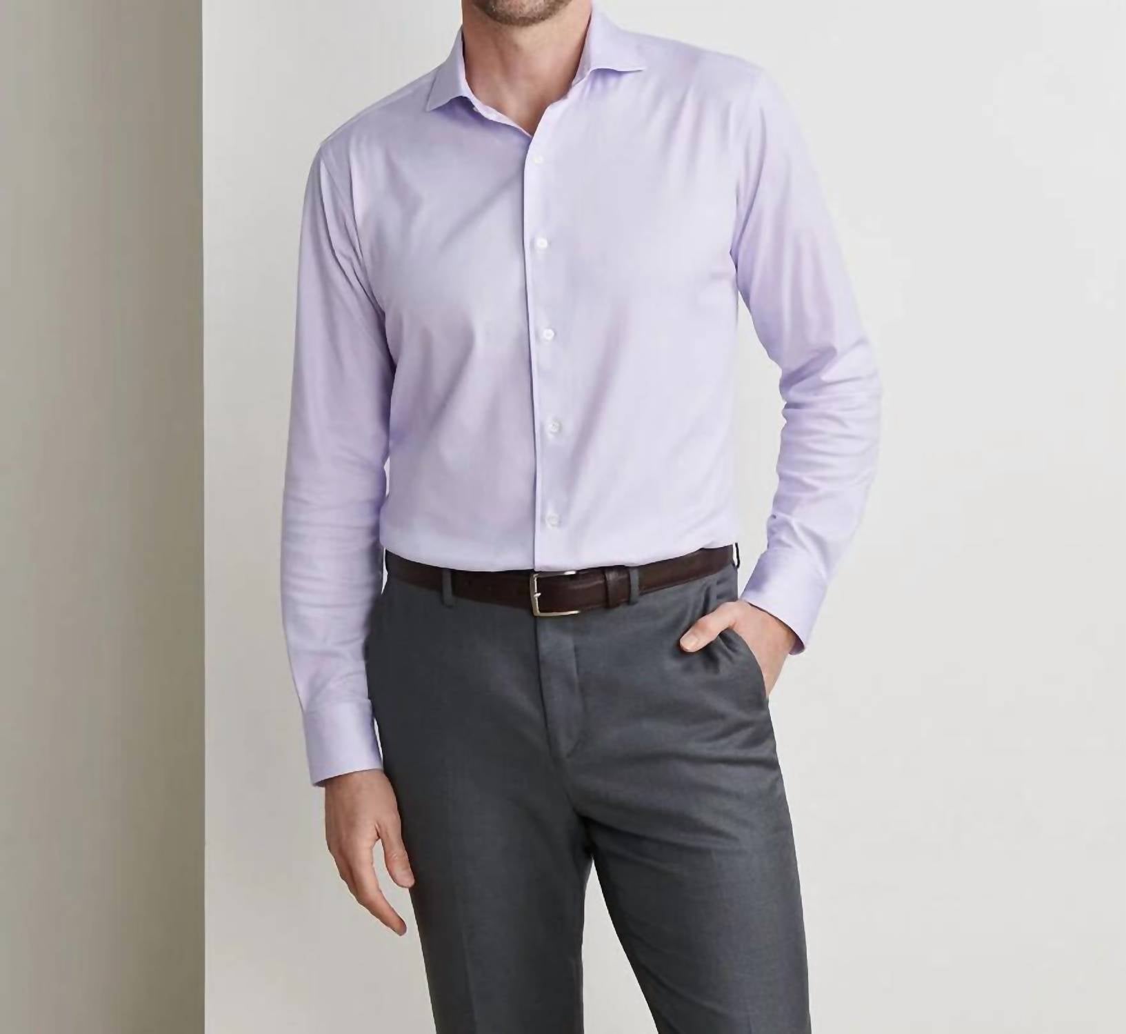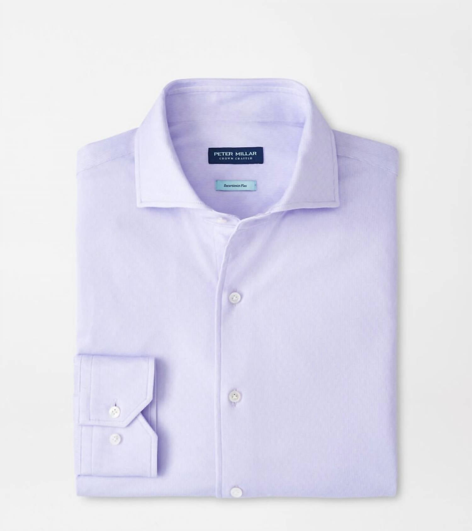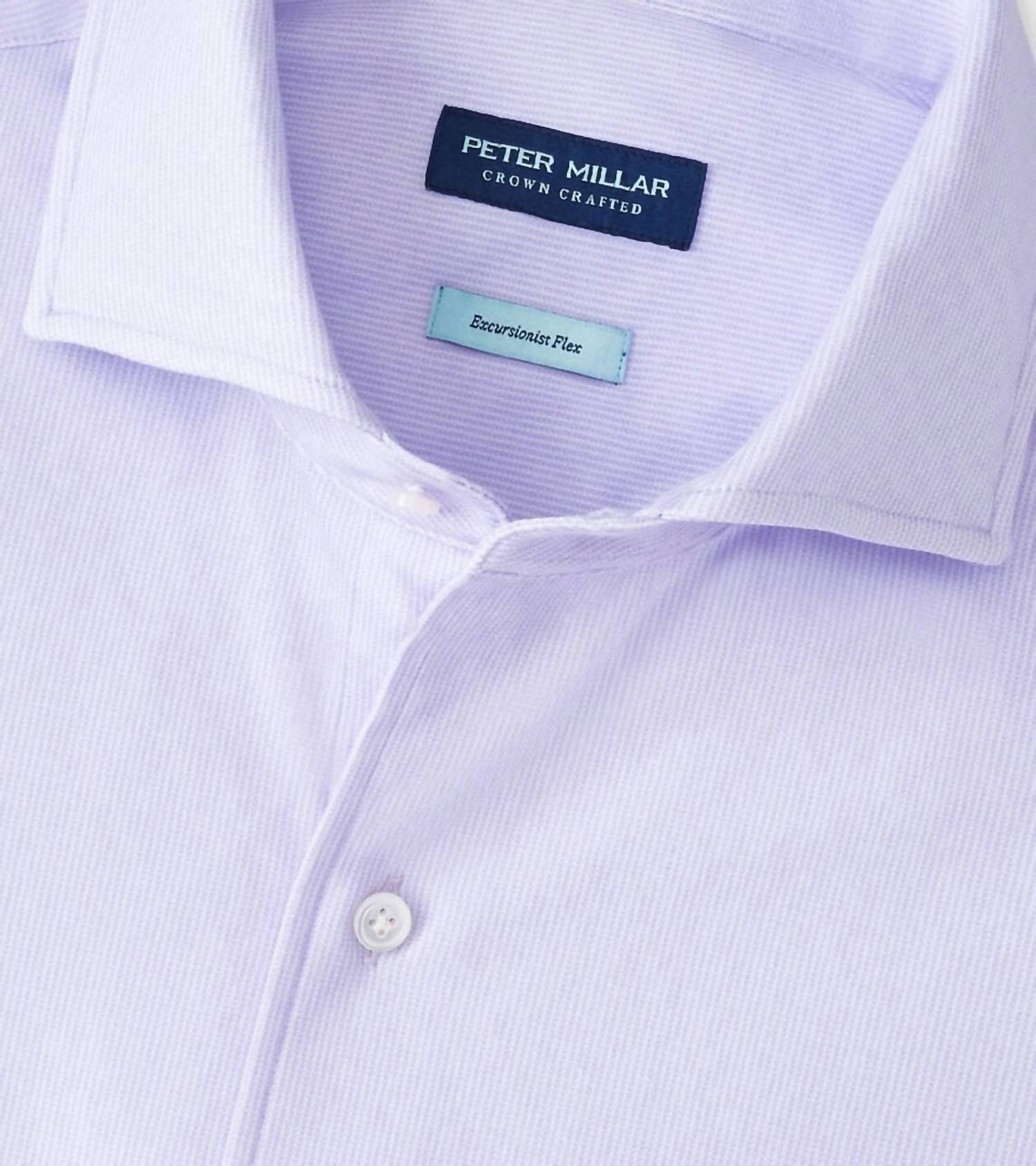 Experience unparalleled comfort with the Excursionist Flex Micro Print Sport Shirt by Peter Millar, tailored for the discerning gentleman. Featuring long sleeves and crafted from a luxurious 60% Cotton / 28% Nylon / 12% Spandex blend, this shirt delivers exceptional flexibility and a soft feel that rivals your favorite knit polo. Made with a textured pattern in wisteria, it incorporates a button closure and is wrinkle-resistant for a seamless transition from travel to dinner party. Care is simple with machine wash cold and lay flat to dry instructions. Model is 6'1" and is wearing a size Medium.