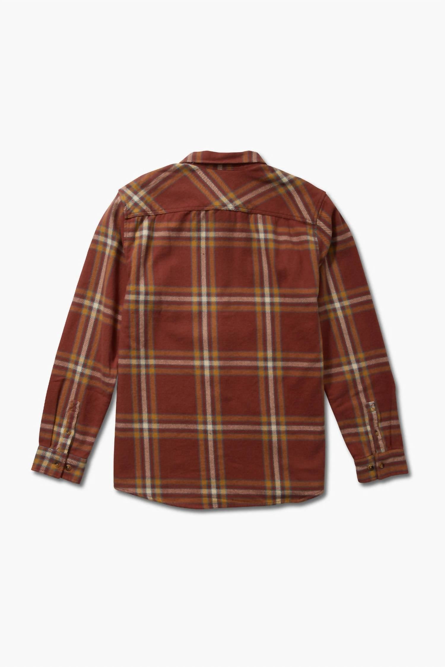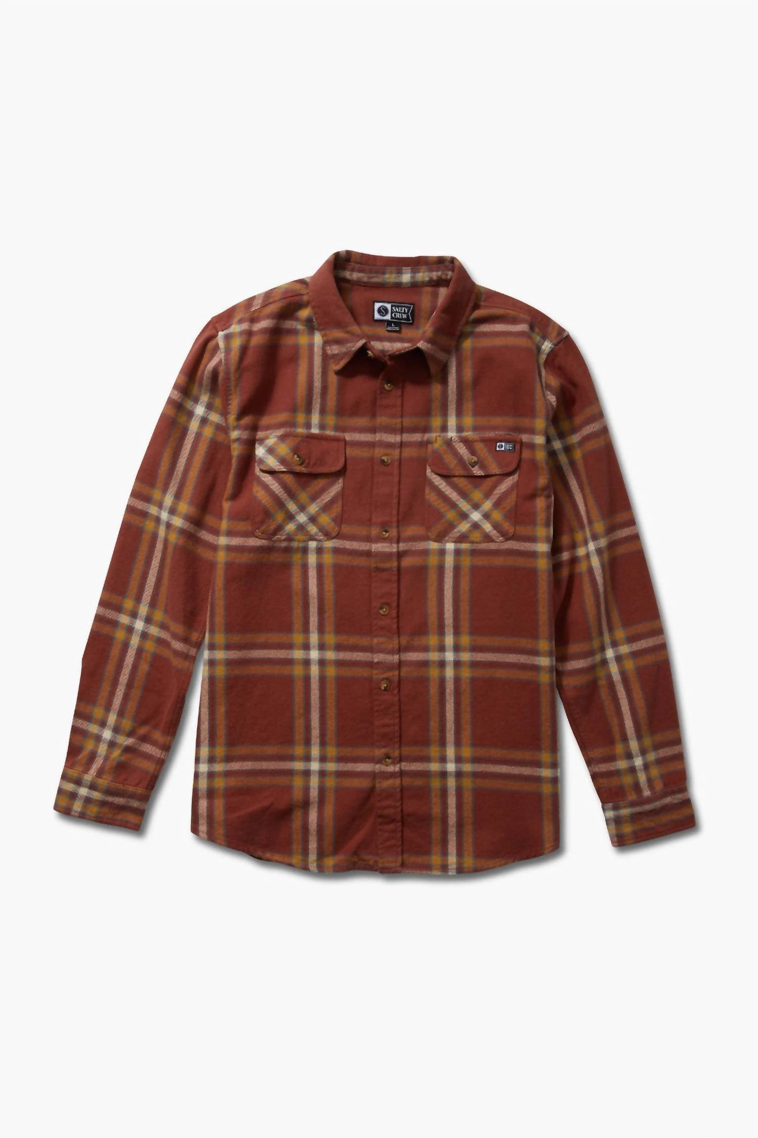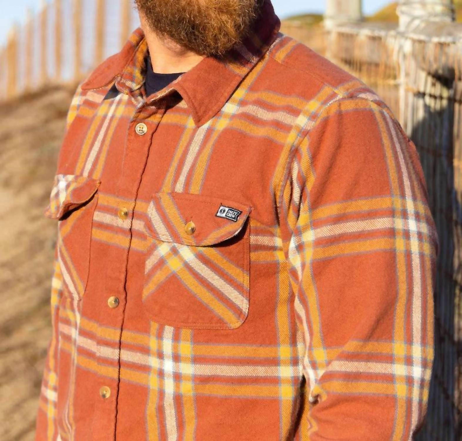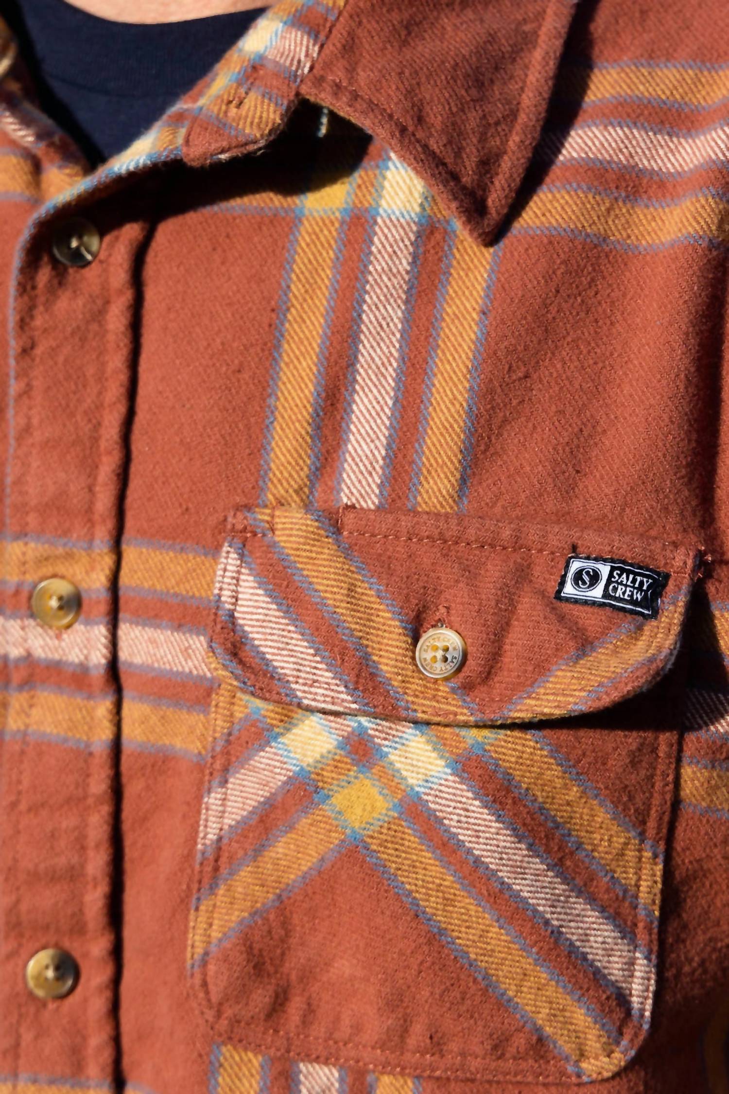 The Salty Crew Landfall Long Sleeve Flannel Top in a striking Brick Red offers a classic plaid and check pattern perfect for streetwear enthusiasts. Crafted from 100% heavyweight polyester twill, this flannel ensures durability and warmth, especially for Fall outings. Featuring dual chest pockets with buttoned flaps and branded swirl buttons, it combines style with functionality. For easy maintenance, it is machine washable and can be tumble dried.
