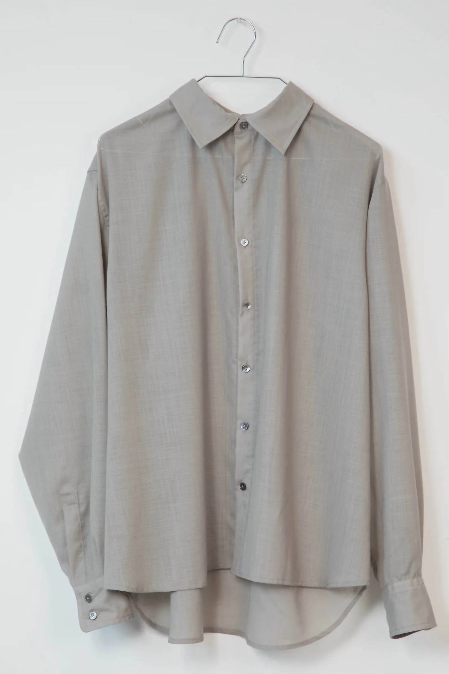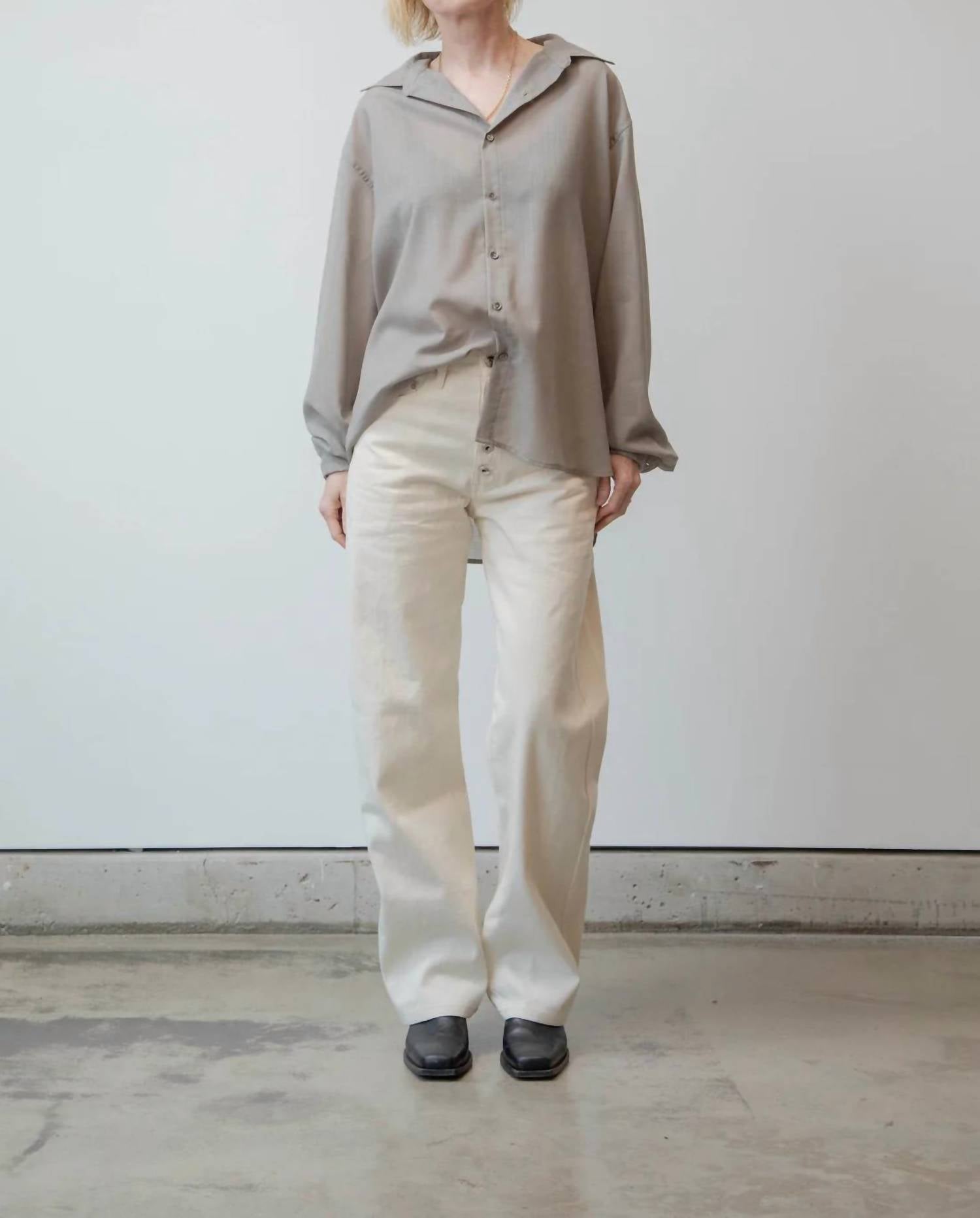 Introducing the Unisex Beck Button Down Shirt by Silphium Studio, a staple piece in taupe designed with a solid pattern for versatile wear. This shirt features long sleeves and is crafted entirely from 100% Wool Chally, ensuring a lightweight feel. Made in New York, it offers a refined silhouette with genuine shell buttons for closure. Care instructions include hand washing and line drying for longevity. Worn by Wini and Louis in size Small, this shirt exudes a modern workwear trend perfect for any casual or holiday event.