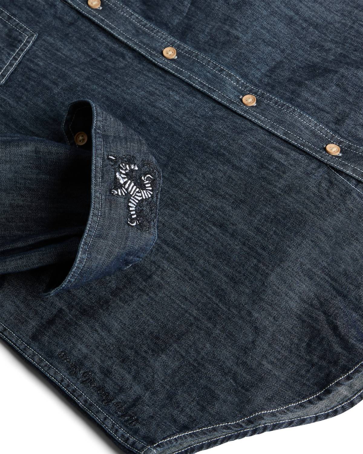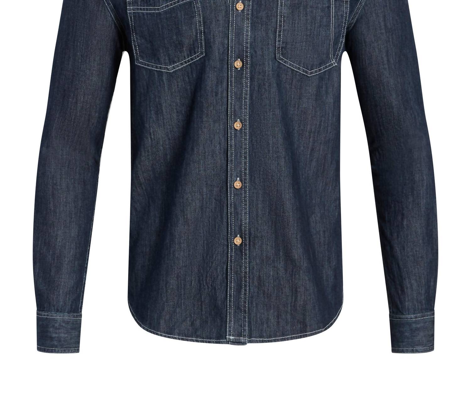 Elevate your casual style with the Men's Johnny Long Sleeve Button Down Shirt by Stock in a fashionable denim color. Tailored for the modern man, this shirt is crafted from a cotton blend composed of 97% cotton and 3% spandex, providing comfort and flexibility. With a classic collar and convenient button closure, it features a graphic pattern and practical pockets. Care is effortless with machine wash and tumble dry instructions, making it a perfect choice for travel and summer streetwear.