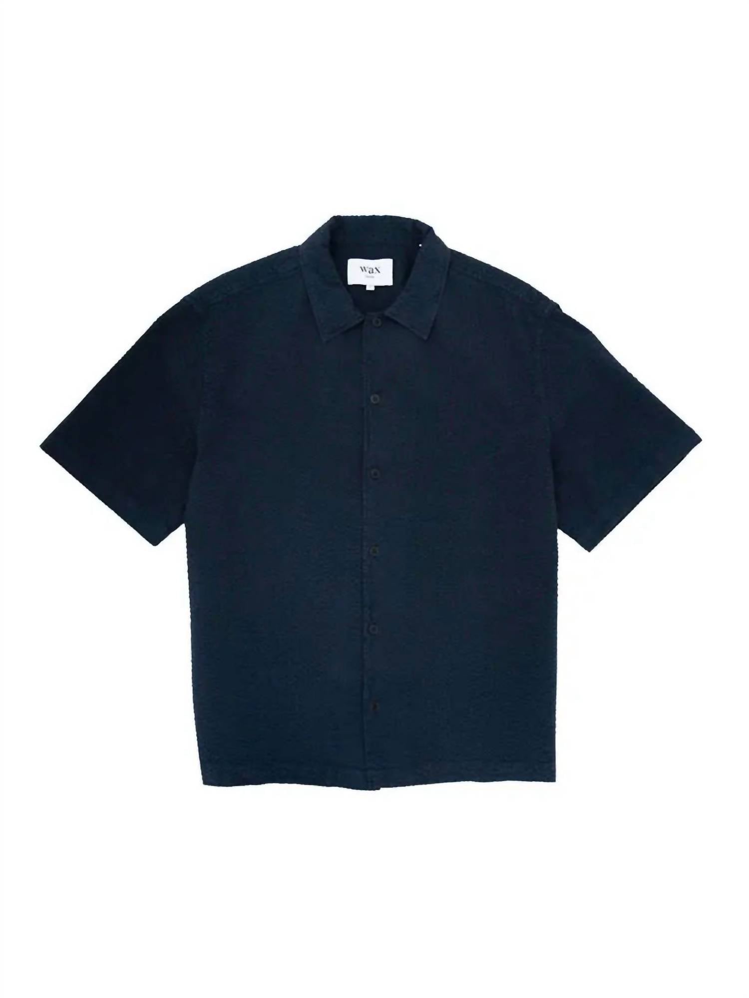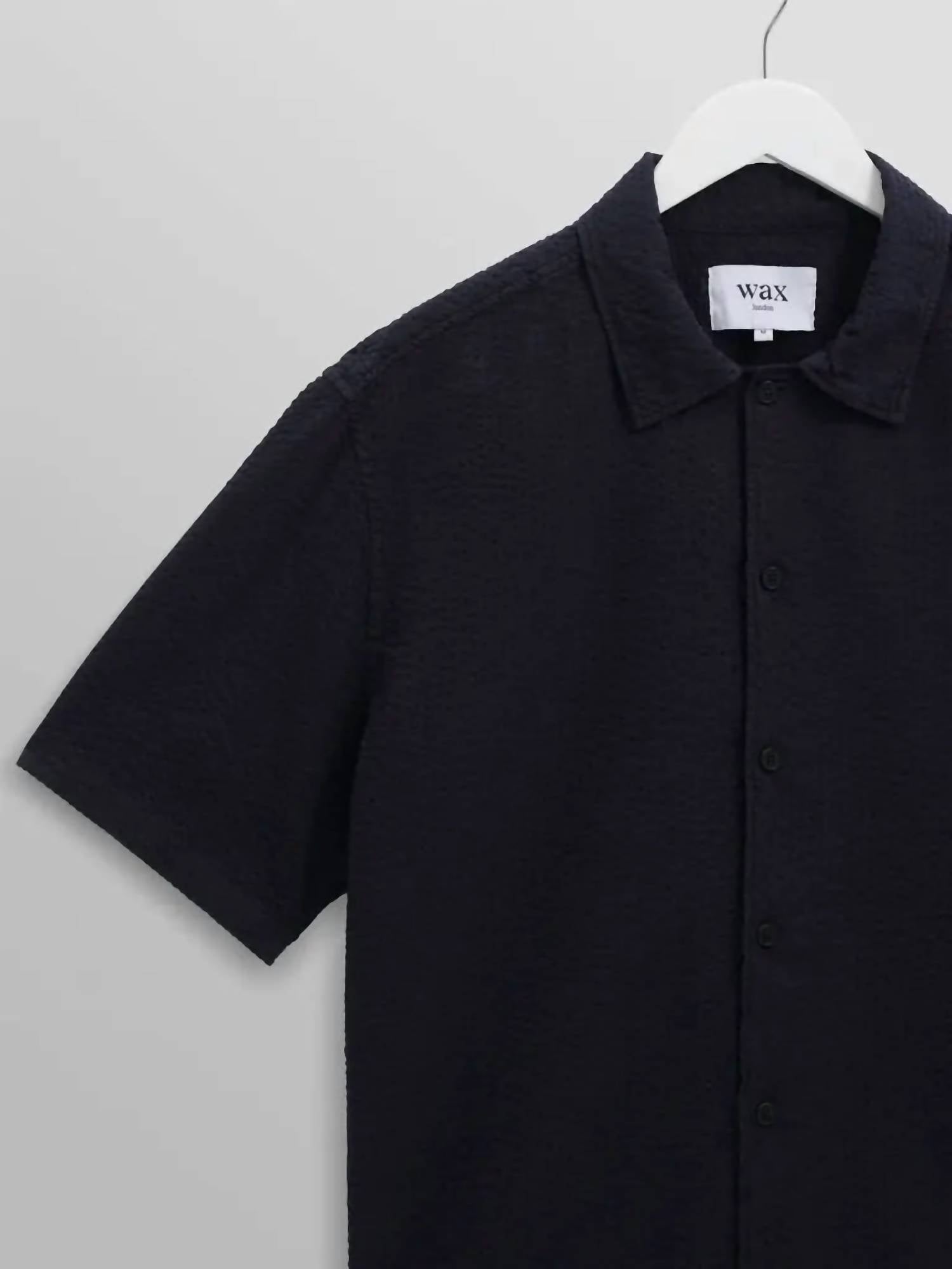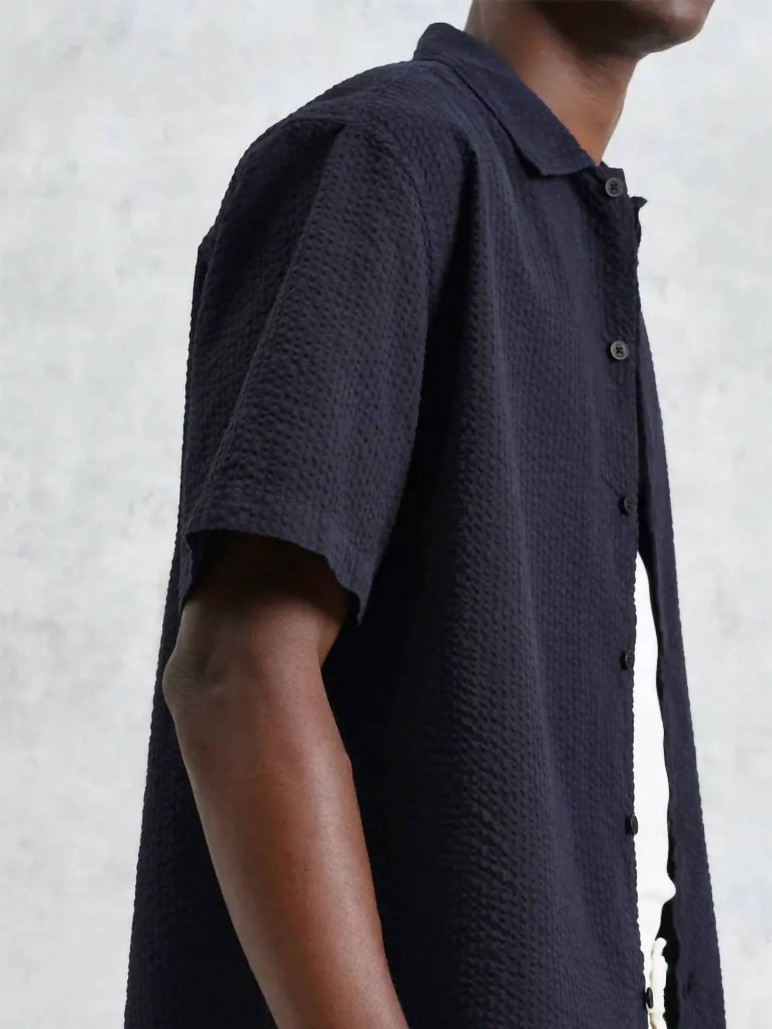 Embrace a classic look with the Keats Seersucker Shirt by Wax London in a refined navy hue. Designed with short sleeves and a one-piece collar, this shirt is made from 100% cotton seersucker, ensuring comfort and breathability. Featuring a button closure, its boxy cut is complemented by hem side splits and a straight hem for a relaxed fit. Originating from Tunisia, it's crafted for easy care with machine wash instructions.