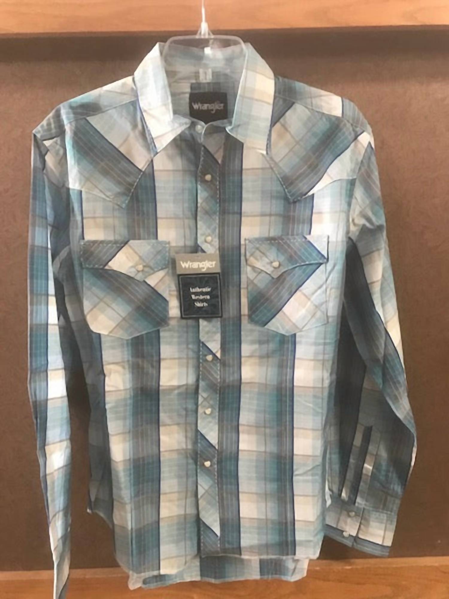 Meet the Dobby Western Snap Shirt by Wrangler, an ideal addition for your music festival ensemble with its maximalist plaid and check design in blue multi. This shirt is crafted from a cotton blend material, featuring long sleeves and a distinctive white pearl snap closure, highlighted by front and back white stitch yokes. Originating from casual button-down shirt trends, it includes practical pockets and a classic collar neckline. Easy to care for, simply machine wash and tumble dry to keep it looking fresh.