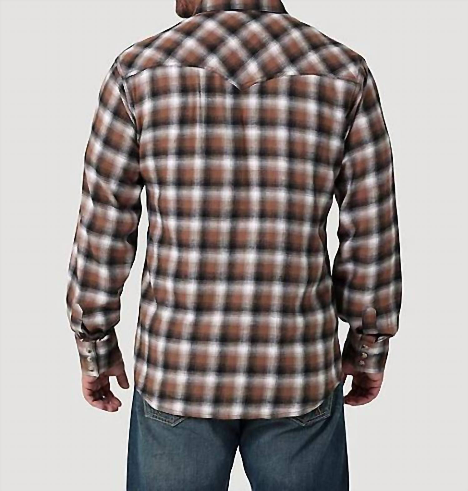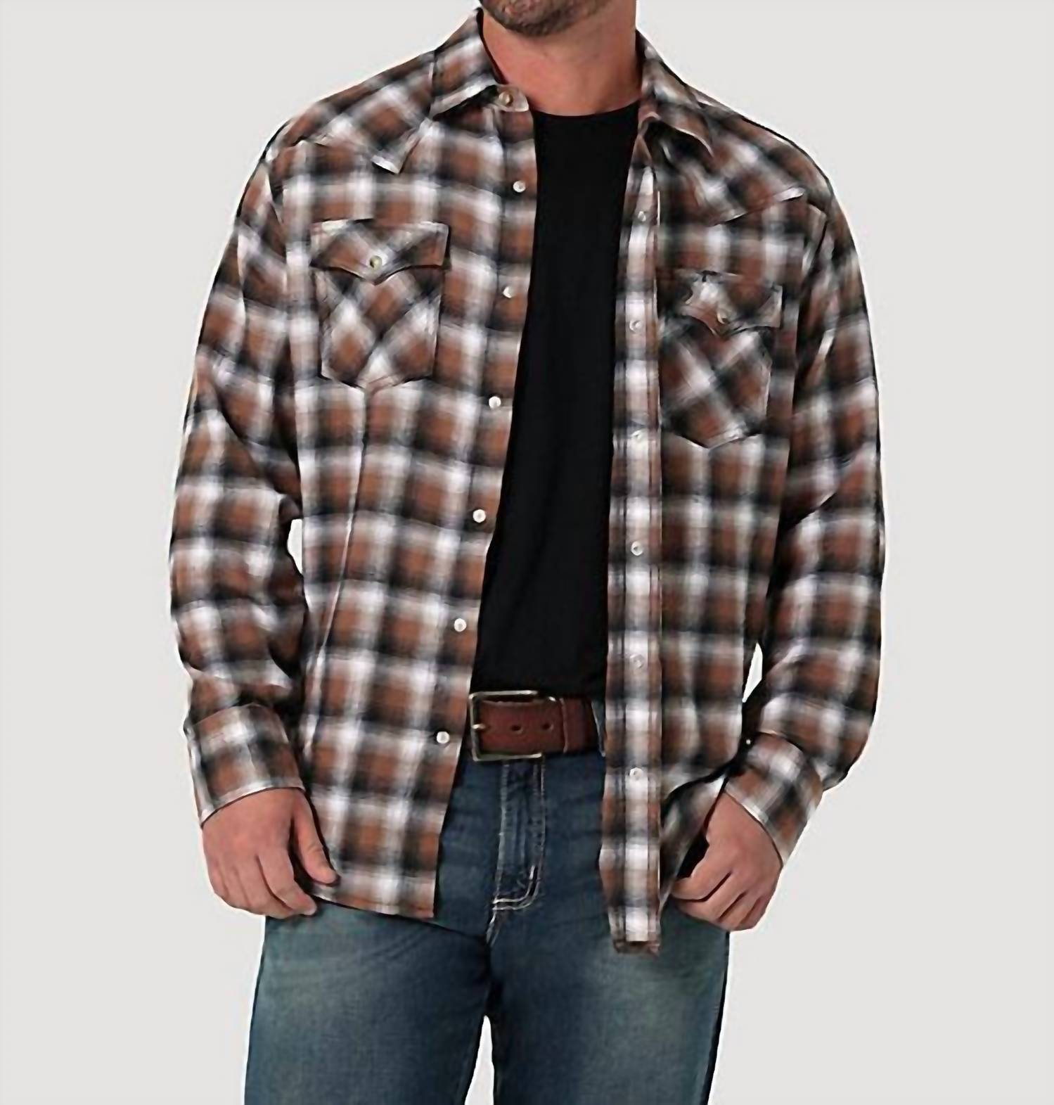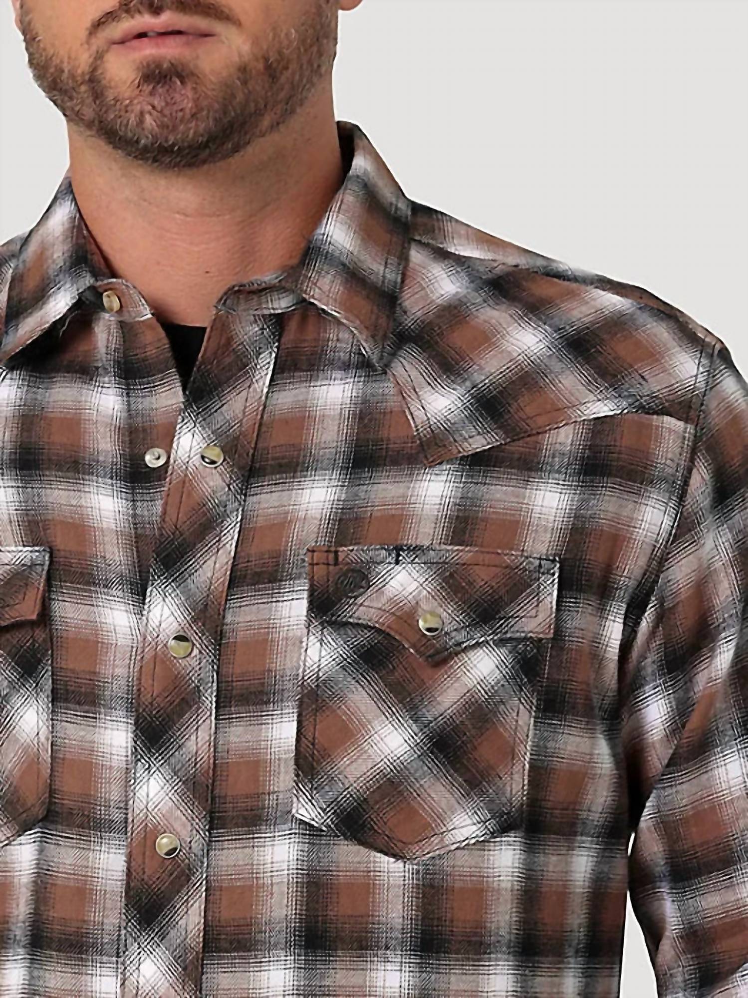 Elevate your fall wardrobe with the Wrangler Flannel Shirt in Aztec Brown, a nod to Western heritage with a modern twist. Designed with long sleeves and a spread collar, this men's shirt boasts a classic plaid pattern for a timeless look. Made from 100% soft cotton, it's lightweight and breathable, making it perfect for layering. Closure is via snap buttons, including snaps on the two chest flap pockets, adding function to style.