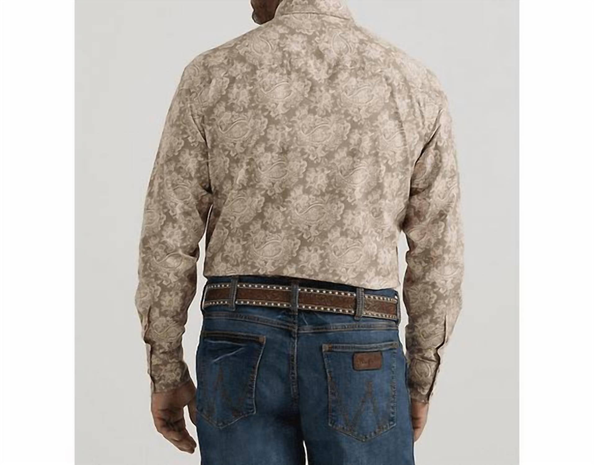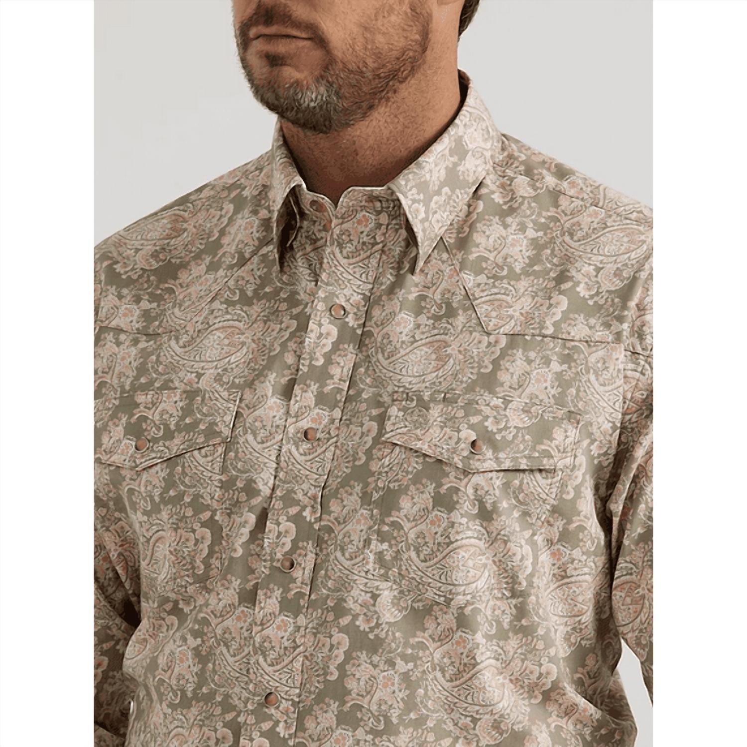 Embrace a relaxed boho chic vibe with the George Strait Collection Long Sleeve Shirt by Wrangler. This men's casual button-down features a striking paisley pattern in olive and peach. Made from quality cotton, it offers a comfortable wear ideal for summer vacations. Closure is handled with a classic button-up, complete with pockets and a collar neckline for added style.