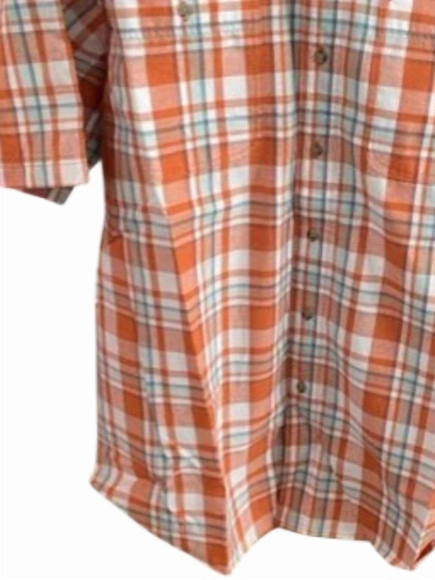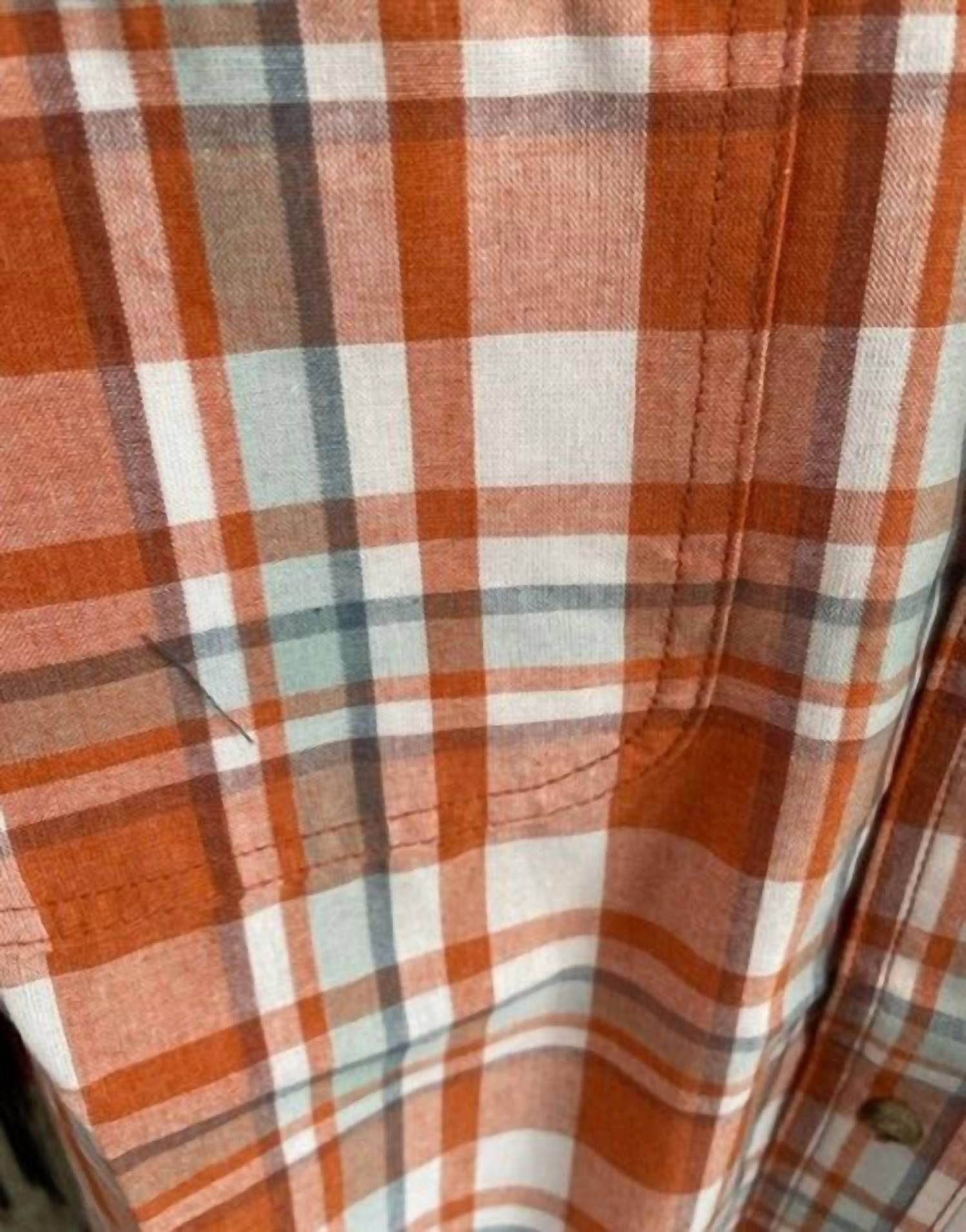 Meet the Men's Short Sleeve Plaid Button Up Shirt by Wrangler, the perfect blend of style and practicality in a vibrant orange hue. Designed with short sleeves and a comfortable collar, this shirt features a classic plaid pattern and convenient pockets. Composition: 55% Cotton, 45% Polyester, this cotton blend offers easy care and durability for travel and spring occasions. Closure: Button closure. Celebrate Father’s Day with a touch of Western flair.