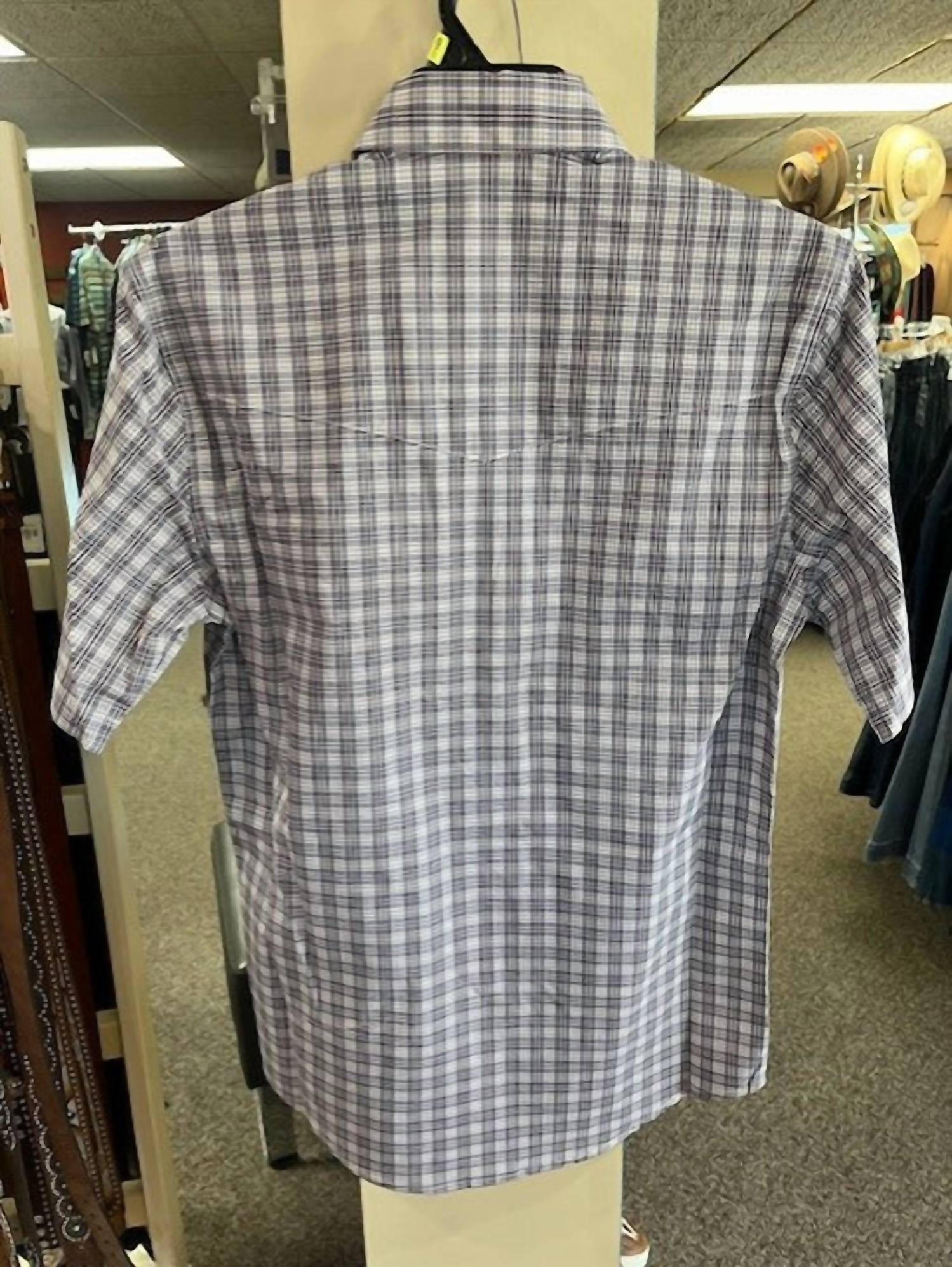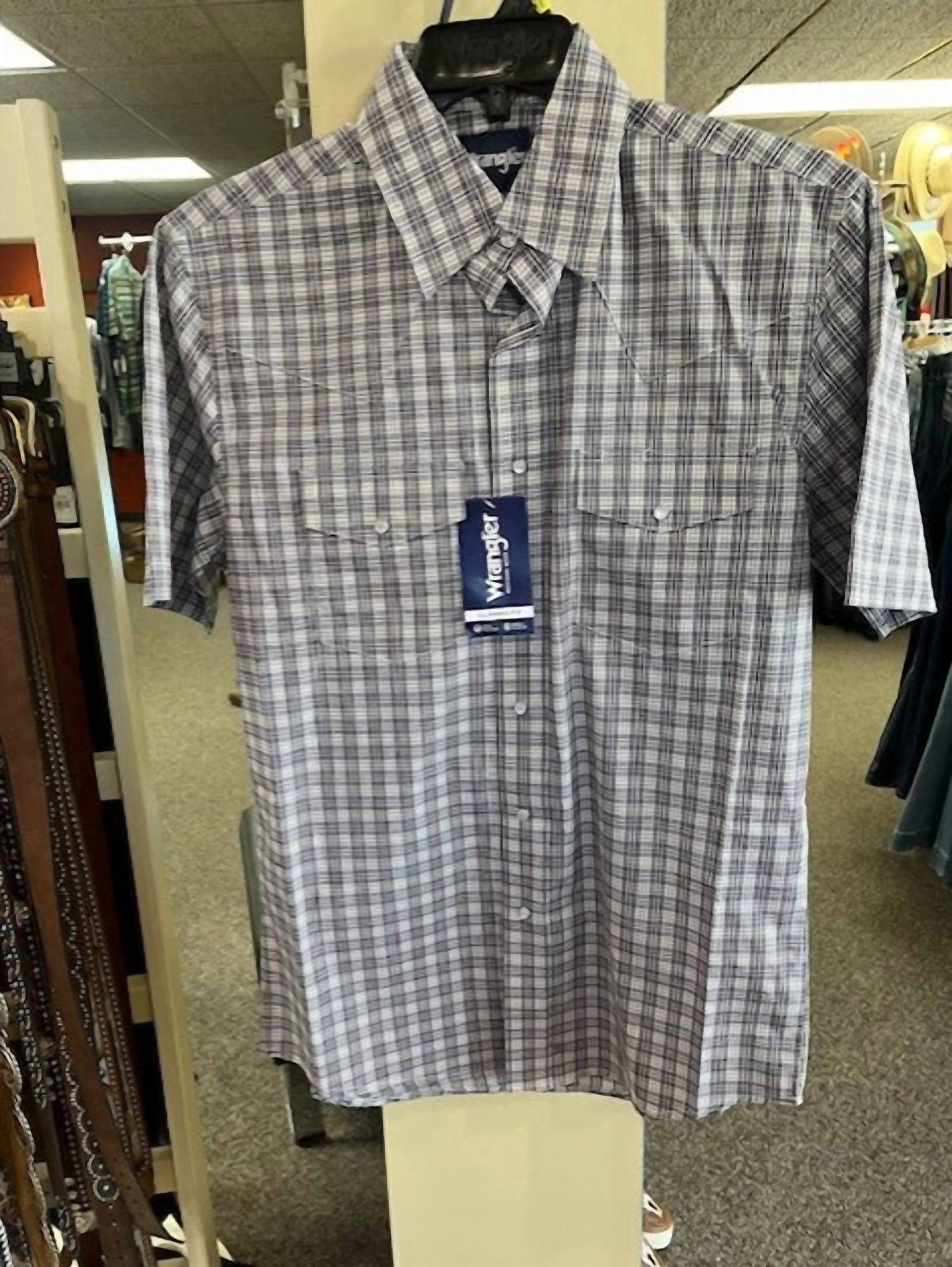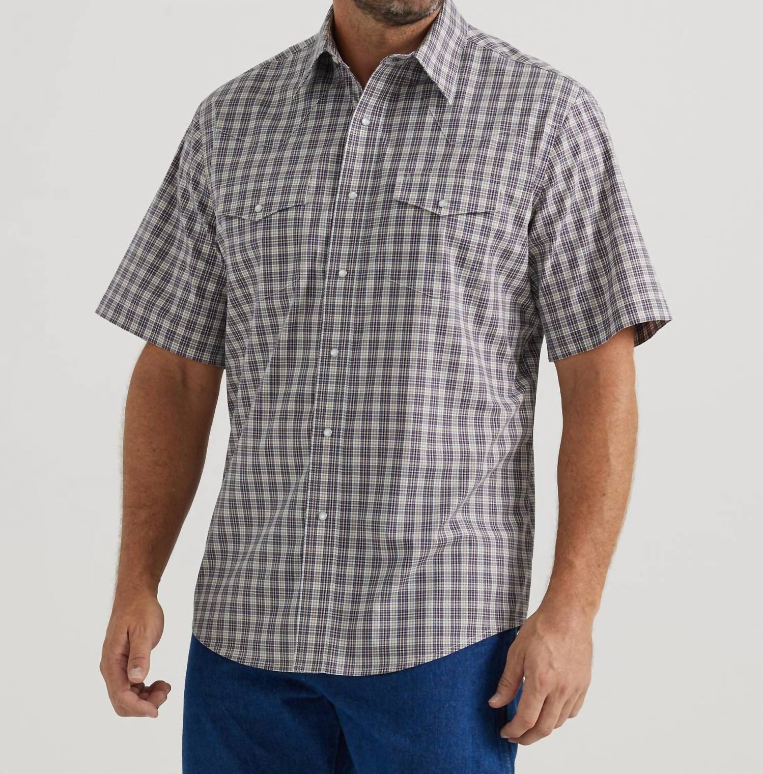 Meet the Wrangler Short Sleeve Western Snap Shirt in Plum Plaid, an essential for effortless style with a touch of Western flair. Designed for comfort and durability, this shirt features a spread collar, authentic Western yokes, and flap pockets with snap closures, including a handy pencil slot on the left pocket. Crafted from a stretchy and wrinkle-resistant blend of 64% cotton, 34% recycled polyester, and 2% spandex, it ensures ease of movement and easy care. Closure: Snap closure. Care: Machine wash.