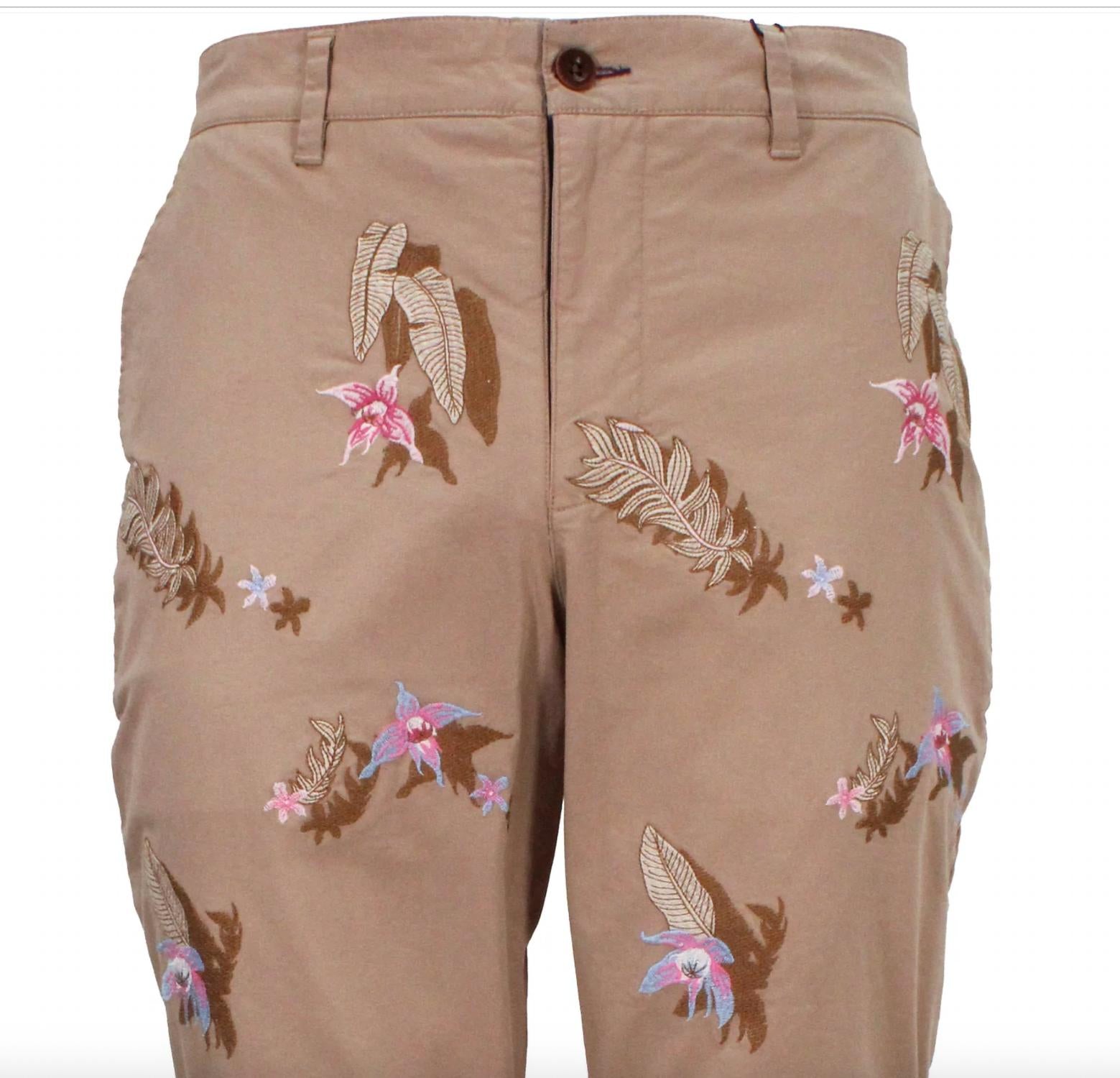 We've developed a pattern for making trousers that look and feel amazing. This flat front pant is made of a luxurious smooth butter fabric in peached stretch twill for a fit and comfort our customers love. It's also printed with gorgeous patterns that don't shy away from fun Flat Front 32 inseam 97% Cotton / 3% Spandex