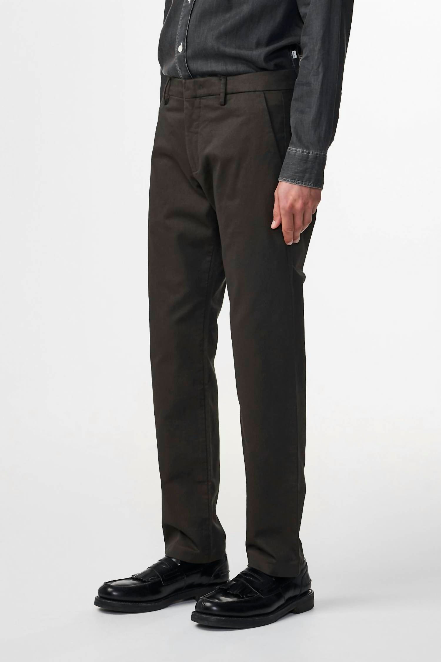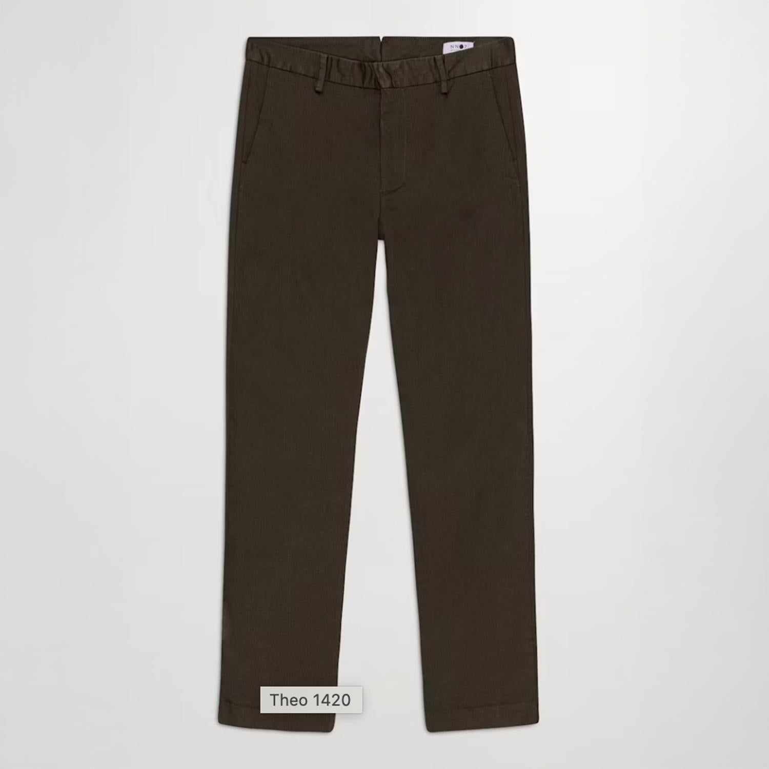 Introducing the Theo Chino Straight Pants by NN07, an elegant choice in Dark Army for the discerning man. These slim-fit chinos feature a tapered leg and a crisp crease, crafted from a 99% soft and sustainable 260 g/m² organic cotton blend with 1% elastane. The design includes tailored details such as a Cobrax hook and eye closure and practical welt pockets. Made in Turkey, they offer a modern mid-rise waist and are easy to care for with machine wash instructions. Ideal for travel and streetwear, they embody the perfect balance of style and comfort.