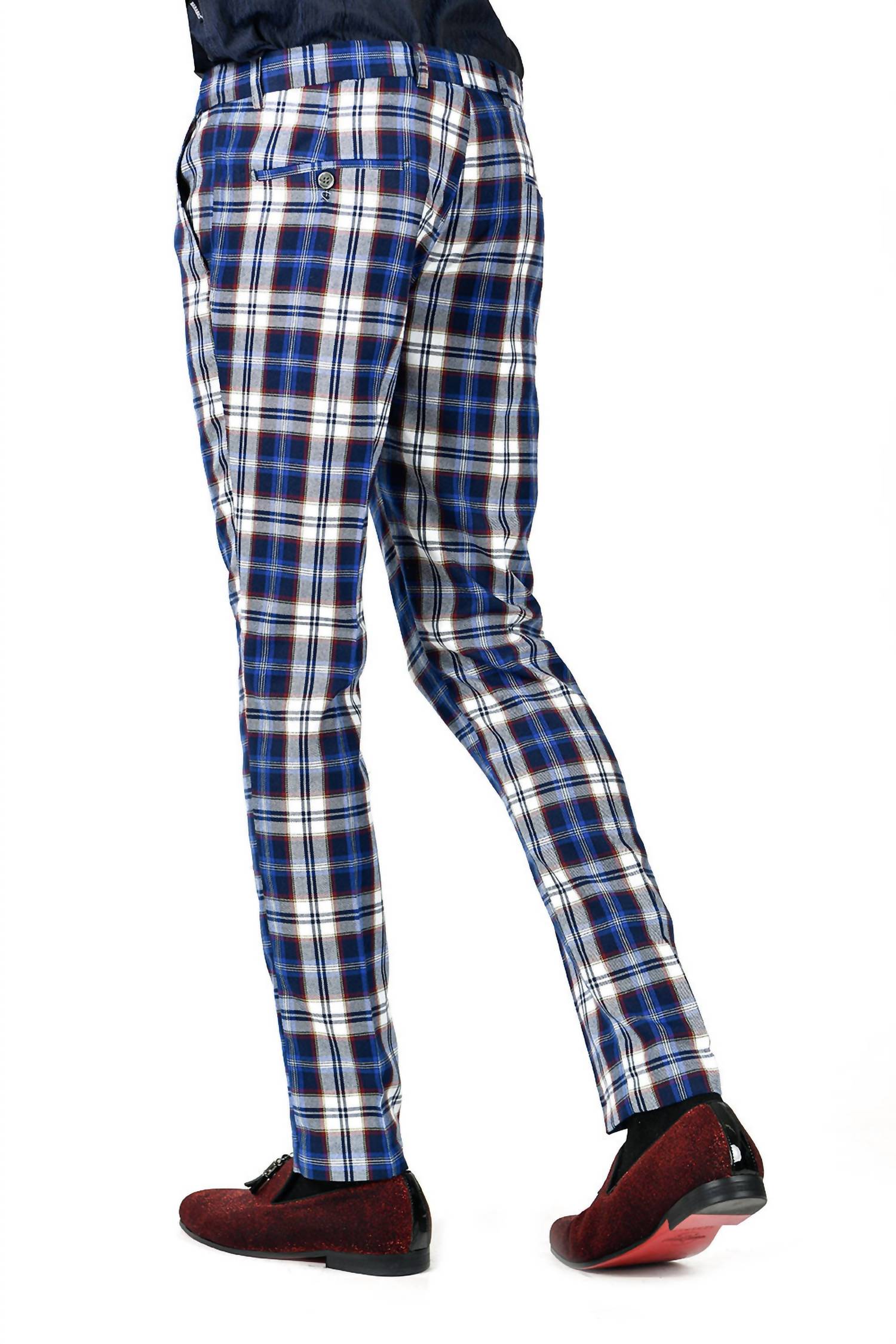 Introducing the Do It Pants by BARABAS, designed for the modern man seeking both style and comfort. These blue and white checkered plaid chino pants feature a slim fit with a straight leg and an innovative elastic waistband for added stretch. Crafted from a lightweight cotton blend (97% Cotton, 3% Spandex), they are perfect for casual and formal settings. Closure is a button type, and they are machine washable, featuring an inseam of 32 inches.