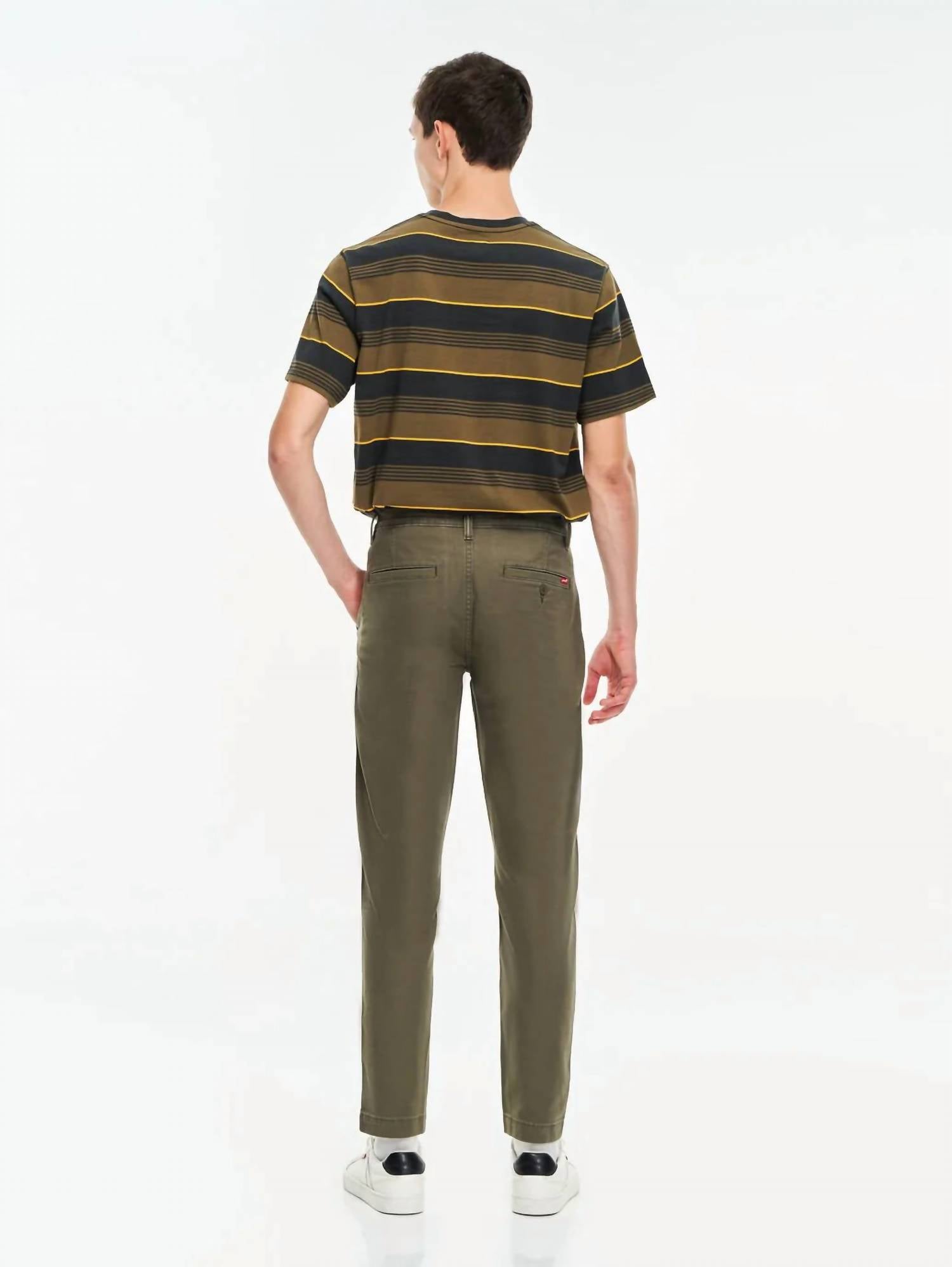 Introducing the Chino Standard Taper Pants by LEVI'S, a preppy wardrobe essential crafted from 98% Cotton and 2% Elastane for a soft and stretchy fit. These Olive Night chinos feature a mid-rise waist and a tapered leg, delivering a clean and modern silhouette. Designed with practical slanted front pockets, welt back pockets, and a hidden interior zip pocket, they provide style and functionality with a zip closure. Easy to care for, simply machine wash and line dry to maintain their vintage feel.