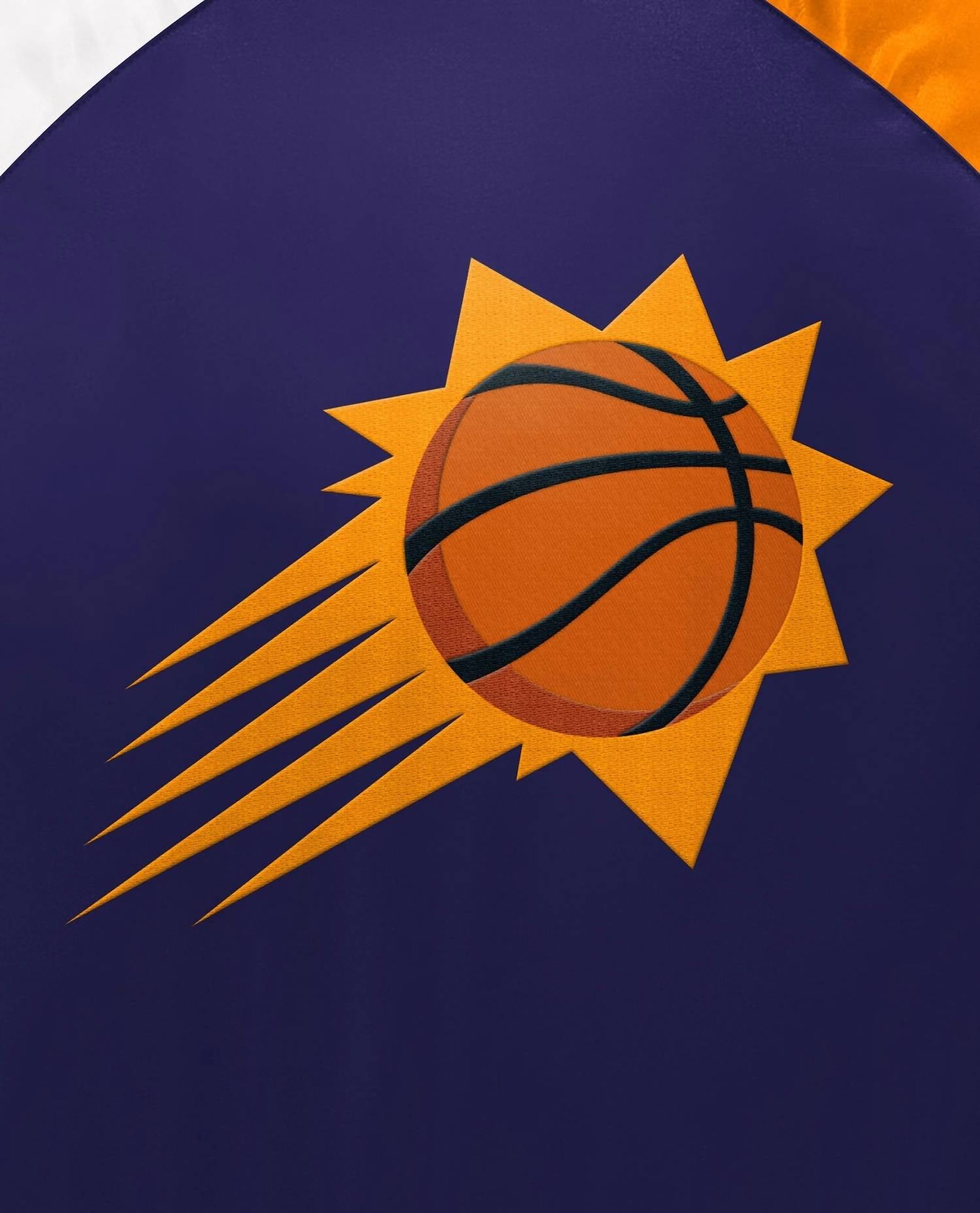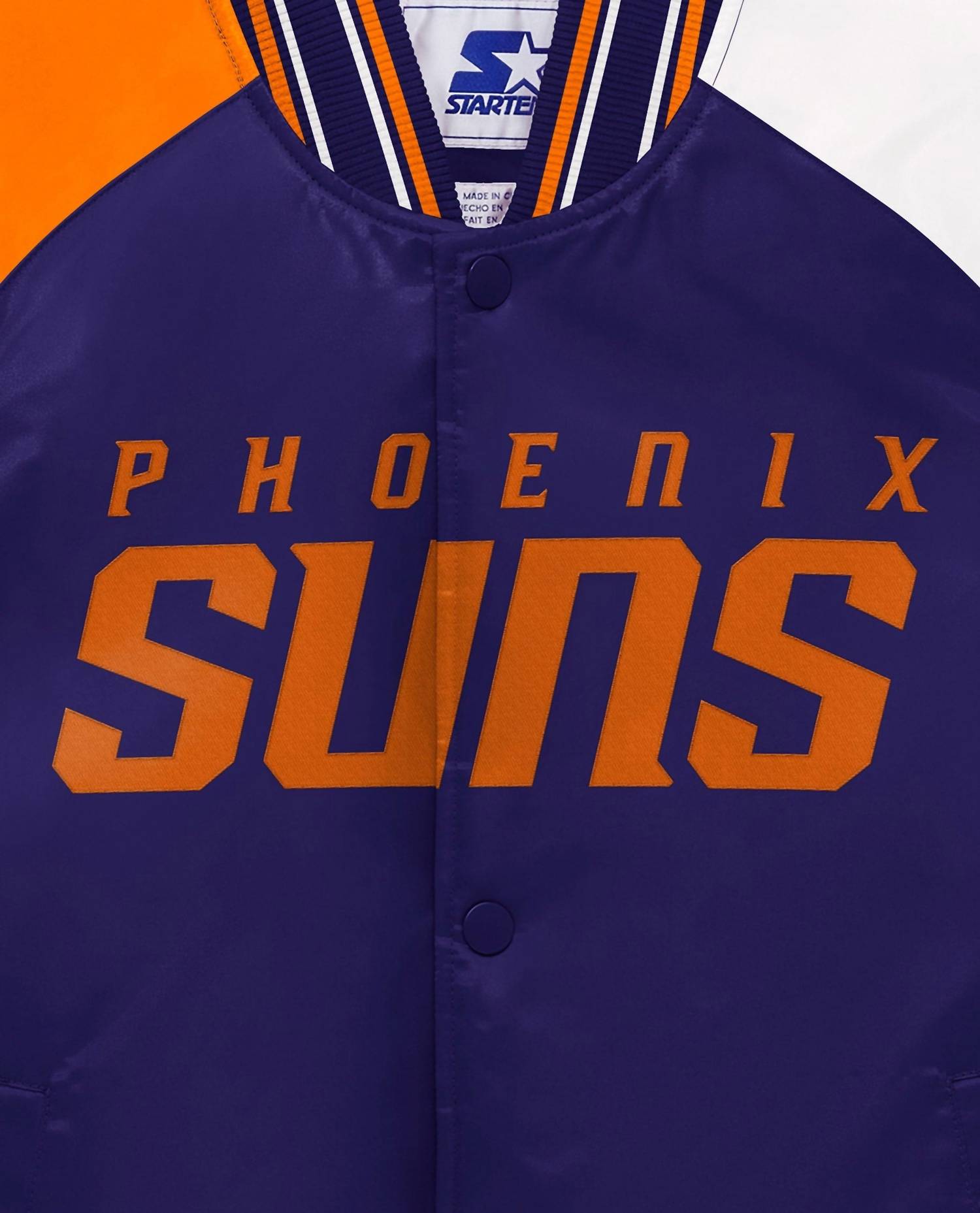 Step out in style with the Youth Phoenix Suns Varsity Satin Full-snap Jacket by Starter, perfect for any fan. This long sleeve jacket in primary team colors features a striking graphic pattern with a team wordmark in twill applique across the chest and team logos on the sleeve and back. Made from luxurious satin, it has a classic collar and convenient snap closure for added ease. Enjoy the energy of the game with this stylish yet functional piece.