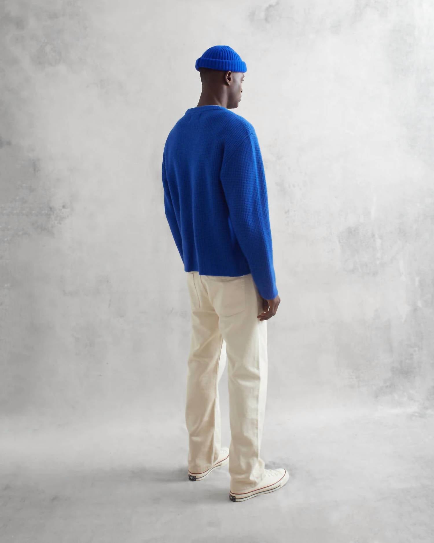 Introducing the Wilde Crew Sweater by Wax London, a versatile blue piece perfect for the cooler months. This men's sweater is designed with a relaxed boxy fit and features long sleeves and a crewneck, making it ideal for layering. Crafted from a textured wool blend, it offers warmth and style in a solid pattern. Easy to wear with a pull-on closure, it requires dry cleaning to maintain its quality.