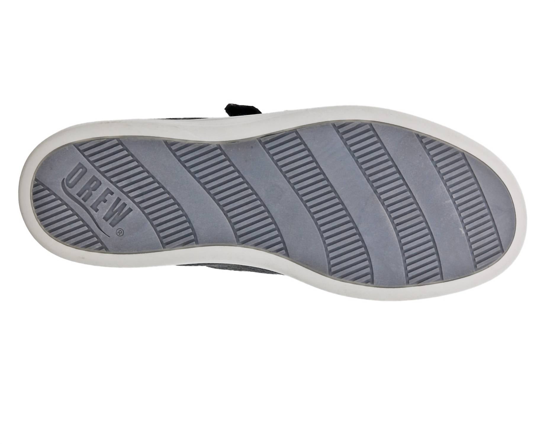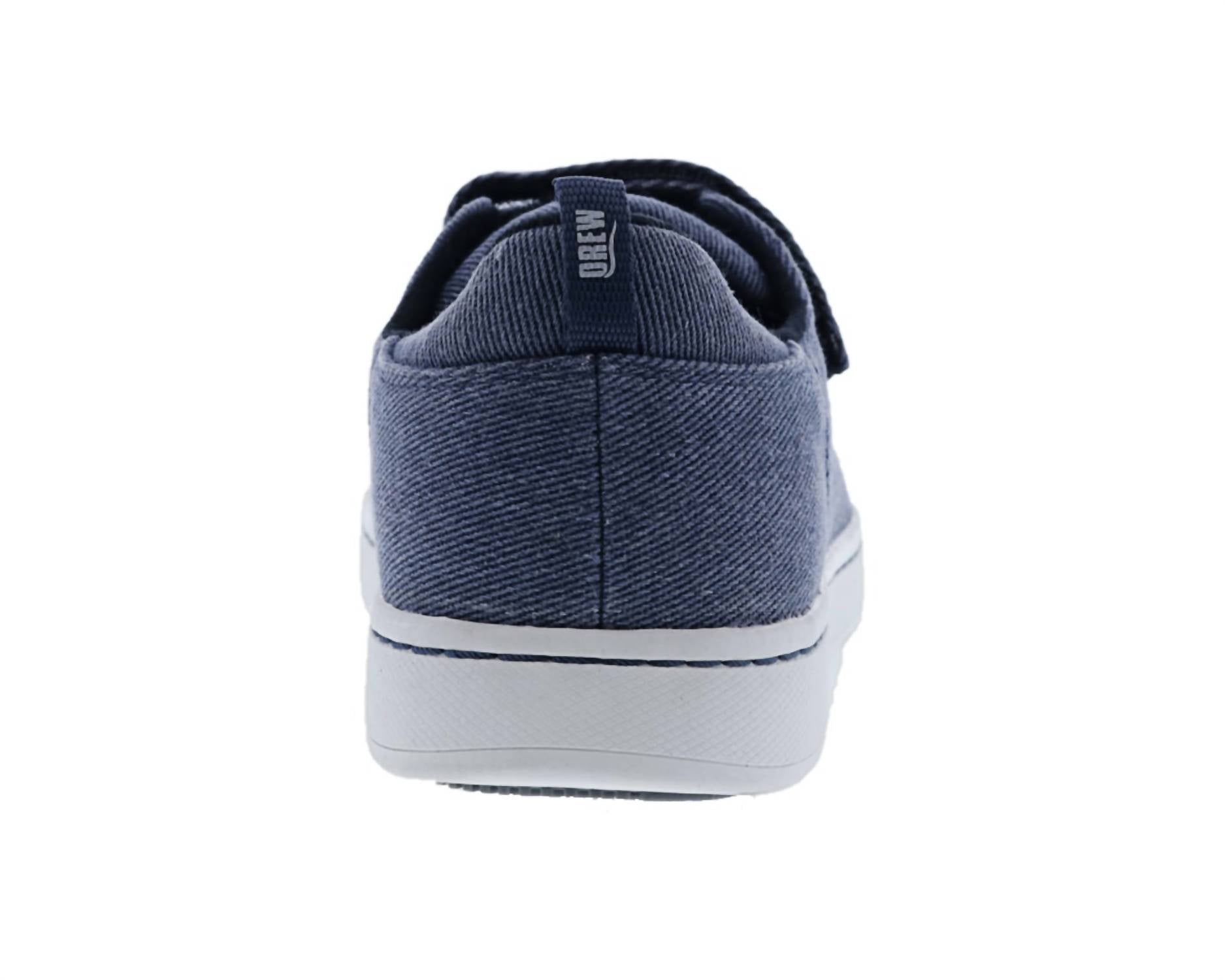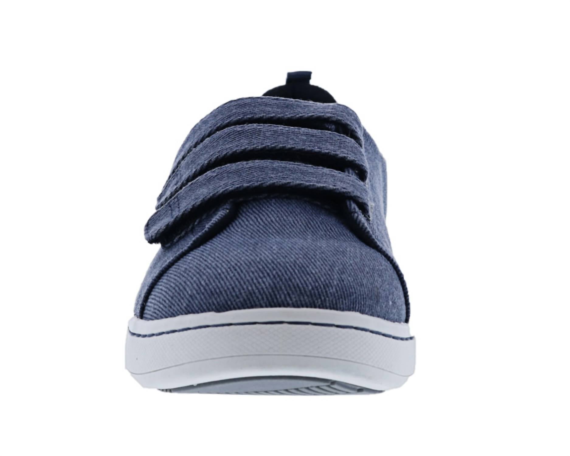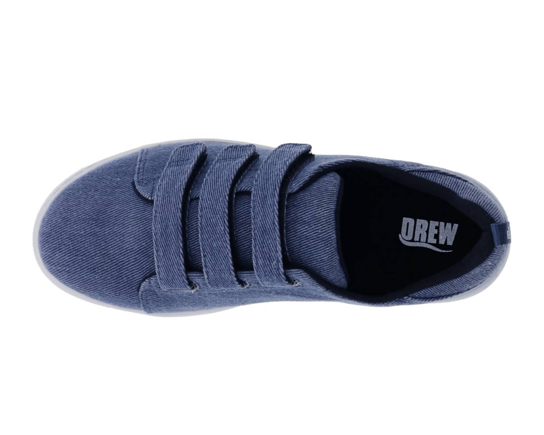 Discover the Men's Ski Strap Sneakers by Drew Shoes, expertly crafted for men seeking both style and comfort. Constructed from denim, these navy flats boast three adjustable straps for effortless wear. They feature a vulcanized rubber outsole ensuring superior traction and durability, complemented by a 1-inch flat heel. Equipped with a Plus Fitting System® that includes two removable footbeds, Drilex® Lining, a tempered steel shank, and the ability to accommodate prescribed orthotics, these sneakers offer exceptional customization.