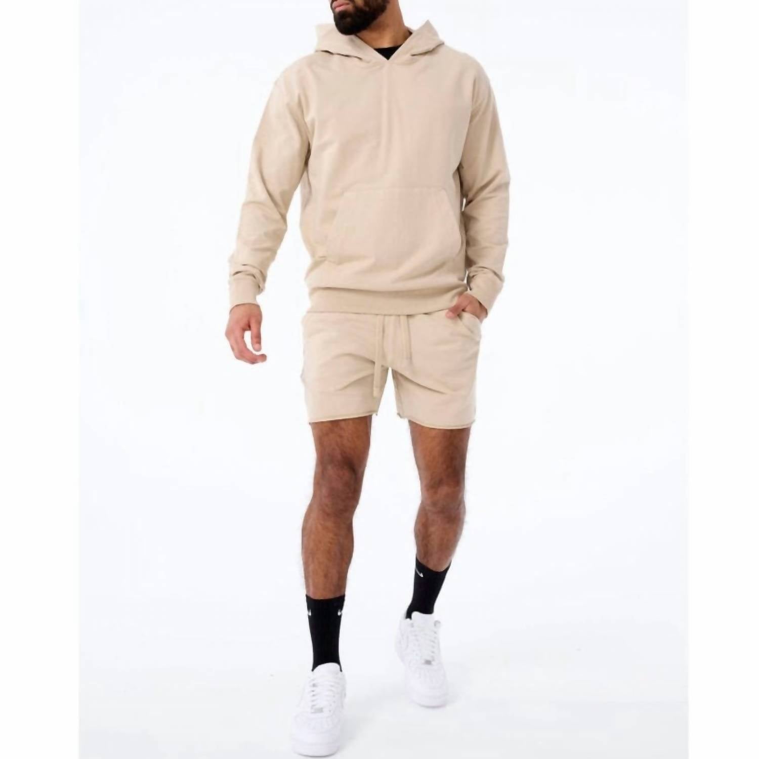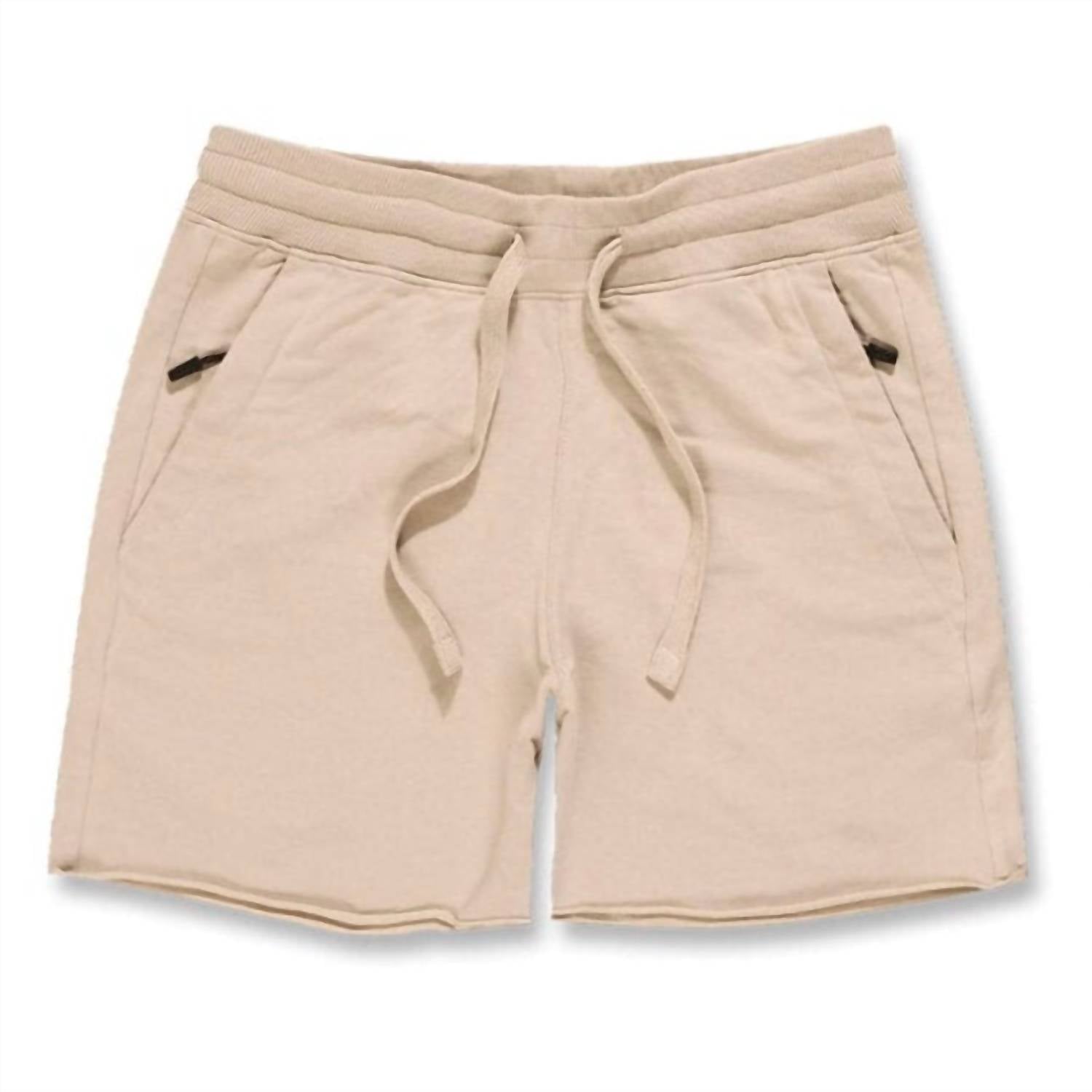 Athletic short silhouette. 5.75" inseam. Dual pockets at sides with hidden zipper opening. Back wallet pocket. Tonal adjustable drawstrings. Raw edge at leg opening. 95% French Terry Cotton, 5% Spandex. 275 GSM.