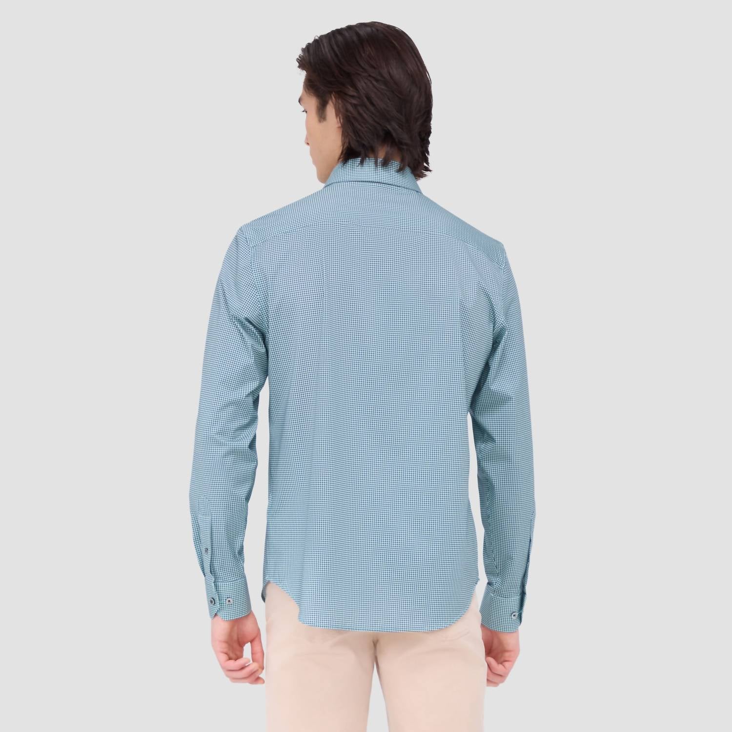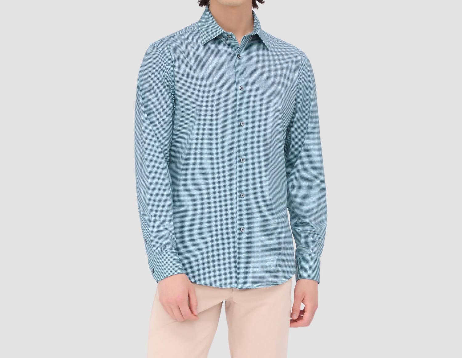 Meet the BUGATCHI James Illusion OoohCotton® Shirt for men, a menthol-hued dress shirt designed for the modern wardrobe. This long sleeve shirt is crafted from a high-performance Cotton blend, showcasing a distinctive geometric pattern. With a refined point collar and button closure featuring mother-of-pearl buttons, this shirt delivers both sophistication and ease. Care instructions include machine wash with a lay-flat-to-dry finish, ensuring effortless maintenance while you enjoy its breathable, wrinkle-resistant comfort.