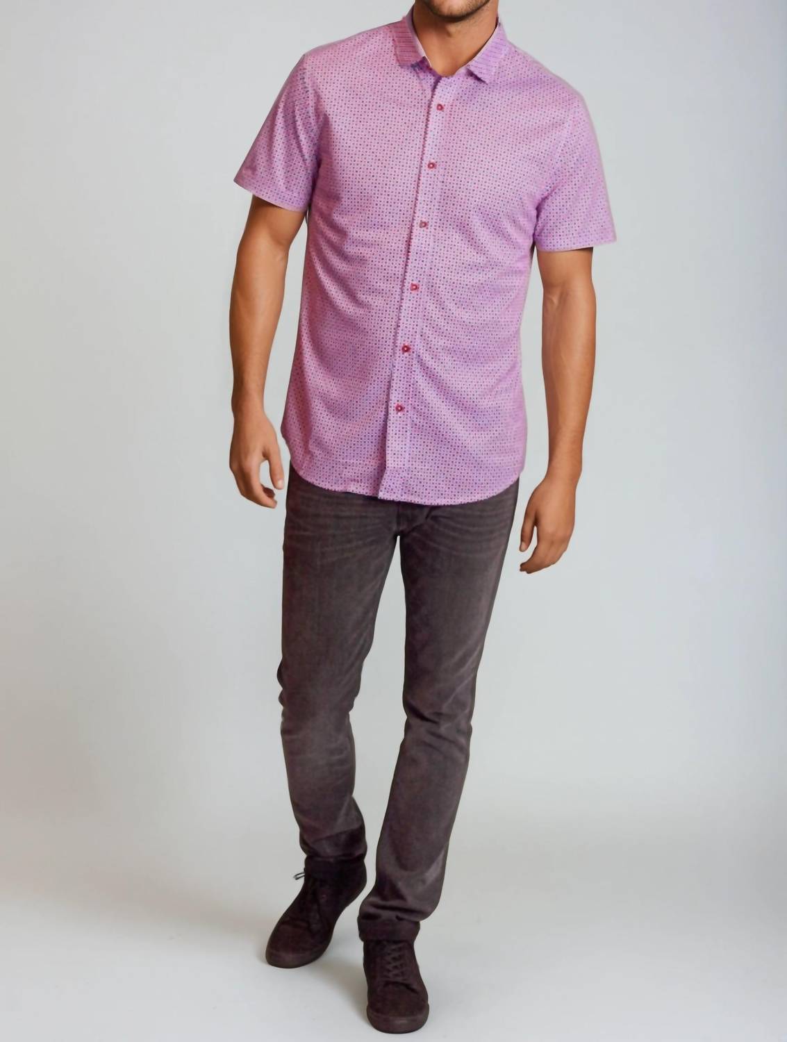 Experience unparalleled comfort and style with the Buki Jagger Short Sleeve Tech Shirt in vibrant Berry. This women's geometric-patterned dress shirt features a short sleeve design and a crisp two-piece collar, perfect for holiday parties. Crafted from Buki Core Tech™ fabric, it offers remarkable breathability, stretch, and cooling comfort, augmented by its wrinkle-resistant and quick-dry properties. Embrace the future of fashion with this refined, untucked look that transitions seamlessly from work to weekend.