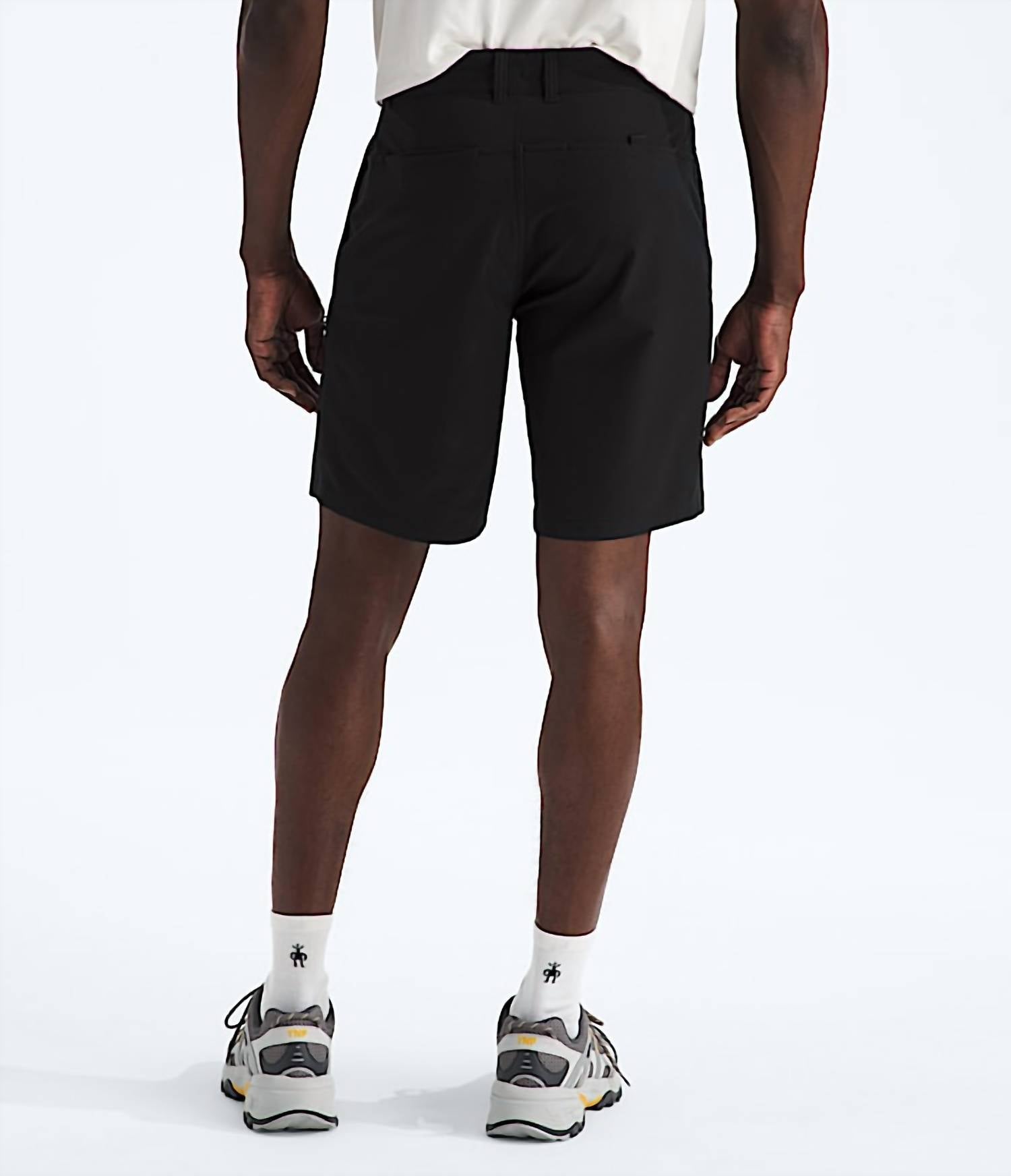 Meet the Rolling Sun Packable Short by The North Face, the ultimate travel companion for adventurous men. Crafted with 90% polyester and 10% elastane, these black solid shorts offer enhanced moisture-wicking and faster evaporation thanks to FlashDry™ technology and dobby fabric. With a zippered fly and button closure, these shorts provide both functionality and comfort, featuring an internal draw cord, two slash hand pockets, and two back pockets with hook-and-loop closures. Care for them is easy as they're machine washable, making them ideal for summer vacations.