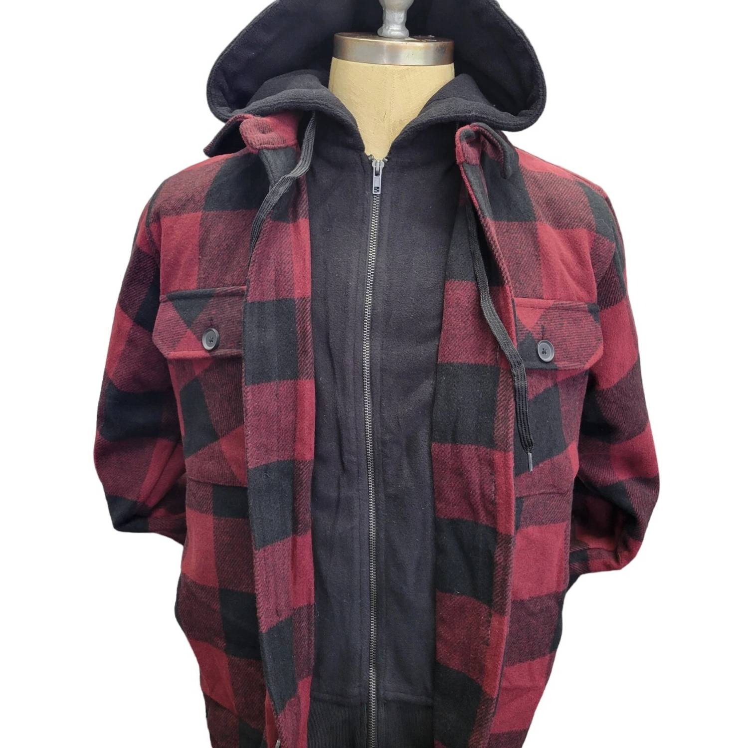 Introducing the Men's Sherpa Plaid Jacket by Hedge, a stylish and sustainable choice for your winter wardrobe. This long sleeve jacket, designed in a classic red and black plaid print, features a comfortable hood and warm sherpa lining. Crafted from a blend of 75% polyester, 6% acrylic, 6% viscose, 5% nylon, 5% wool, and 3% other fibers, it boasts both comfort and durability. Closure: Button closure, includes a spare button. This piece exemplifies Conscious style with recycled fibers and convenient pockets for added functionality.
