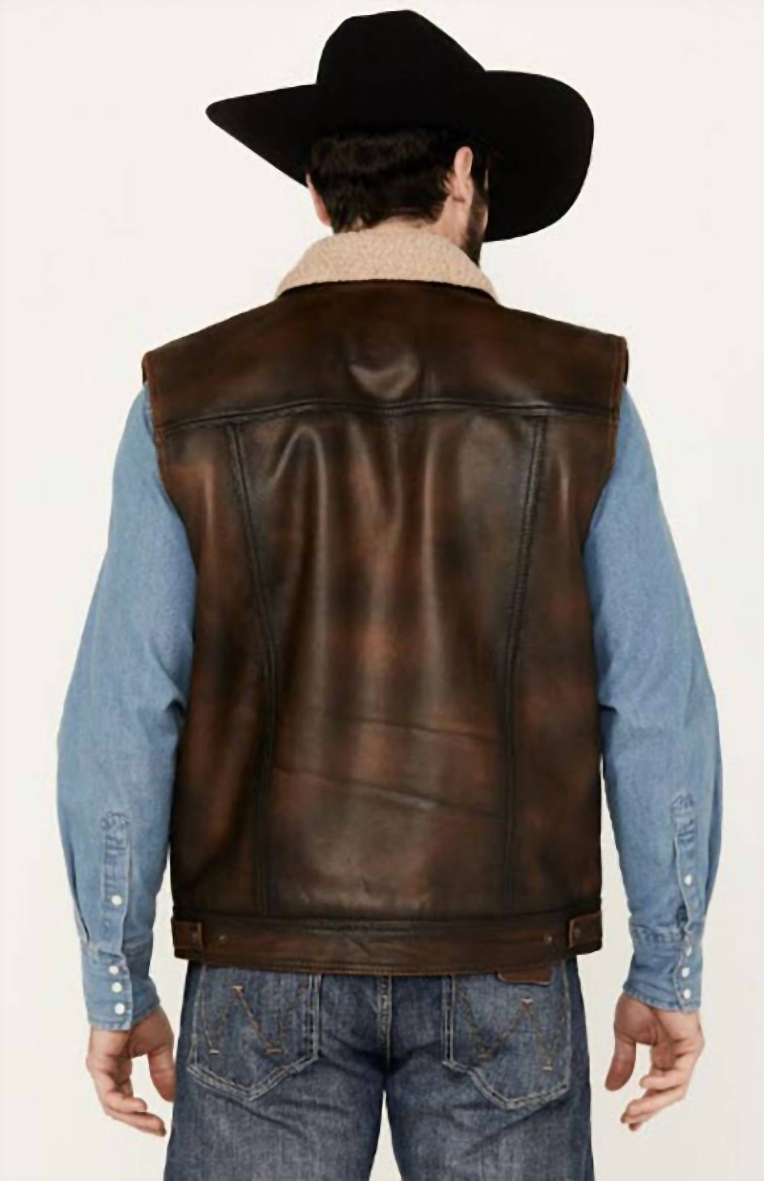 The Cripple Creek Sherpa Lined Nappa Lamb Leather Men's Vest in antique brown is a stylish addition to any man's wardrobe. This sleeveless vest is crafted from premium leather with a cozy Sherpa lining, providing both style and warmth. Featuring two single-point chest flap pockets and adjustable waist with button closures, it blends classic and contemporary design effortlessly. Although its care requires professional leather cleaning, this solid Western vest ensures you remain on trend and comfortable during winter.